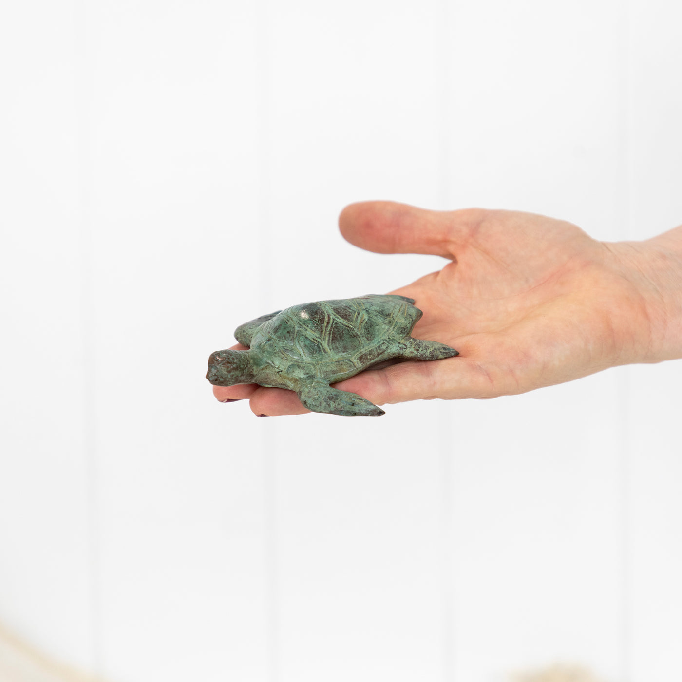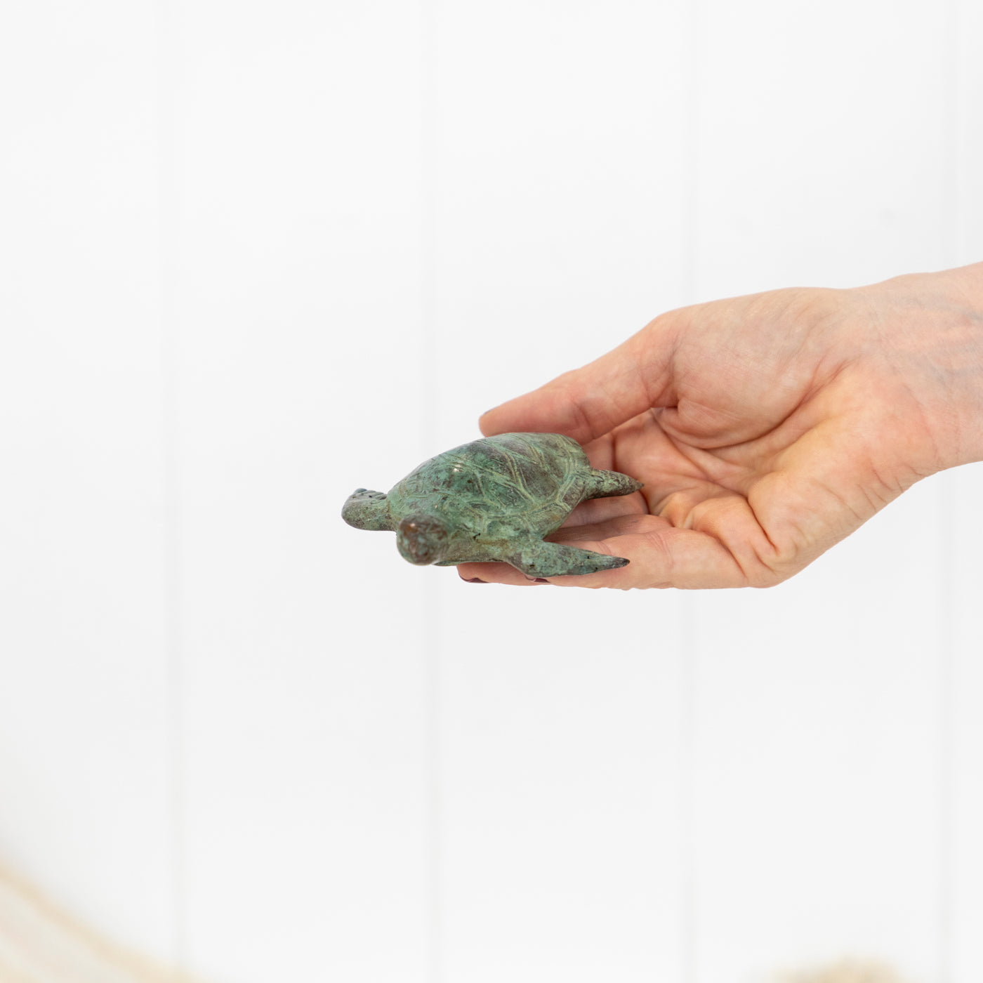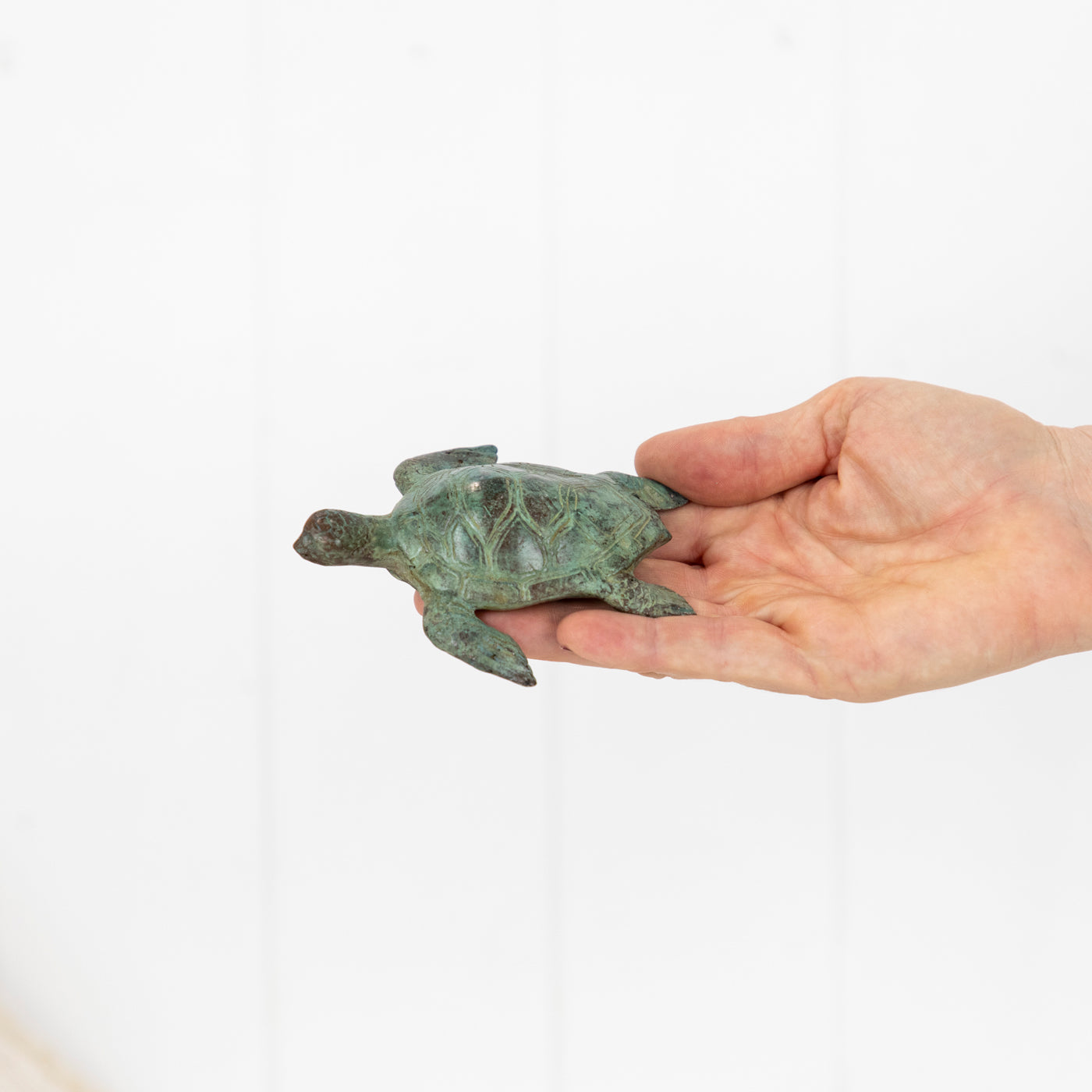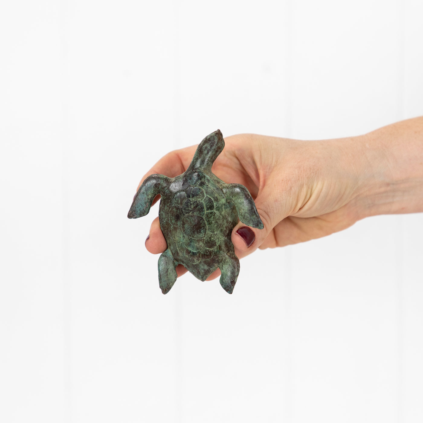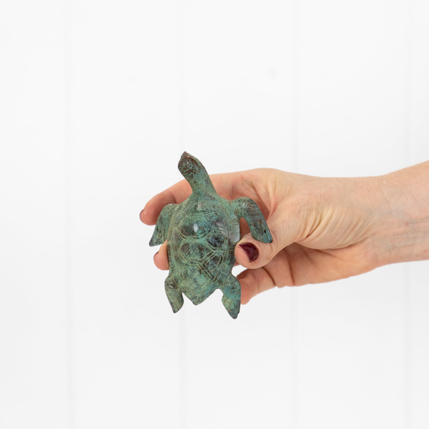 Beautifully detailed, the brass has been aged giving it a green patina. It would make a fabulous addition a coffee table or shelf.