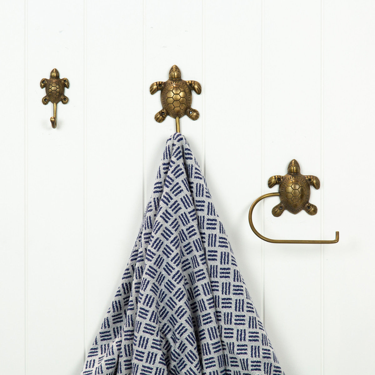 This toilet roll holder is made from brass, and has a turtle motif.