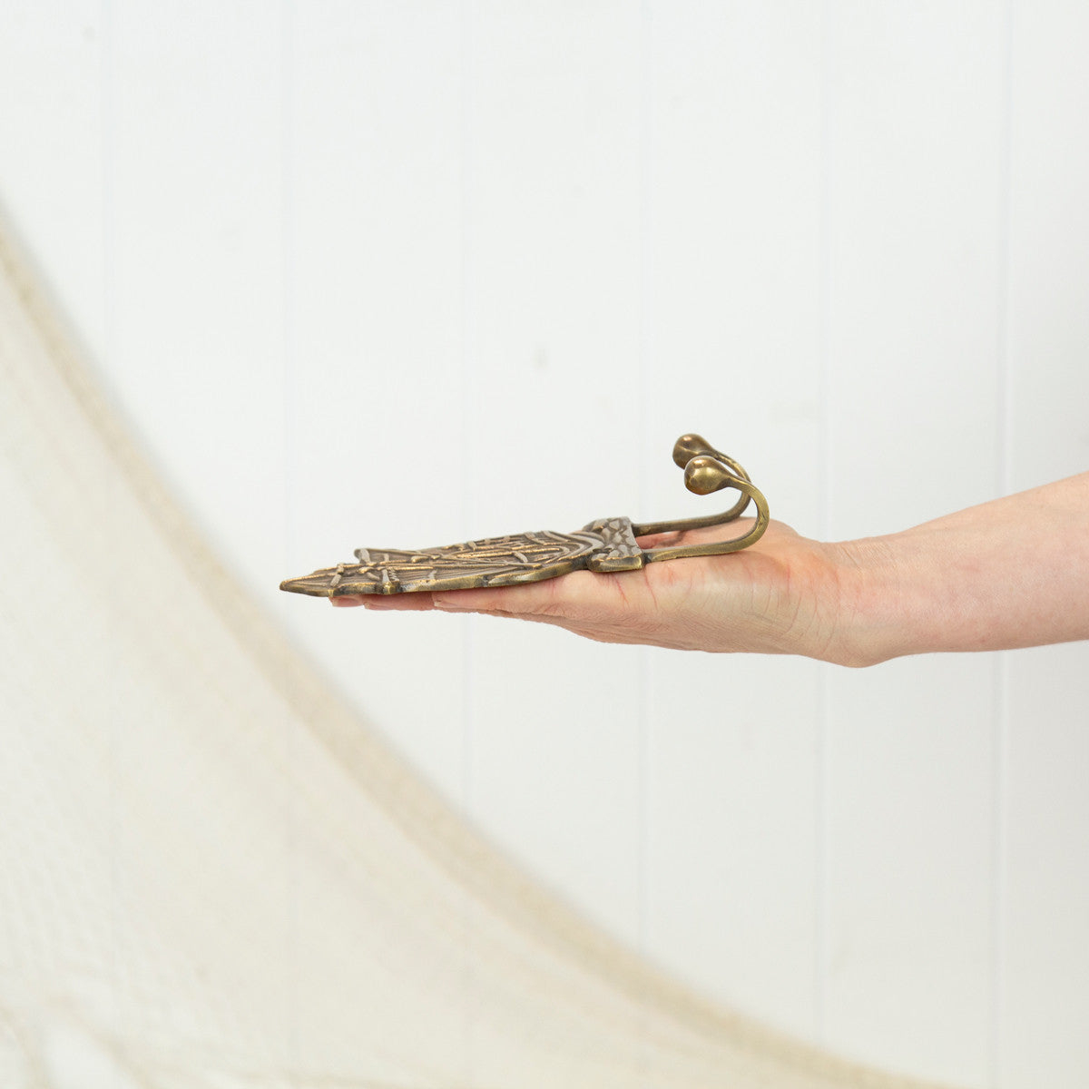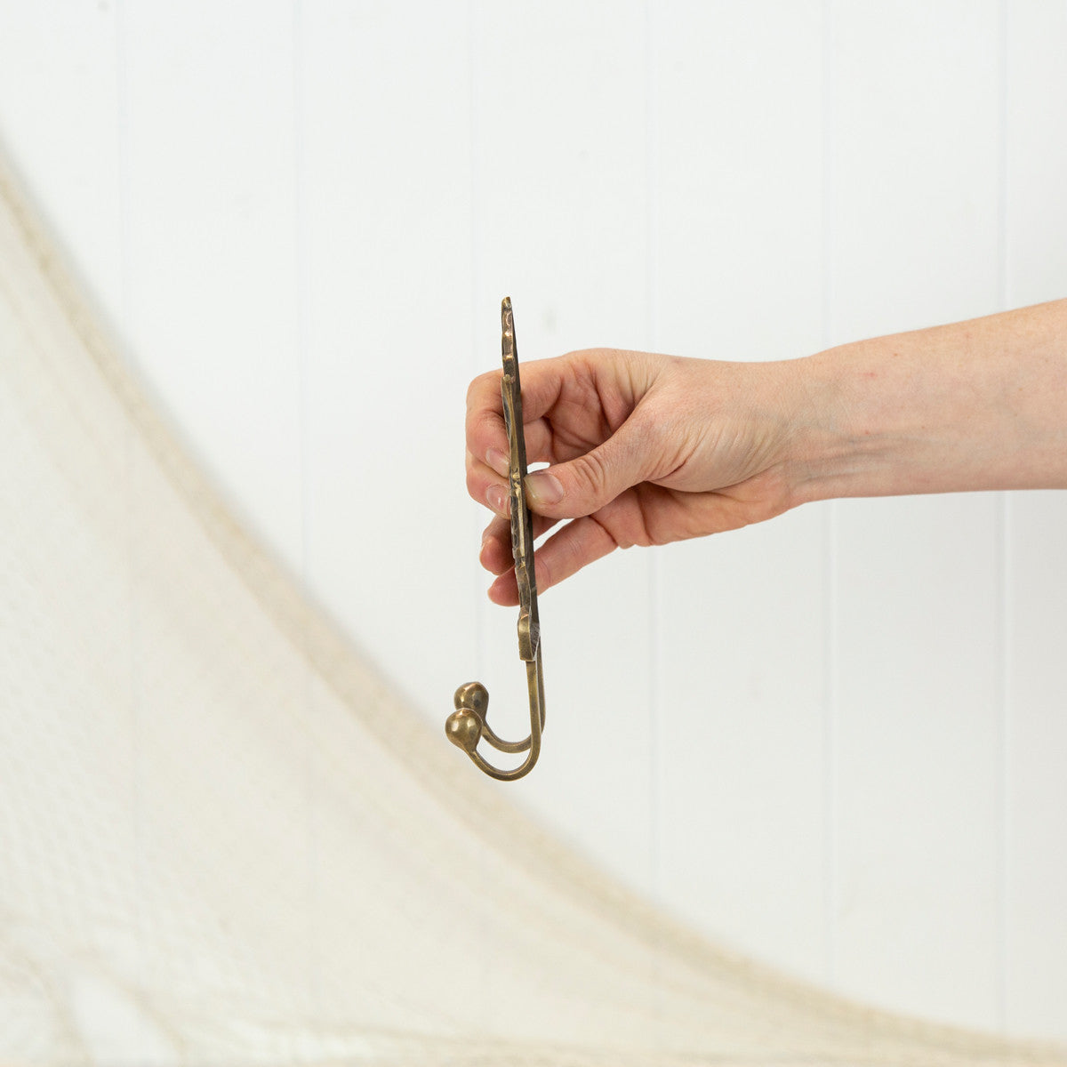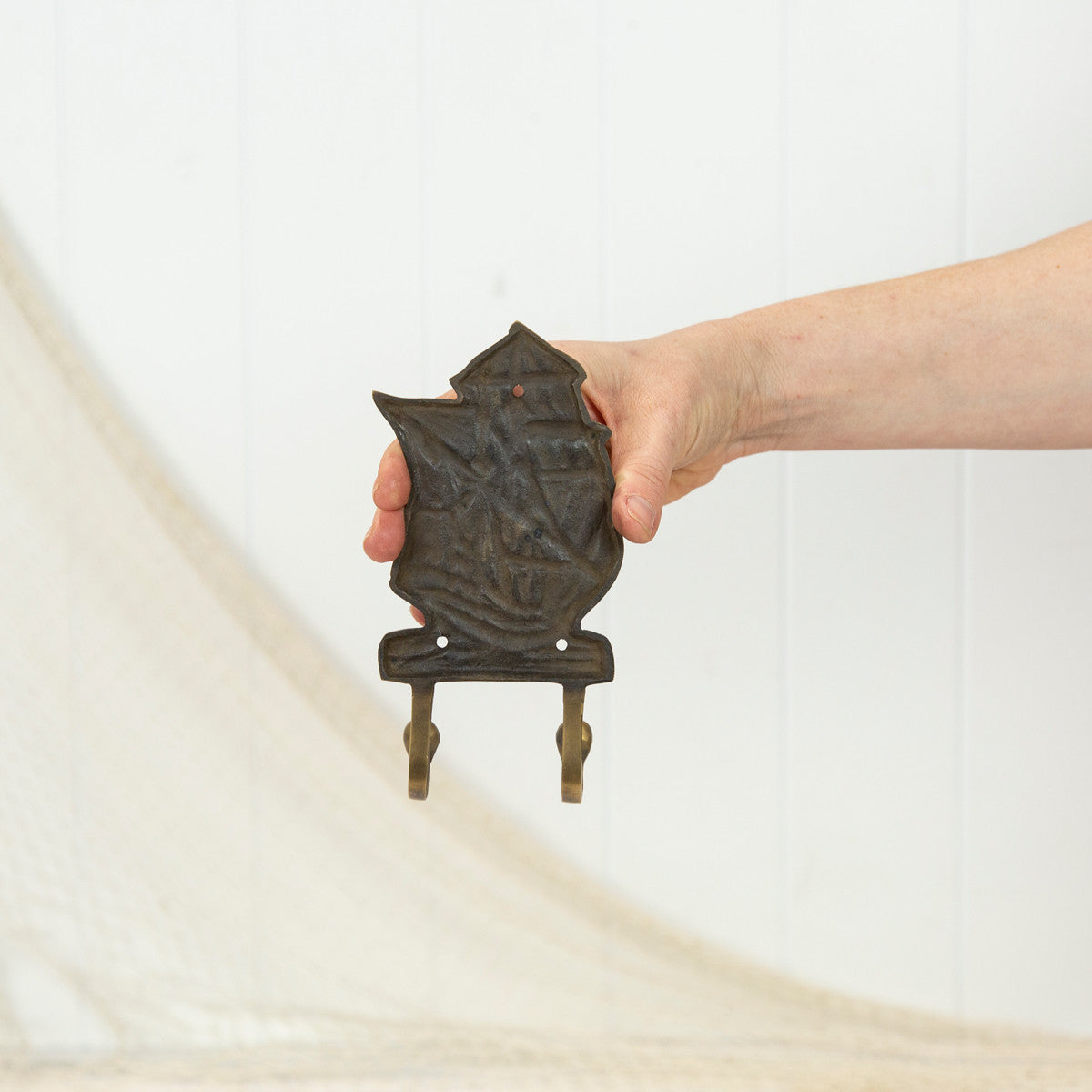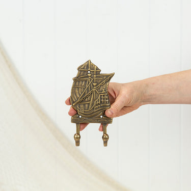This hook is made new from brass in the shape of a galleon ship at sea.