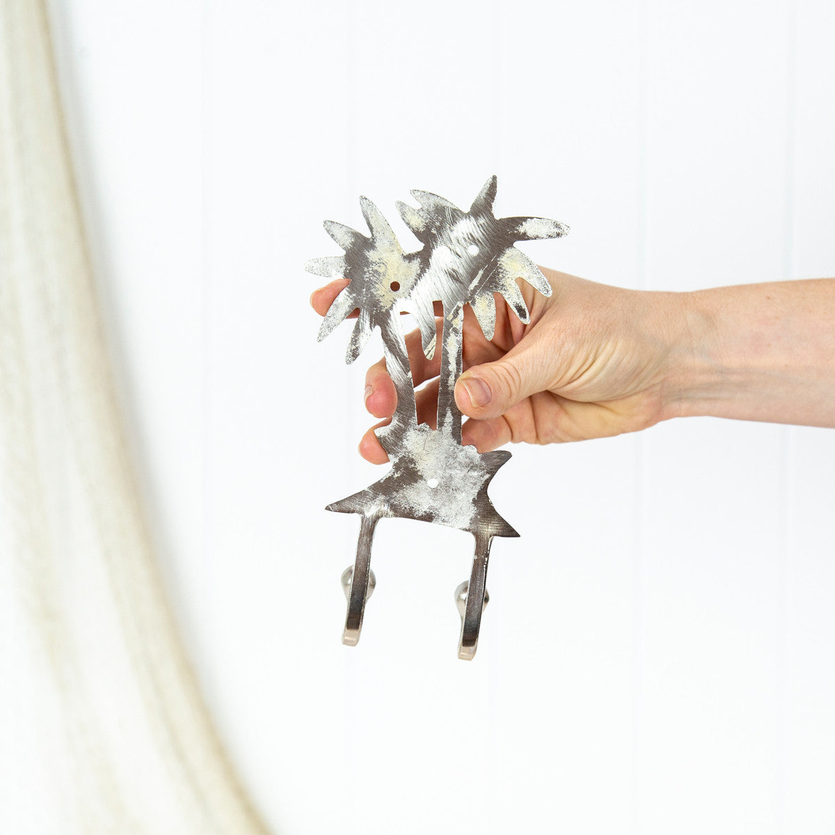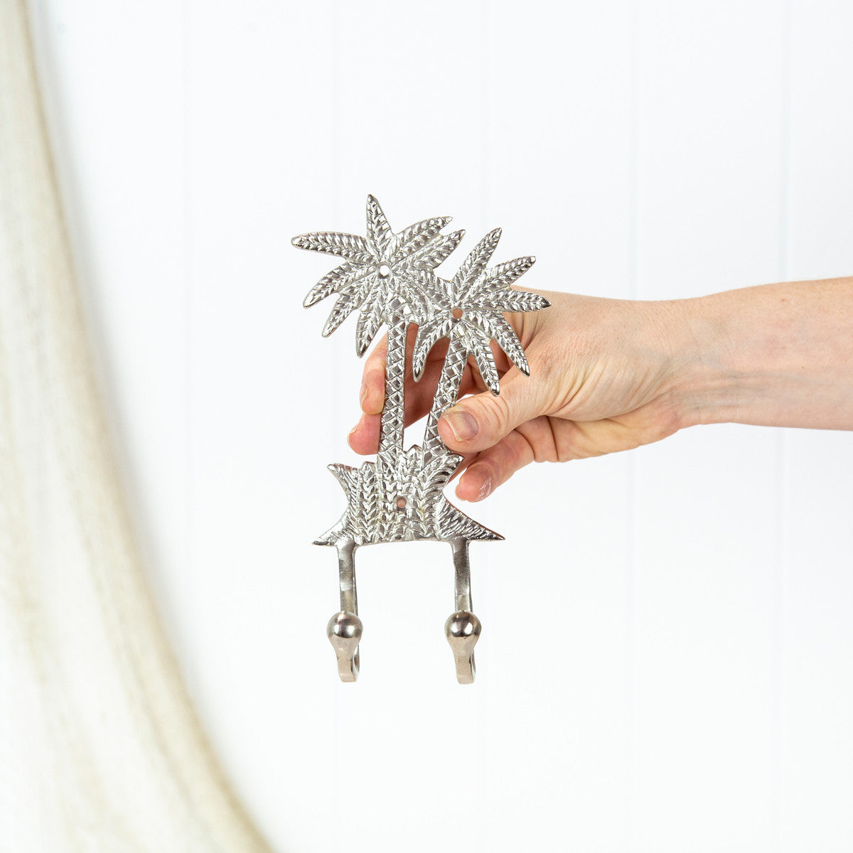 This hook is made from brass that has been given a chrome finish. It has two palm trees, and two hooks.