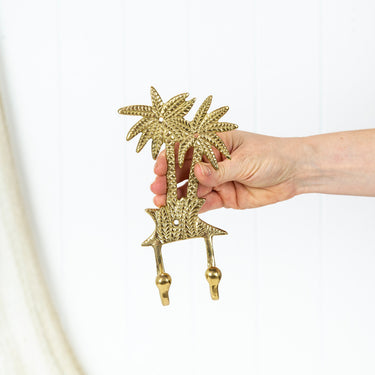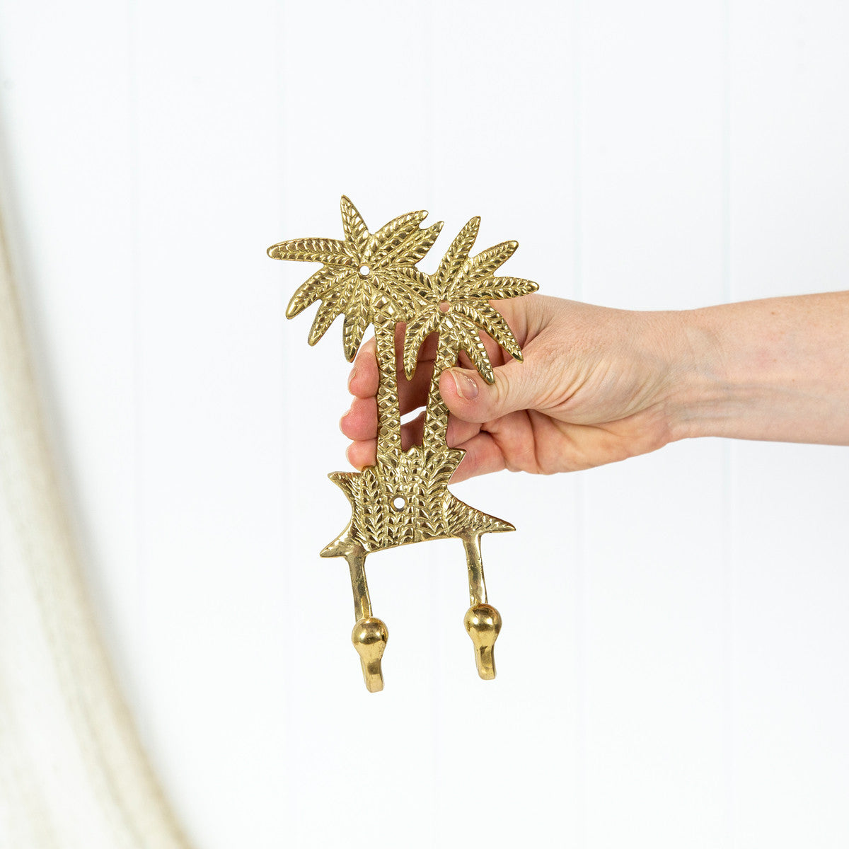 This hook is made from shiny brass and has two palm trees, and two hooks.