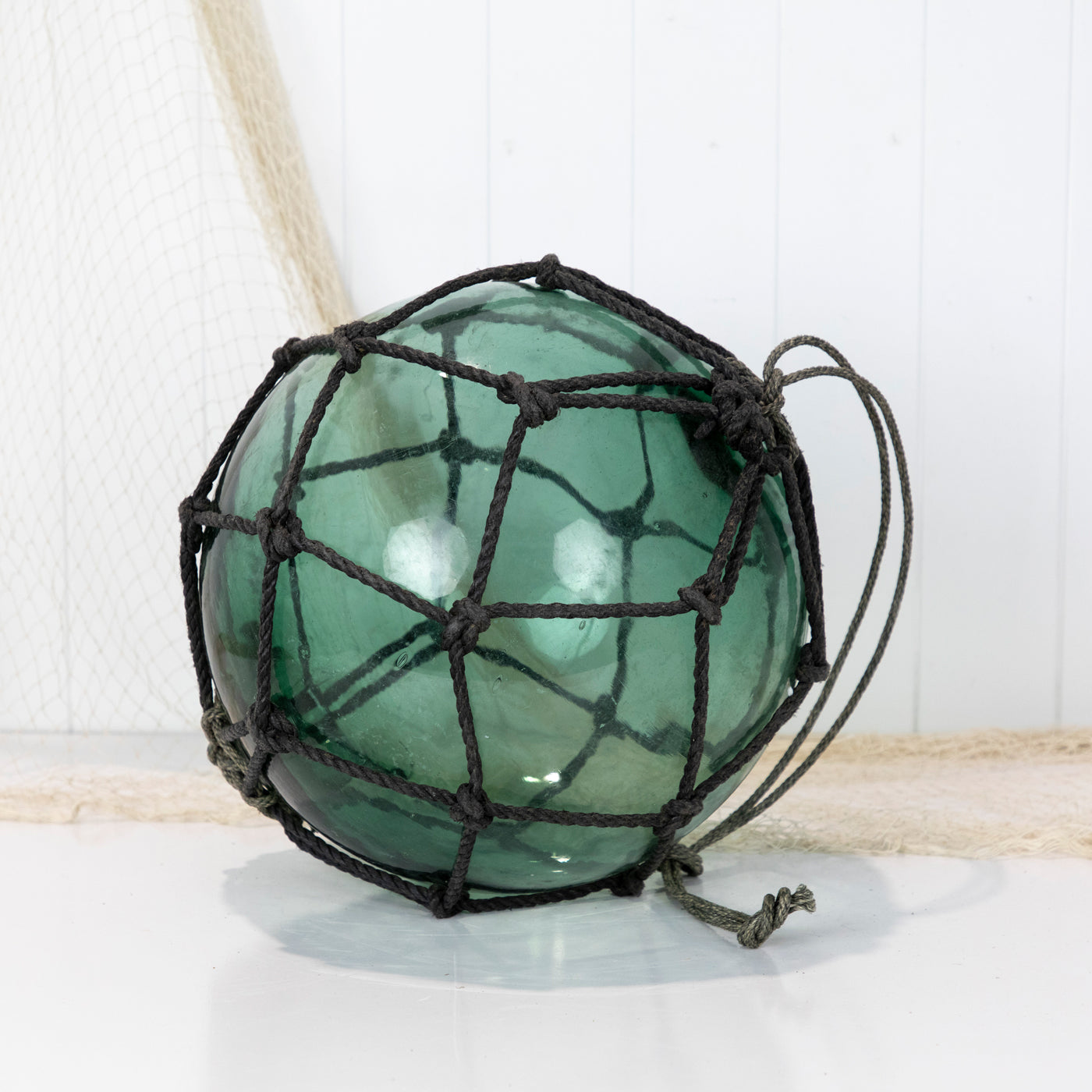This beautiful old 14" Japanese longline glass float is a stunning colour with grey netting and a maker's mark.