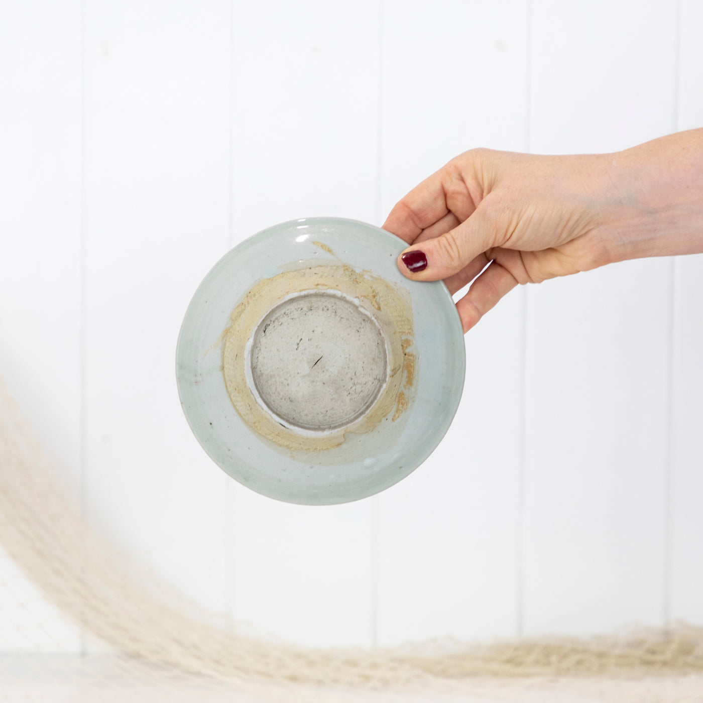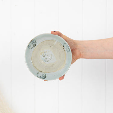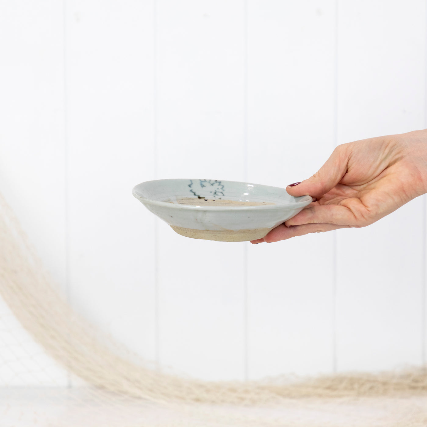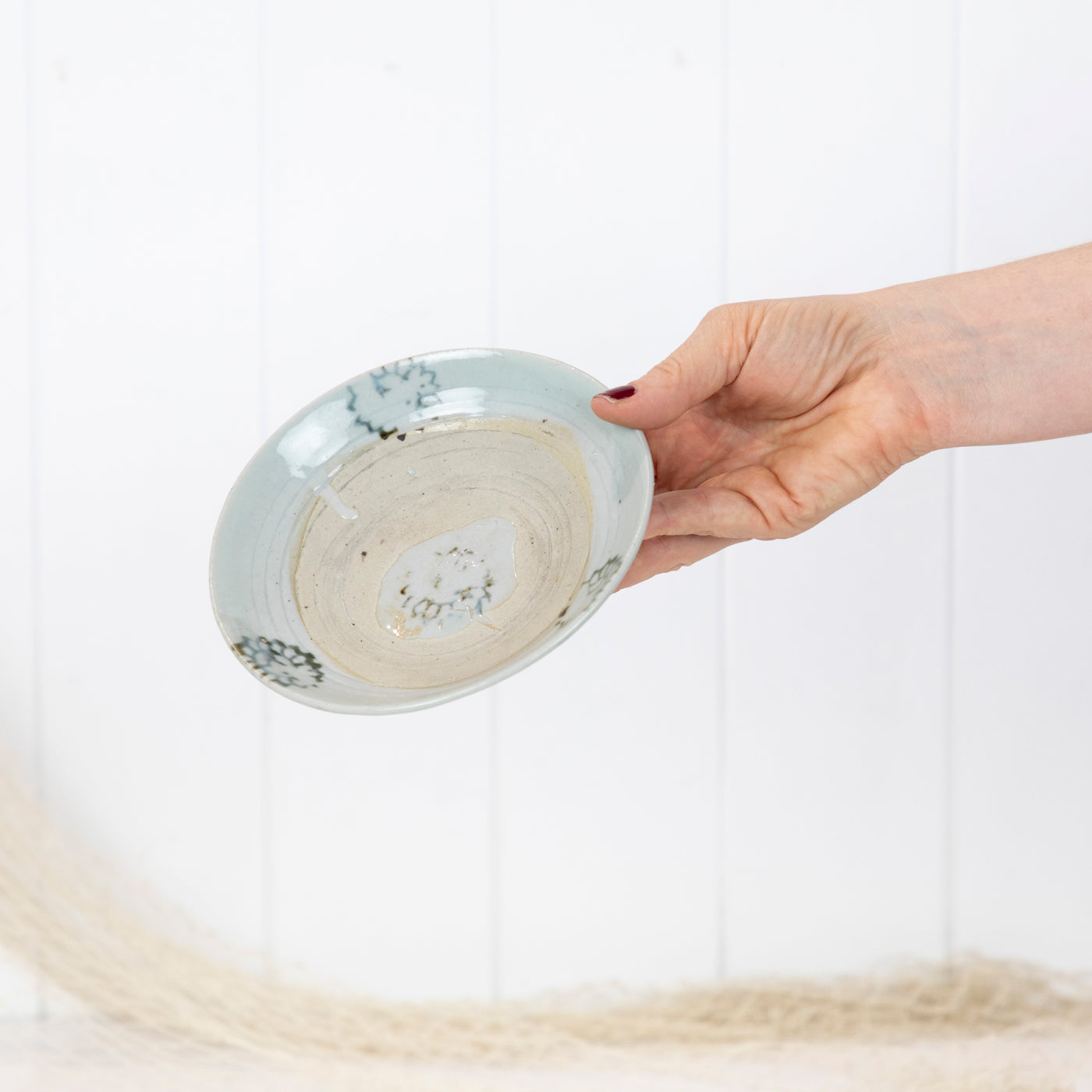 The dish is a soft blue/grey with a darker blue painted design. Some pitting and crazing can be seen as you would expect with a piece of this age.