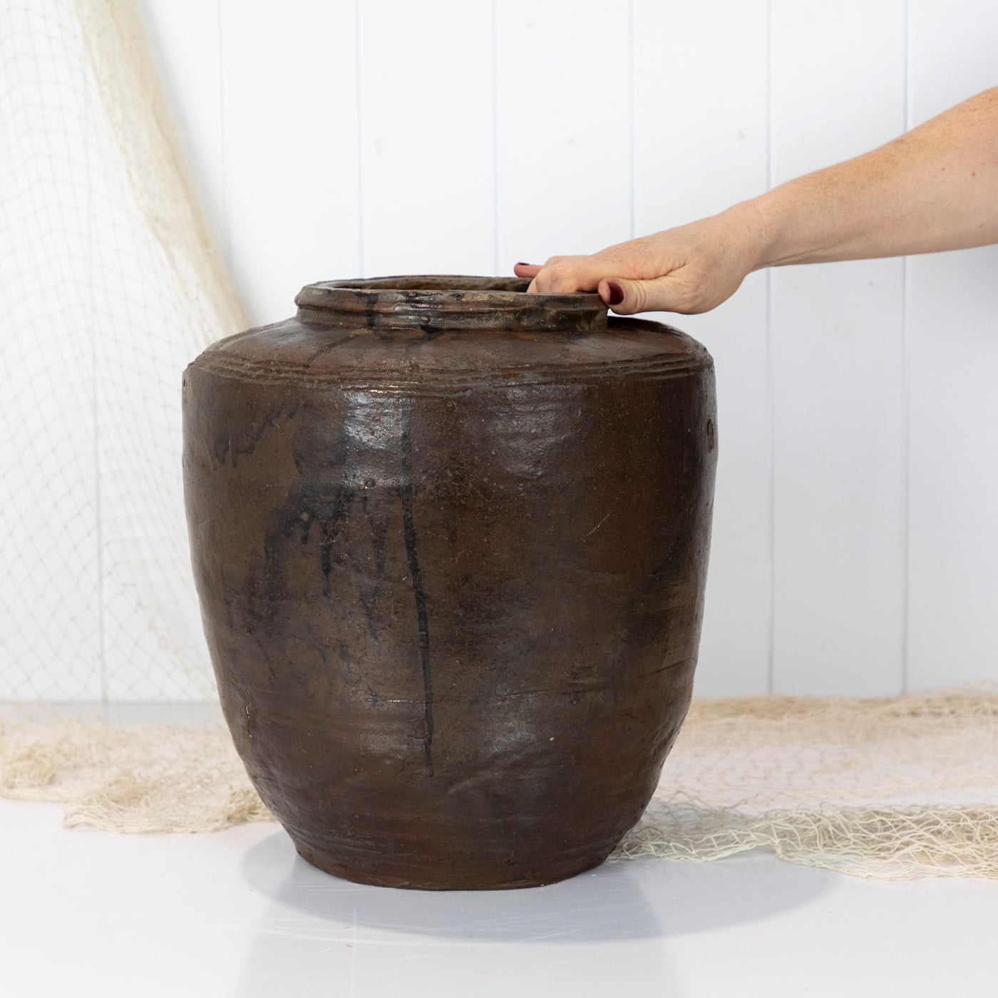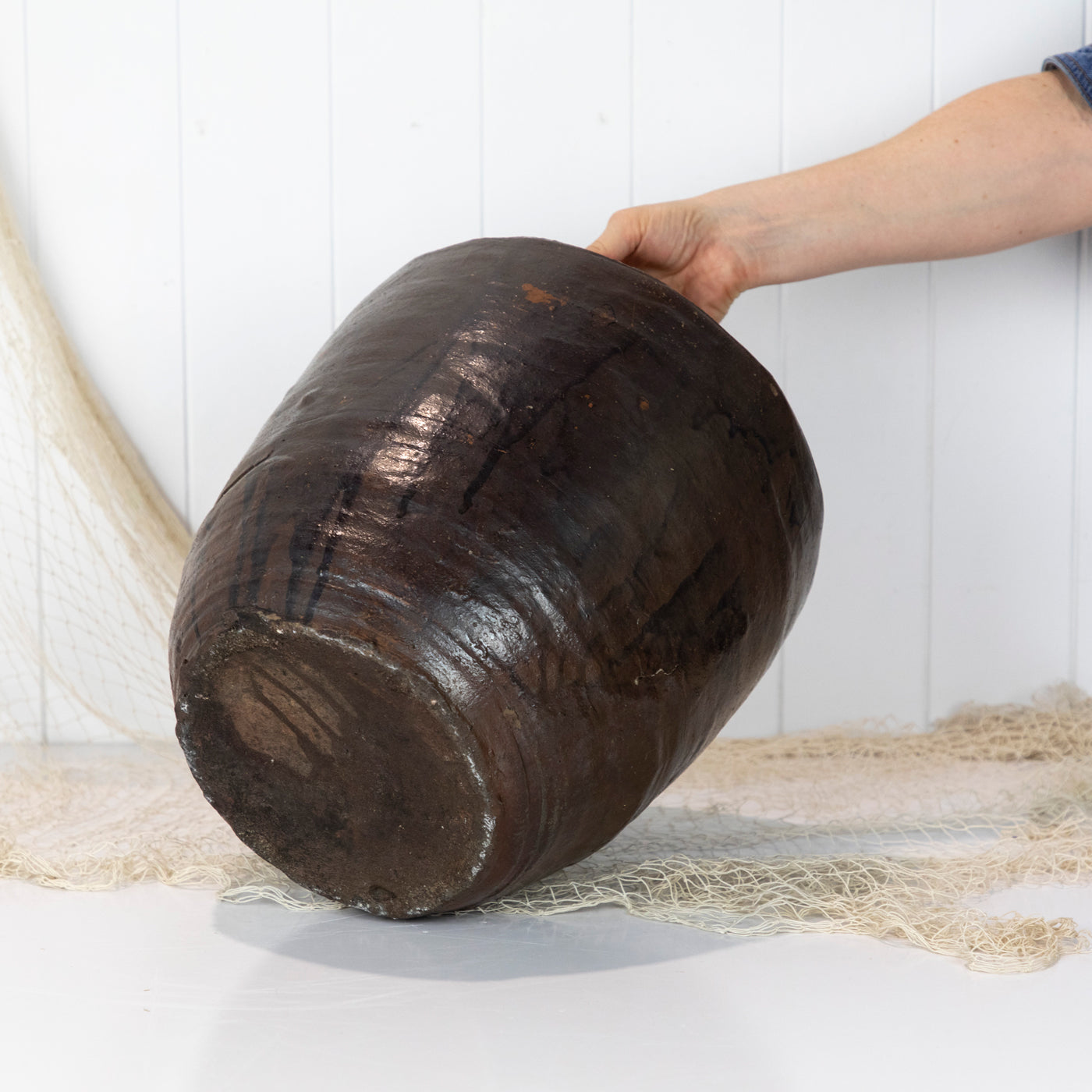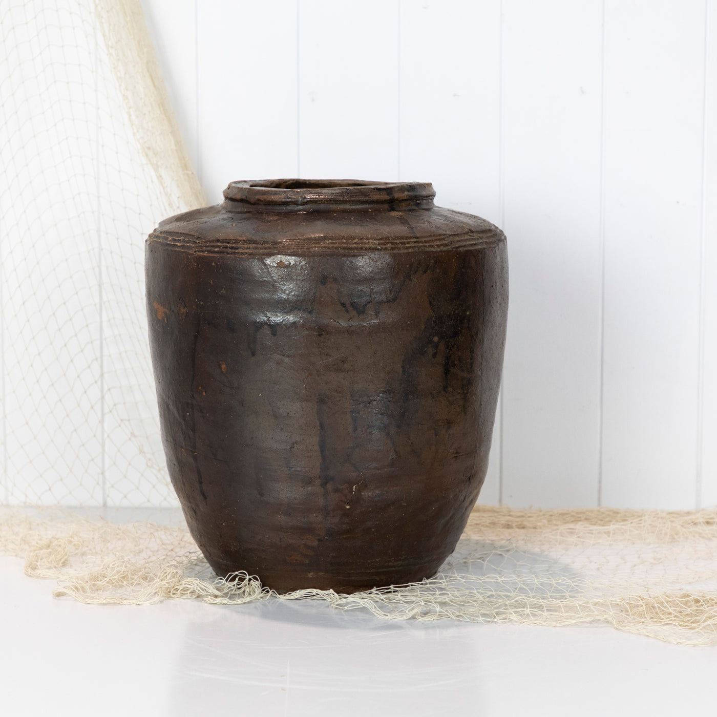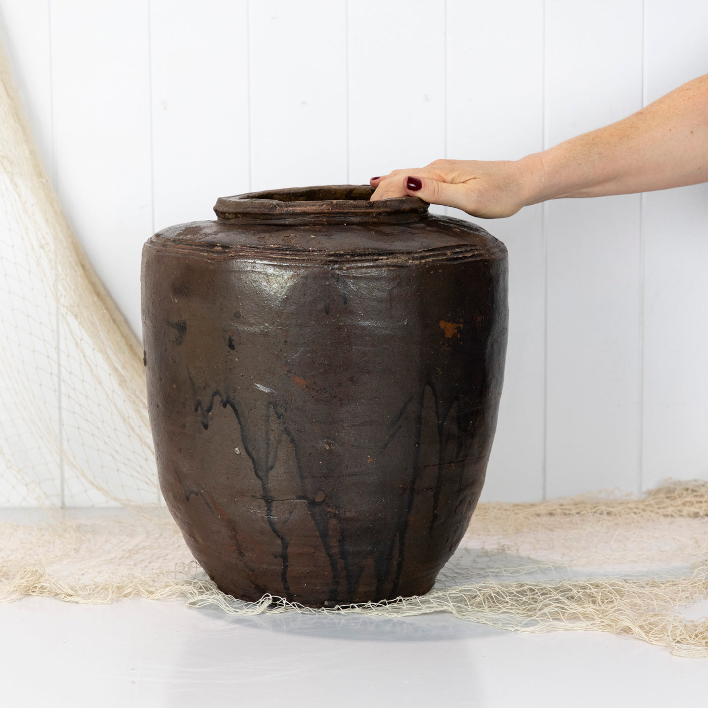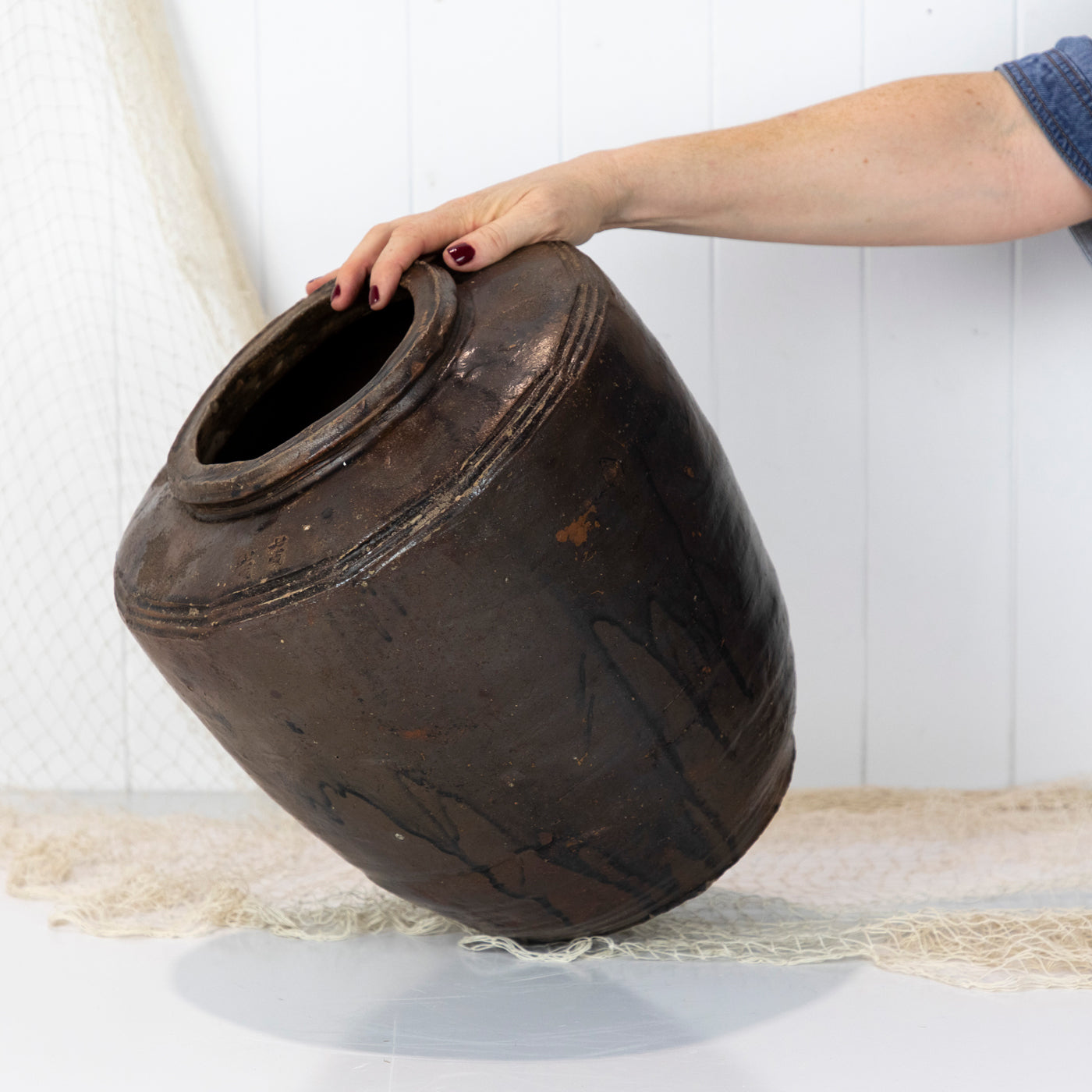 Used to carry goods for trade, it has a glossy dark brown glaze and irregular, handcrafted shape. It would make a gorgeous statement piece.