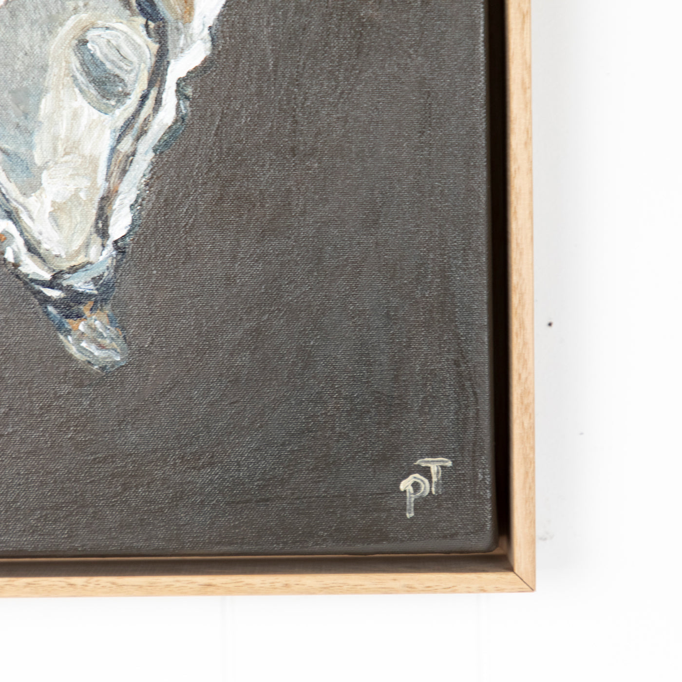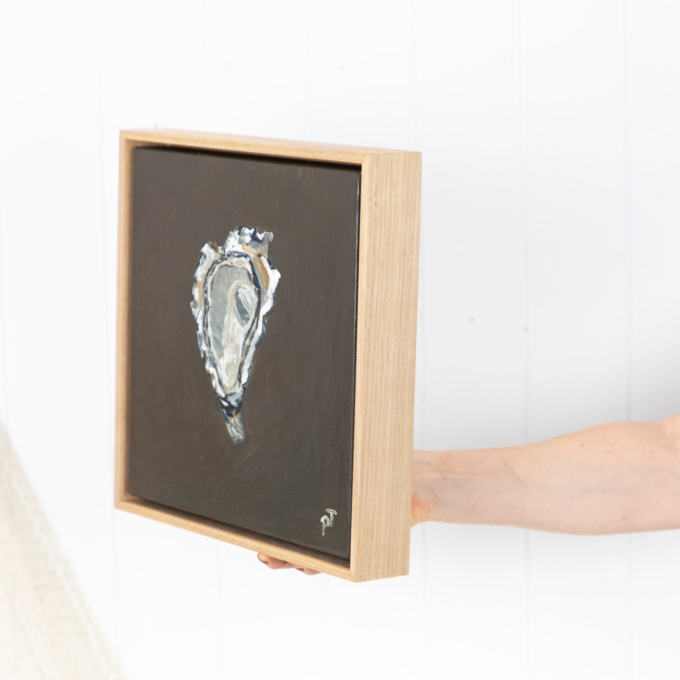 Featuring an open oyster on a deep brown background, it has been beautifully framed in oak and is ready to hang.
