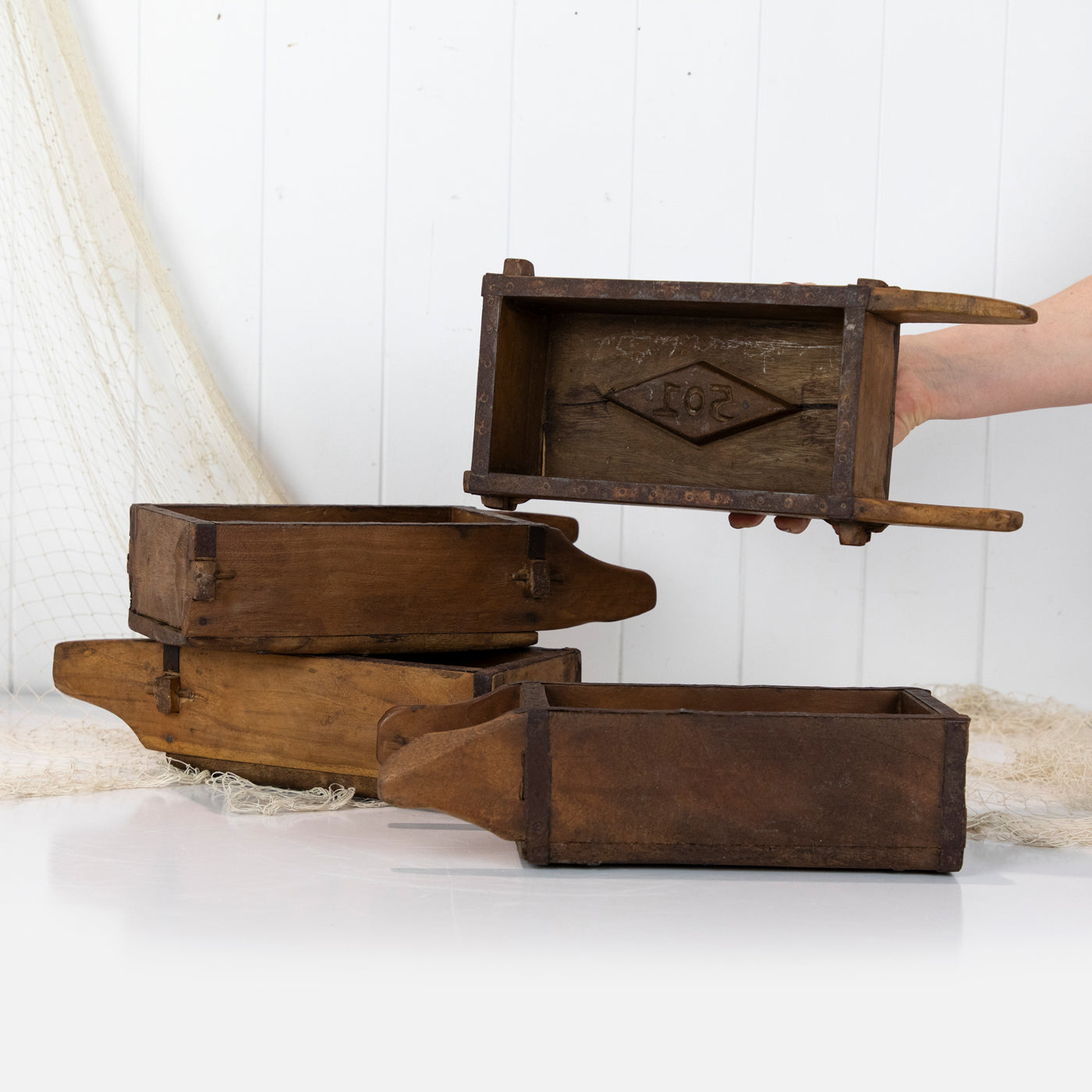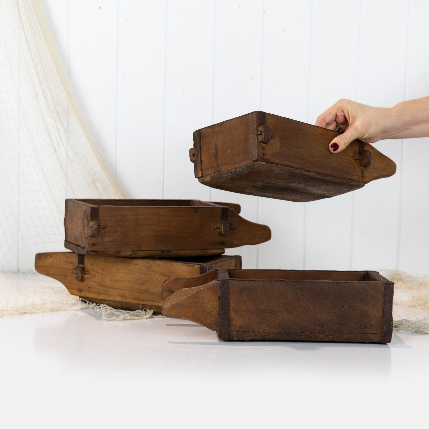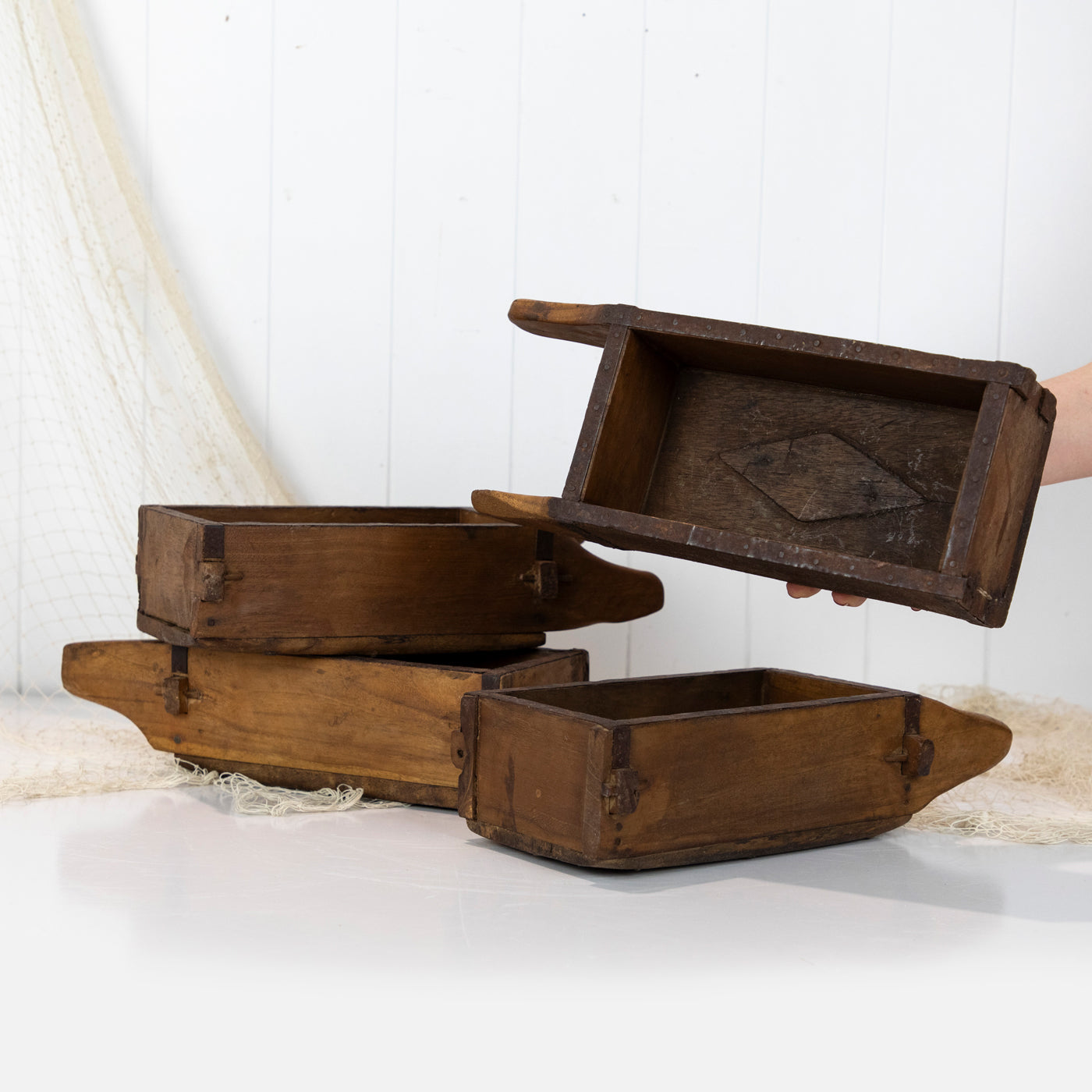 These gorgeous wooden boxes are actually a brick moulds and were used to shape clay or mud into blocks!