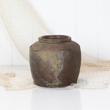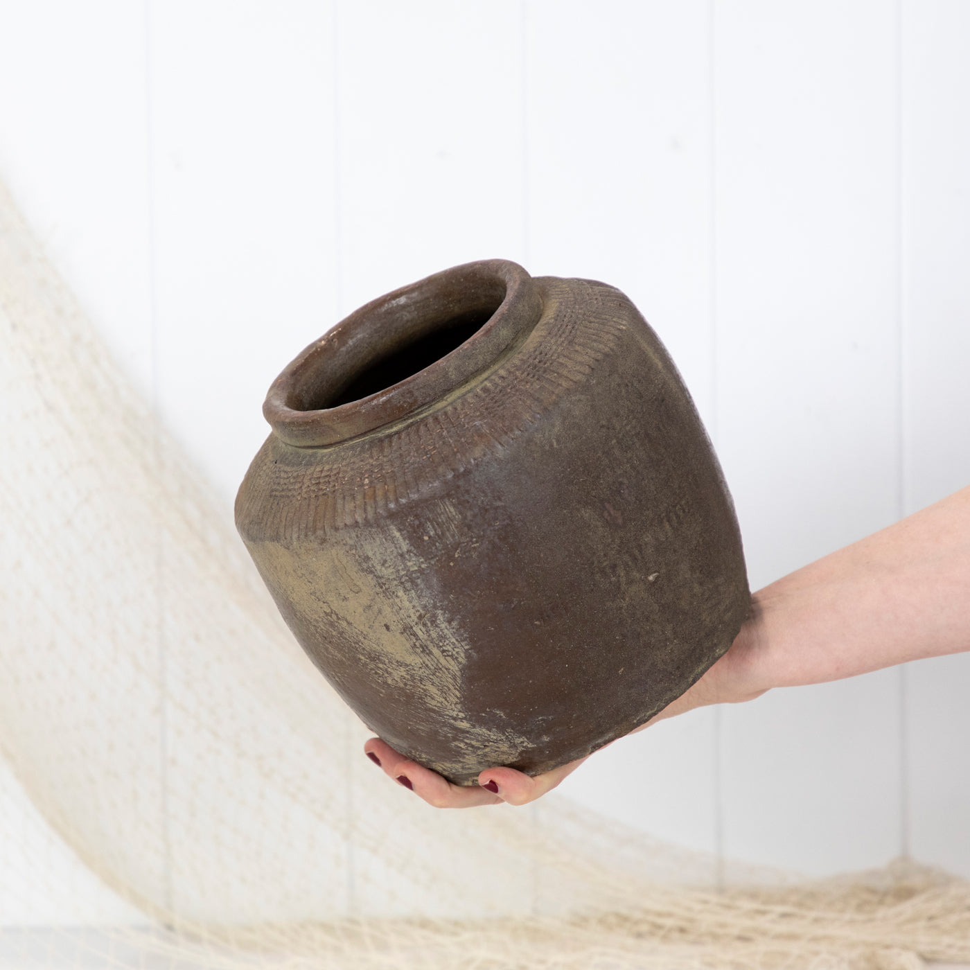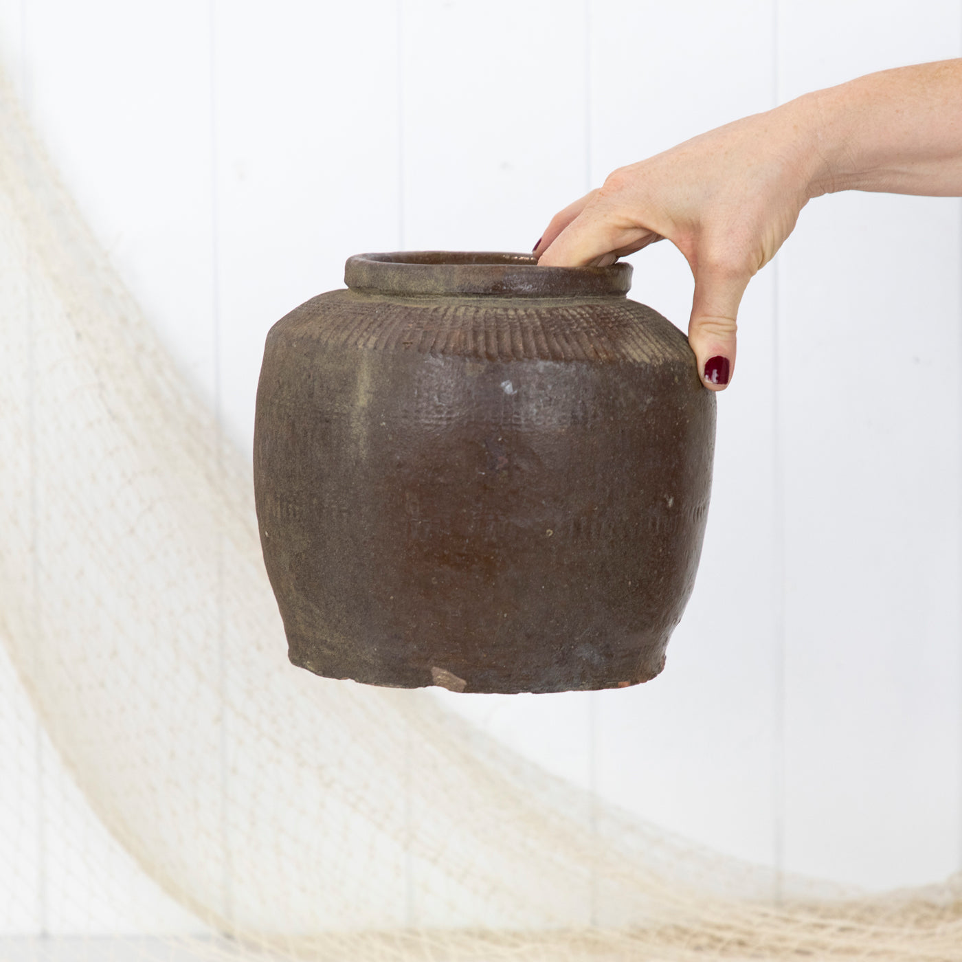 Made of a heavy clay and glazed a brownish green it would be fantastic for utensils or a floral arrangement. Or simply styled by itself!