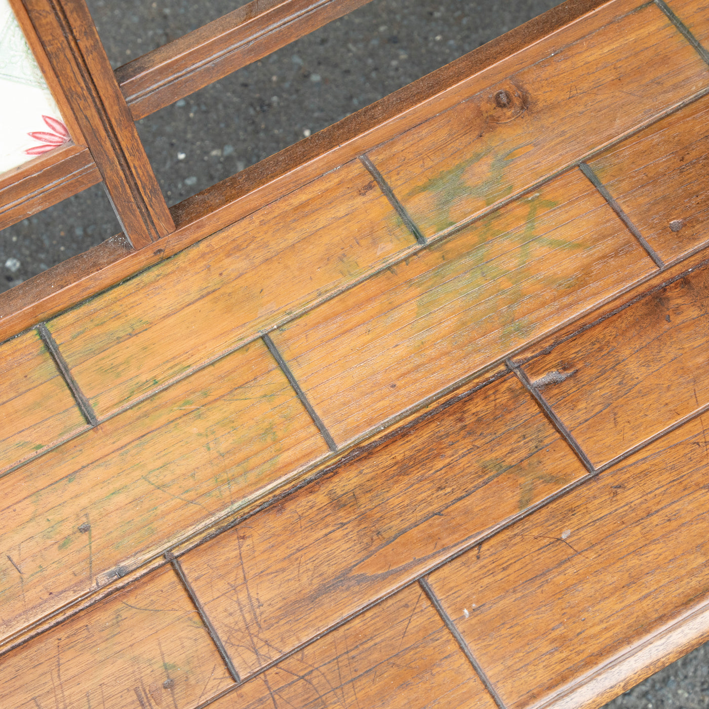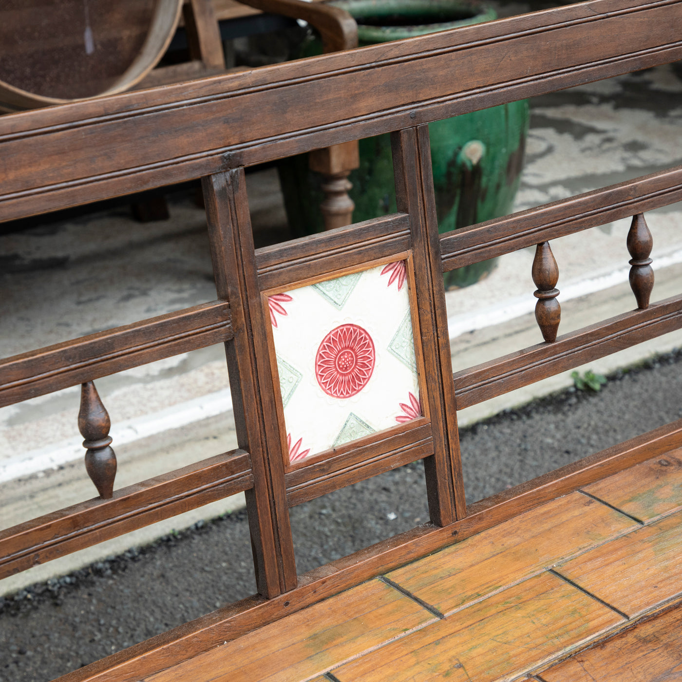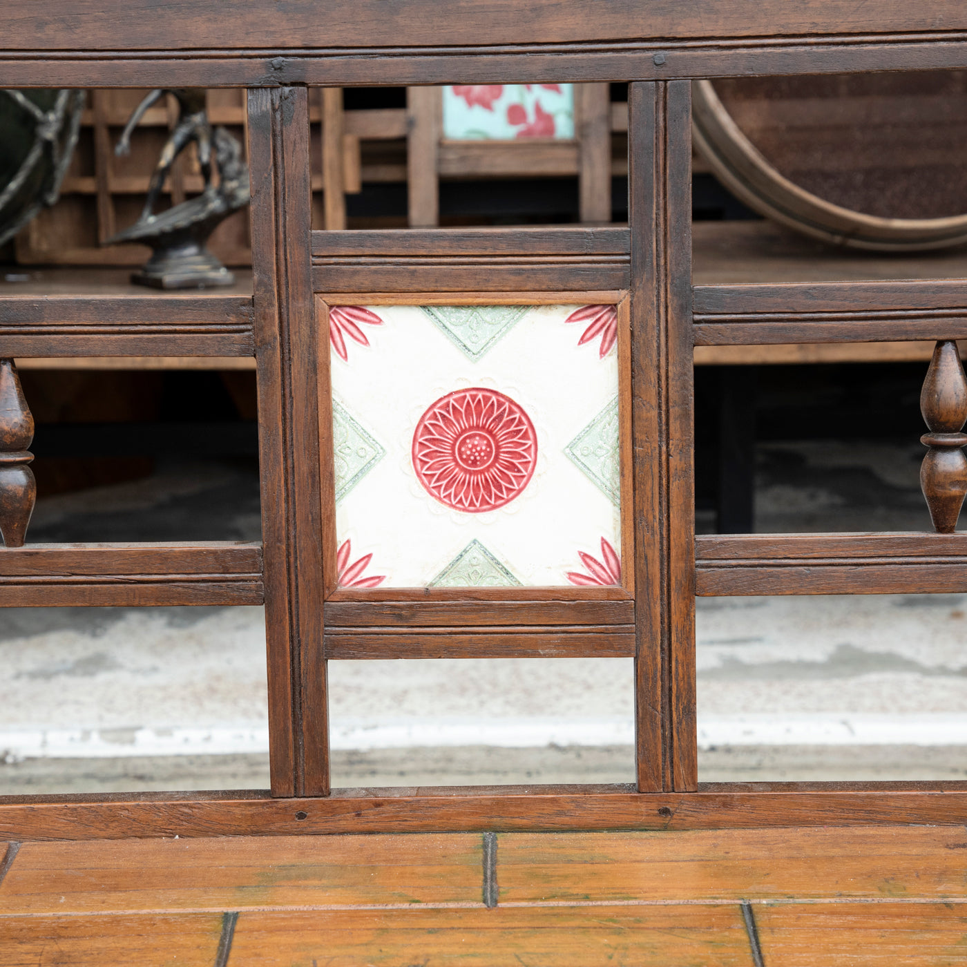 It has turned legs, a 'brick' patterned seat and the most darling hand painted feature tile.