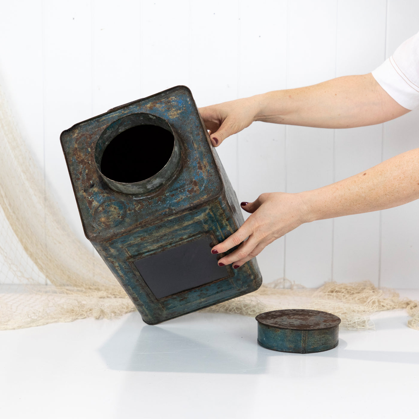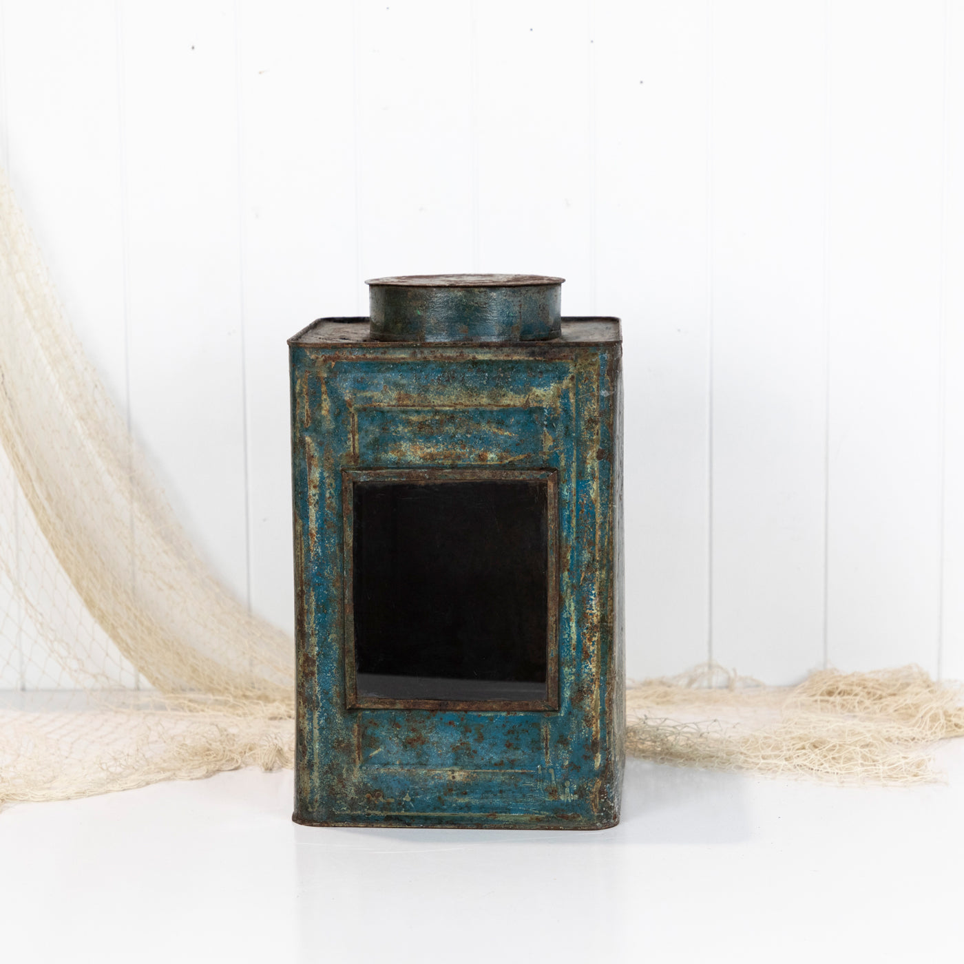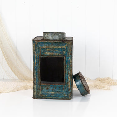 The old rusty metal tin has been given a clear window. Perfect for viewing what's stored inside. These tins look wonderful filled with fairy lights!