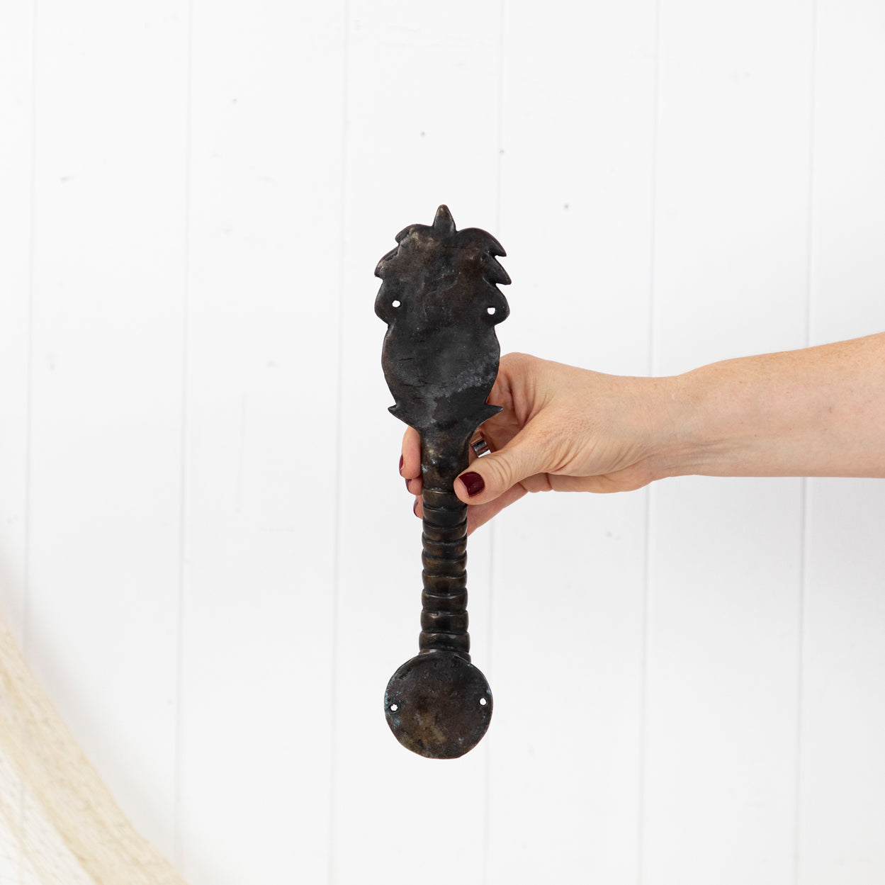 This pair of brass door handles feature a tropical pineapple motif.