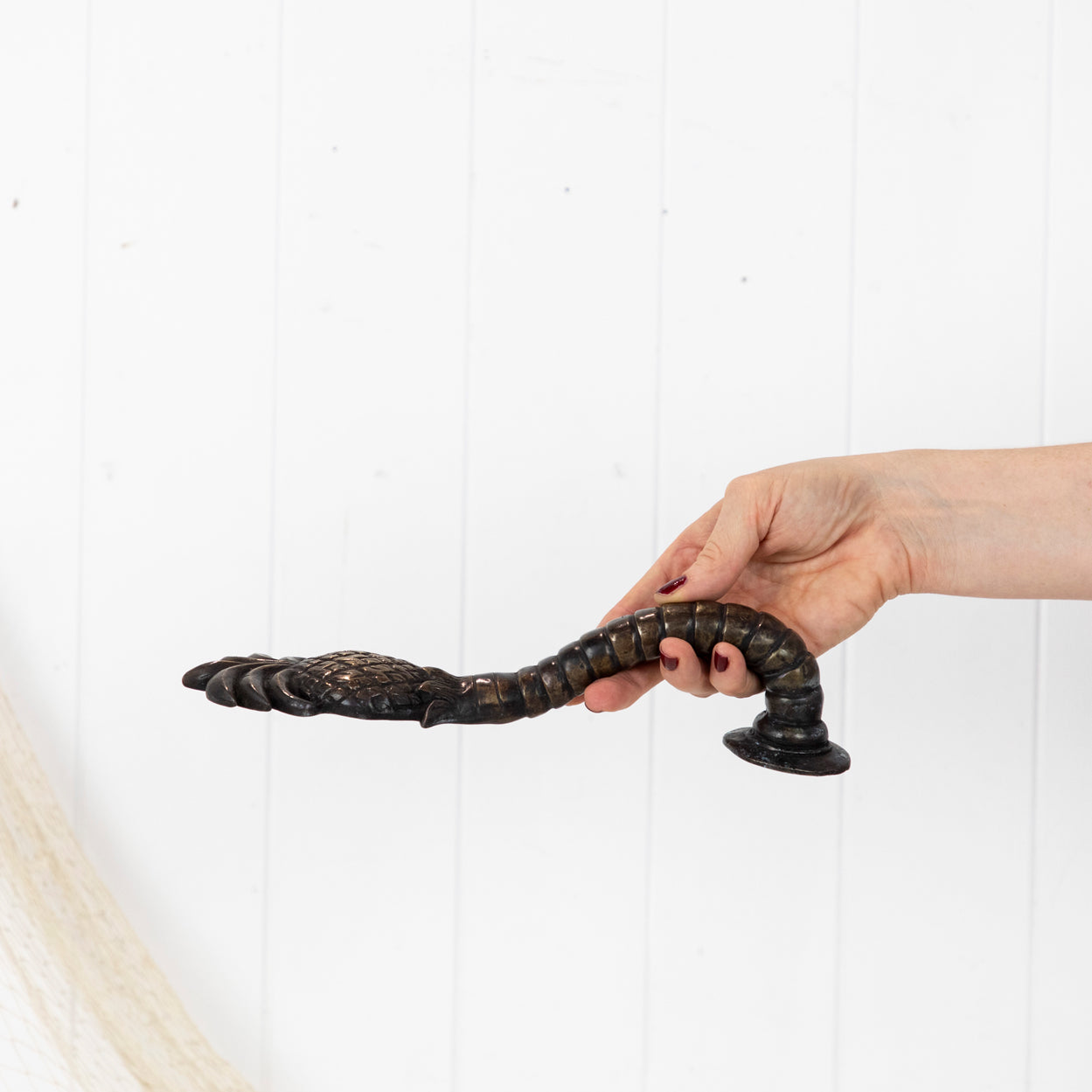 Made from brass it has been aged to a dark finish, with sections polished back to reveal the metals original tone.