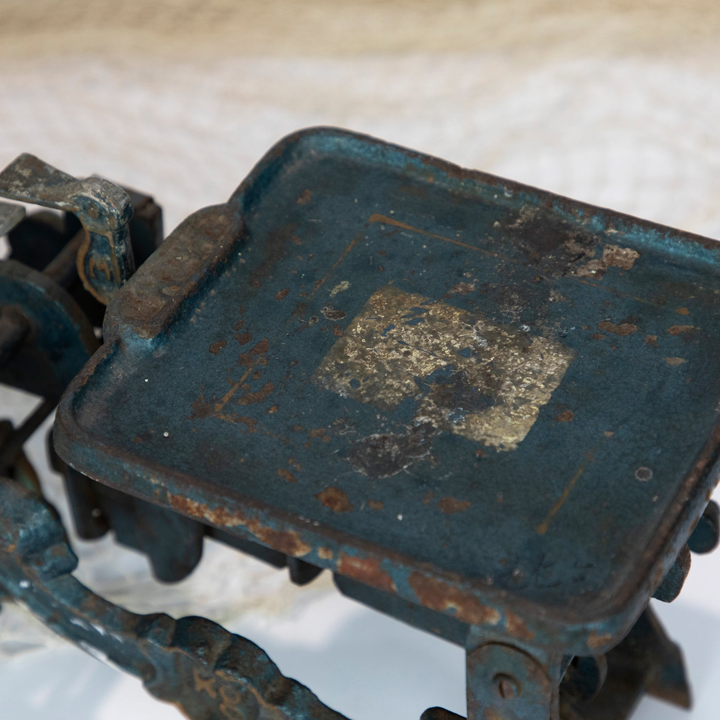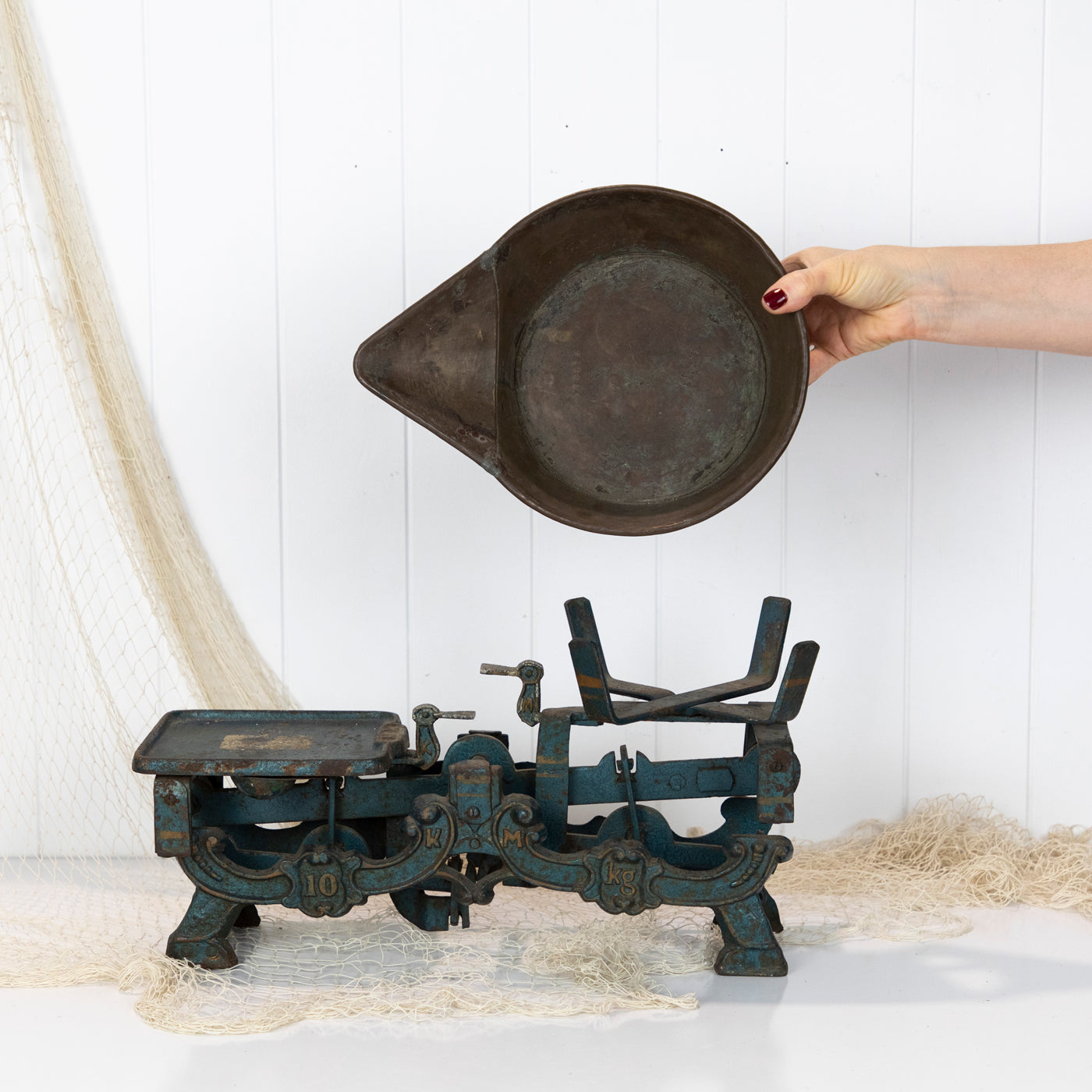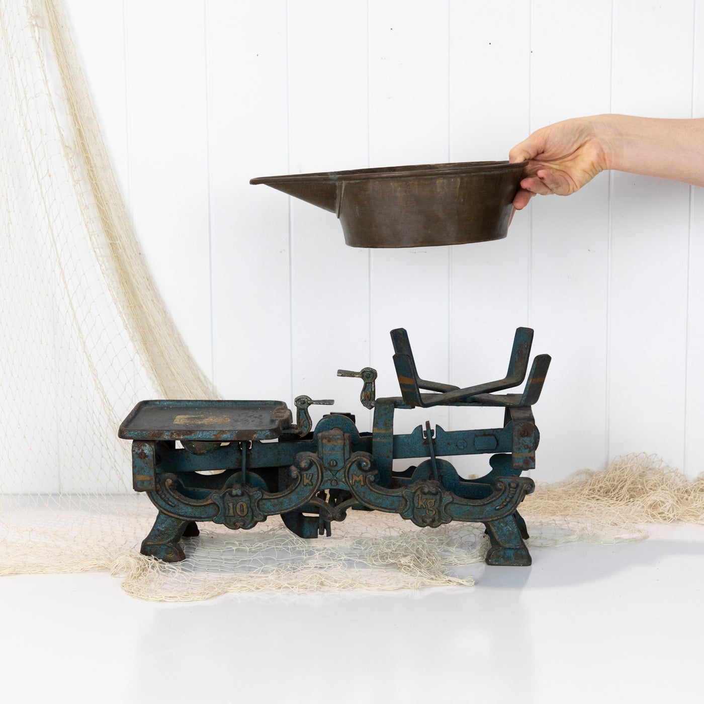 Made with cast iron it has a wonderfully worn blue finish, and the brass bowl has a beautiful patina.