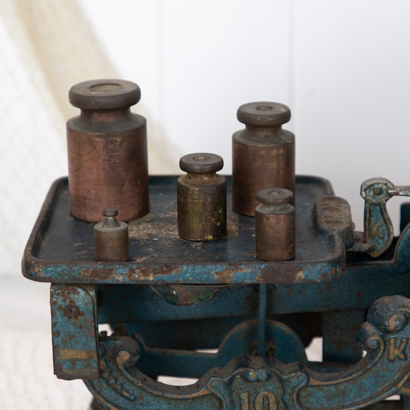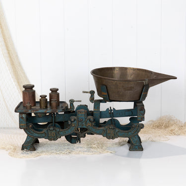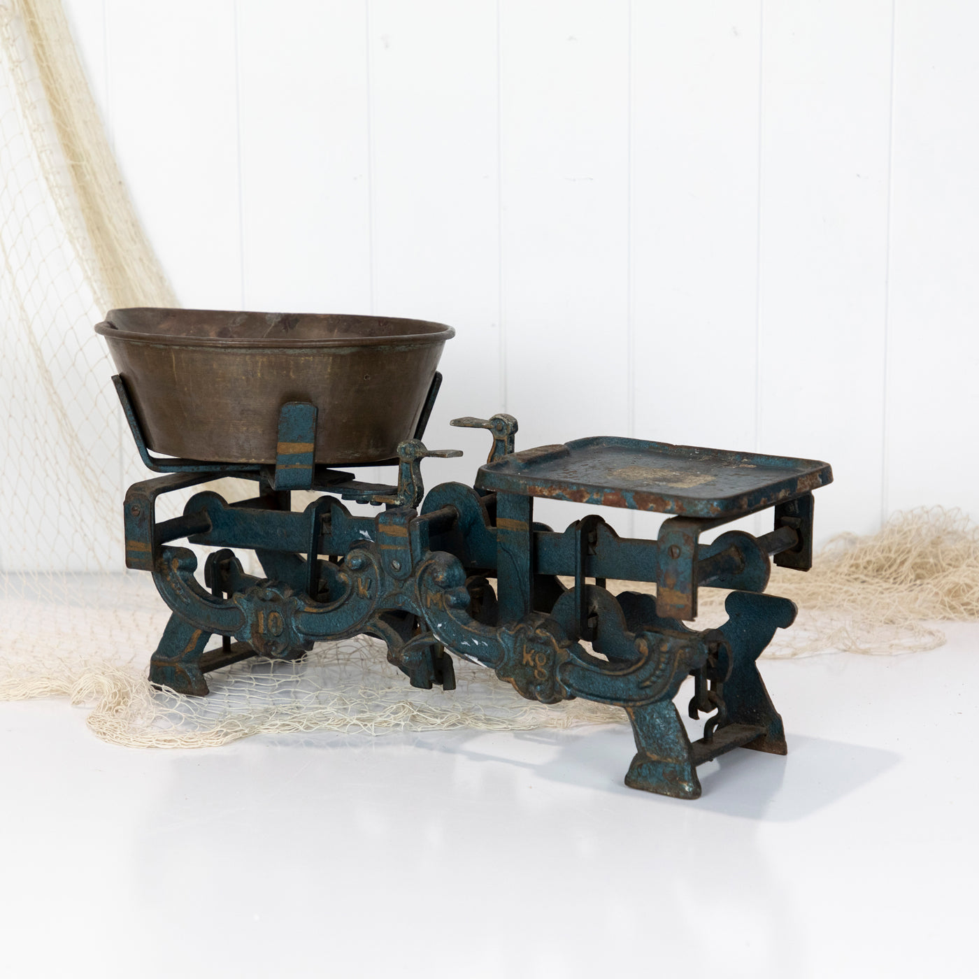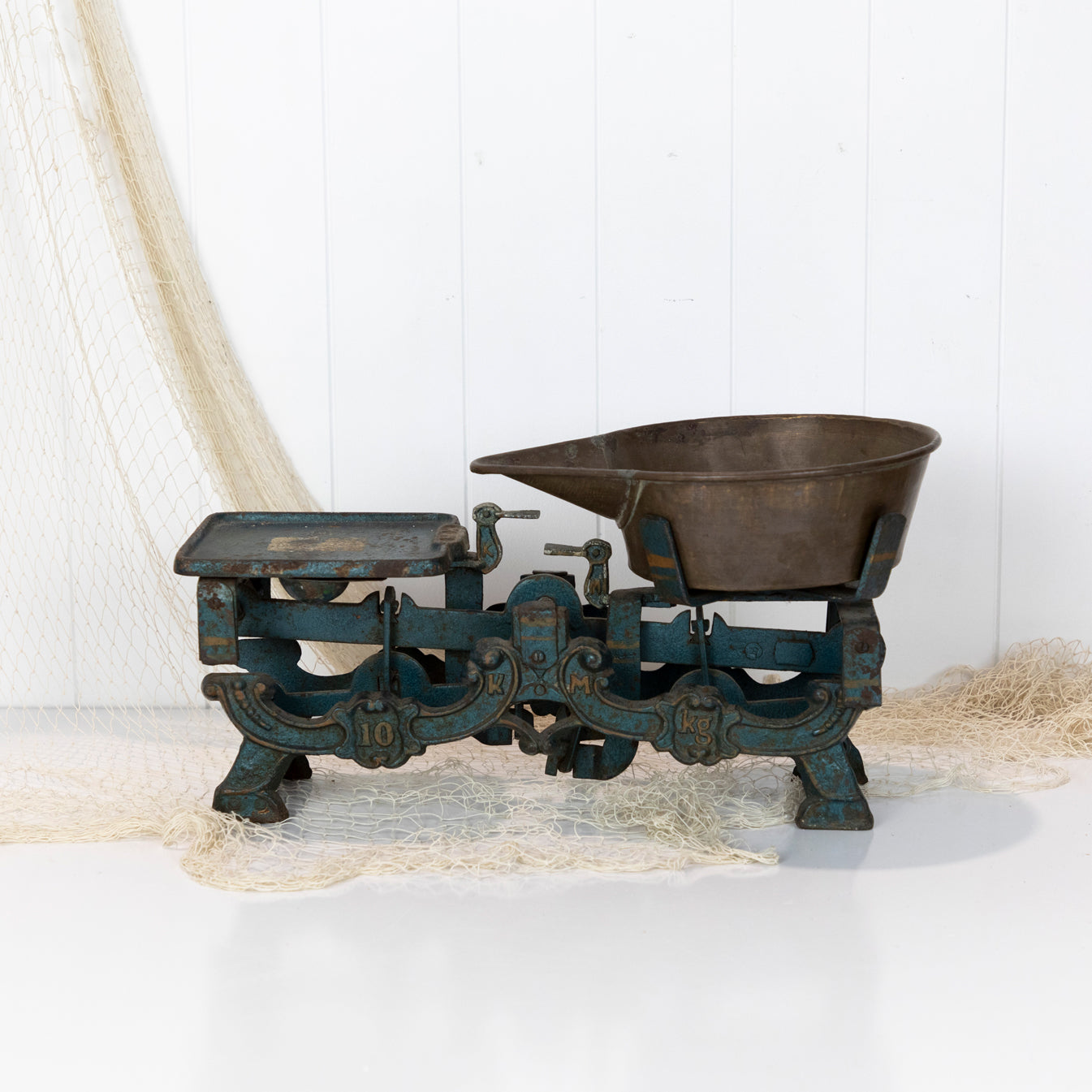 Made with cast iron it has a wonderfully worn blue finish, and the brass bowl has a beautiful patina.