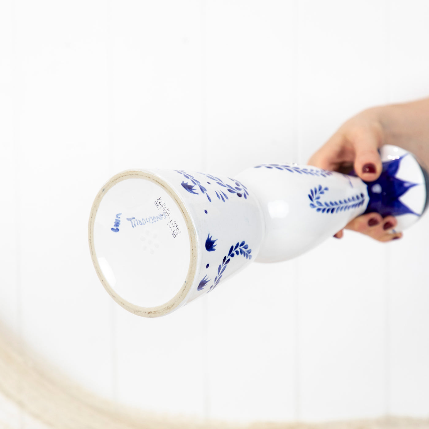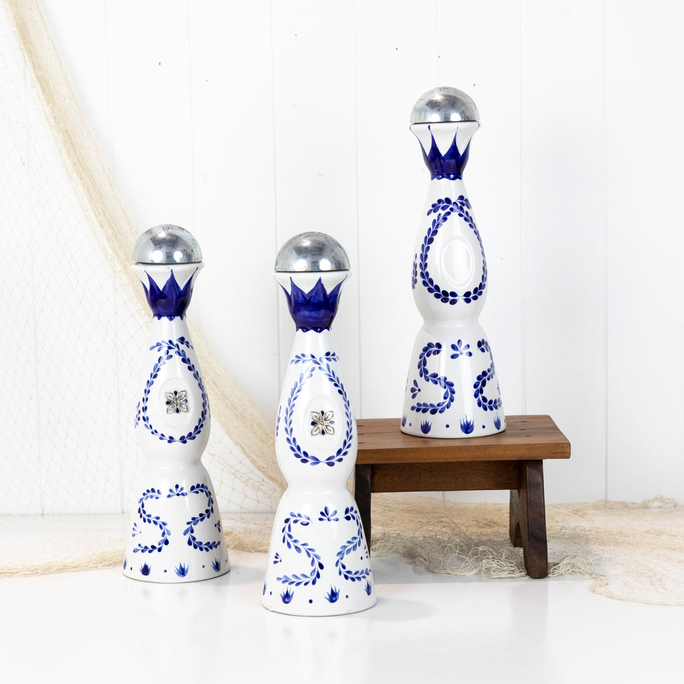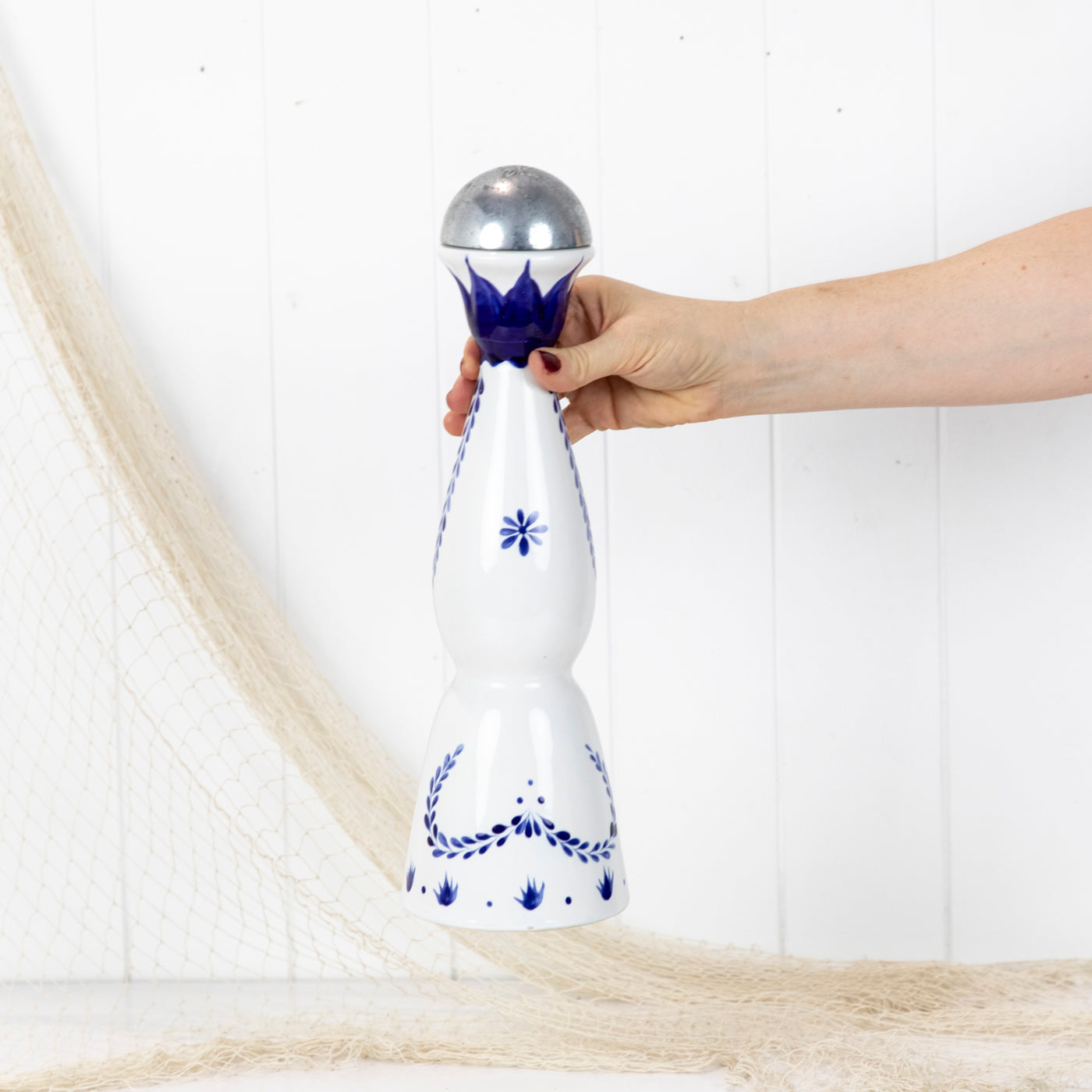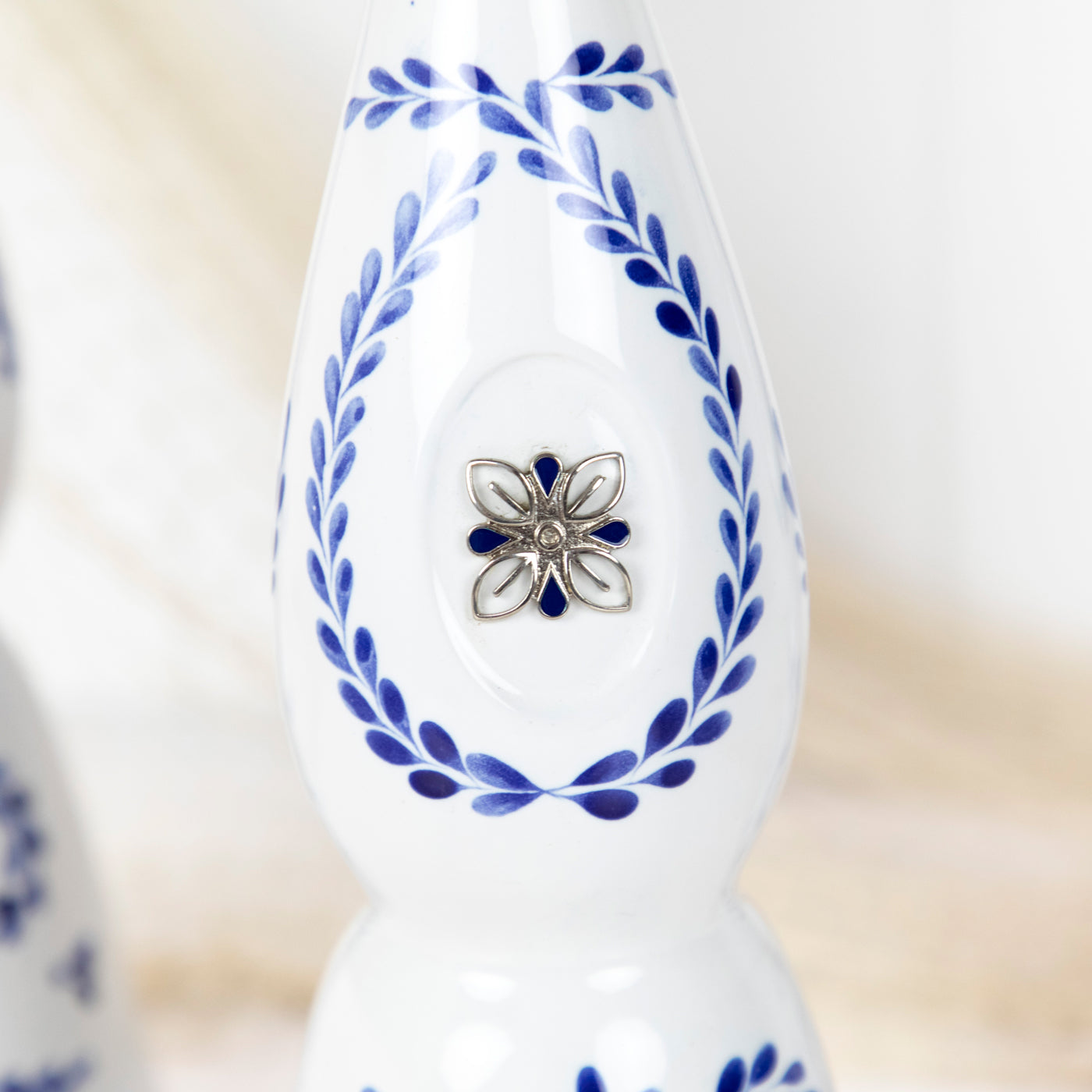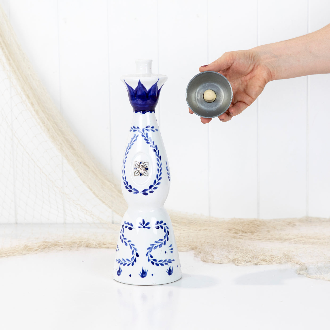 The bottles are made of white ceramic, and the design is often characterised by a feathered pattern in cobalt blue, as seen in the iconic Reposado bottle. The process of creating the bottle involves several steps, including moulding the clay, firing it in a kiln, applying a glaze, and then hand-painting the design.