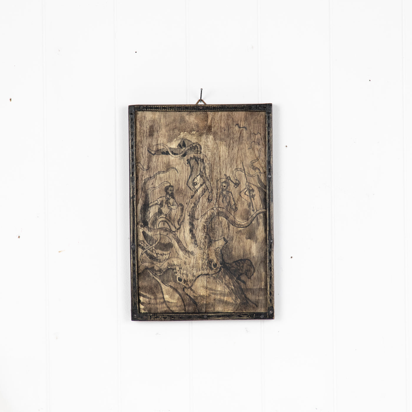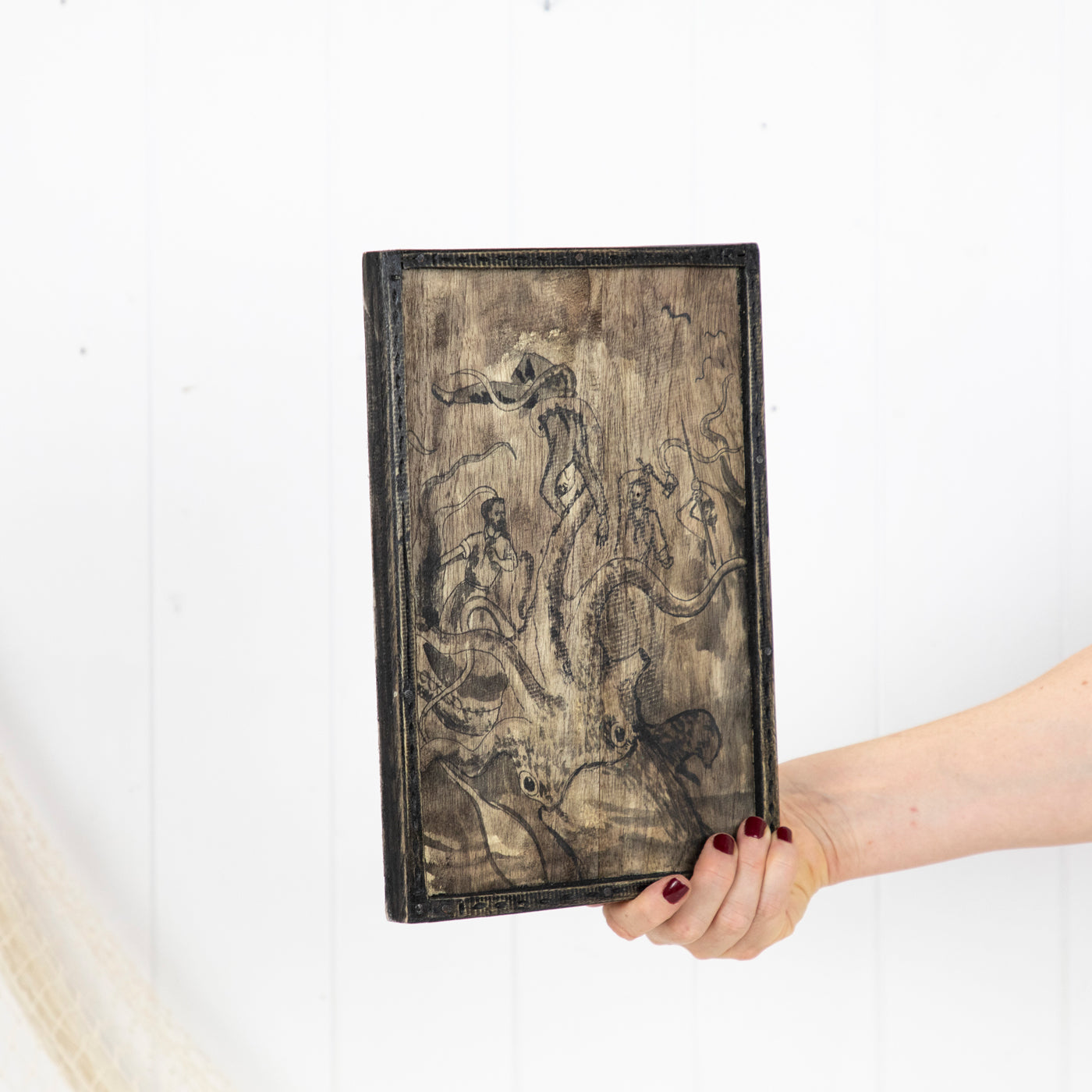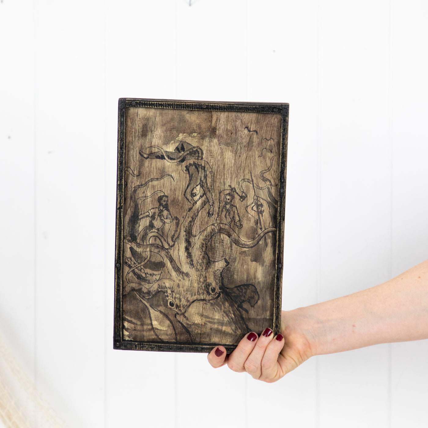 It shows a crew of sailors attempting to save themselves from the kraken's tentacles!