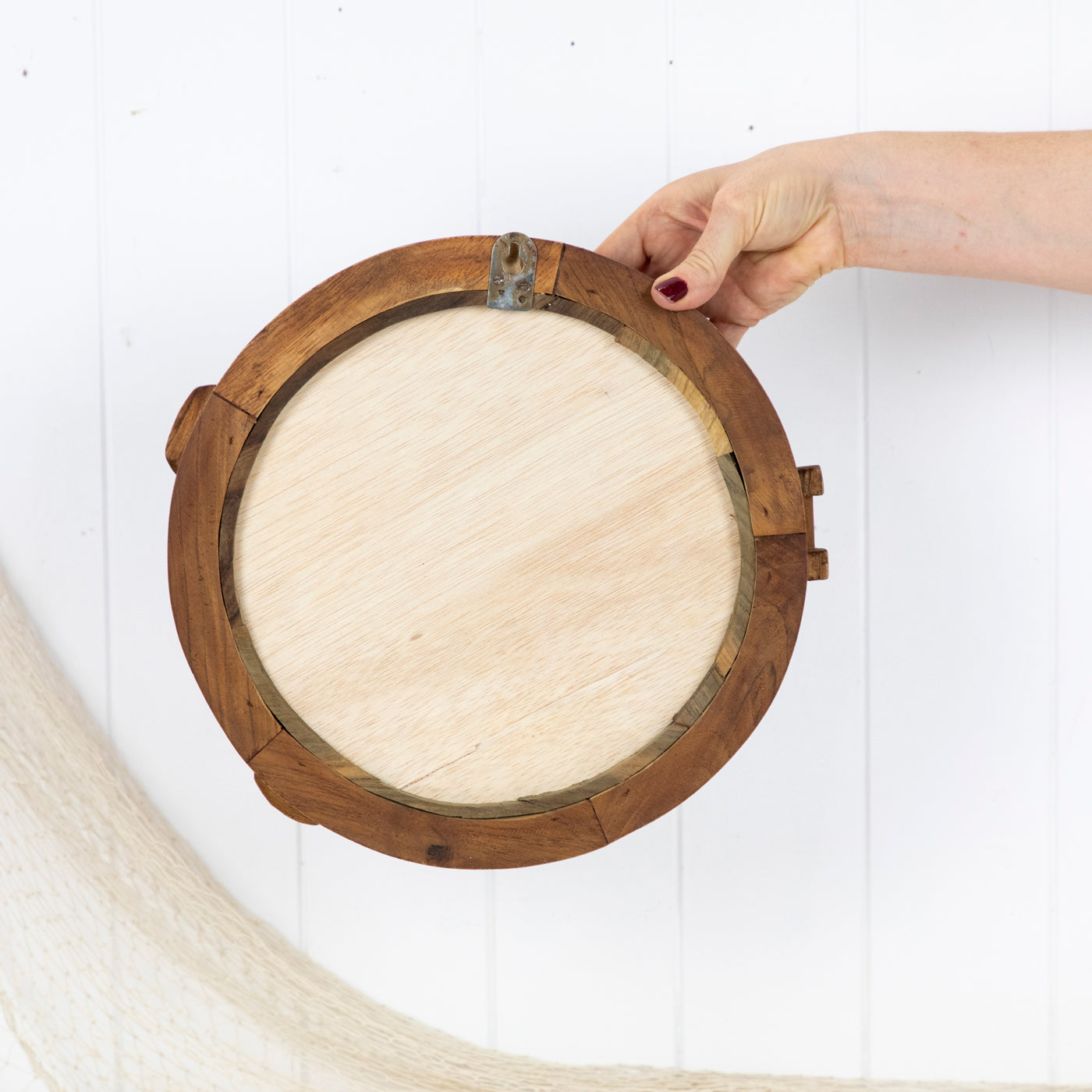 The timber has been carved to look like a porthole. Fitted with a hook ready to hang.