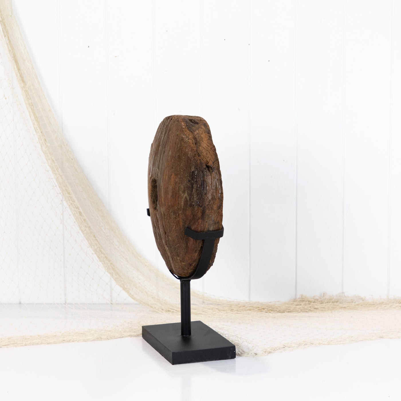 Rough and rustic, the edges still show marks and bits of nails where a metal band was once fitted.
