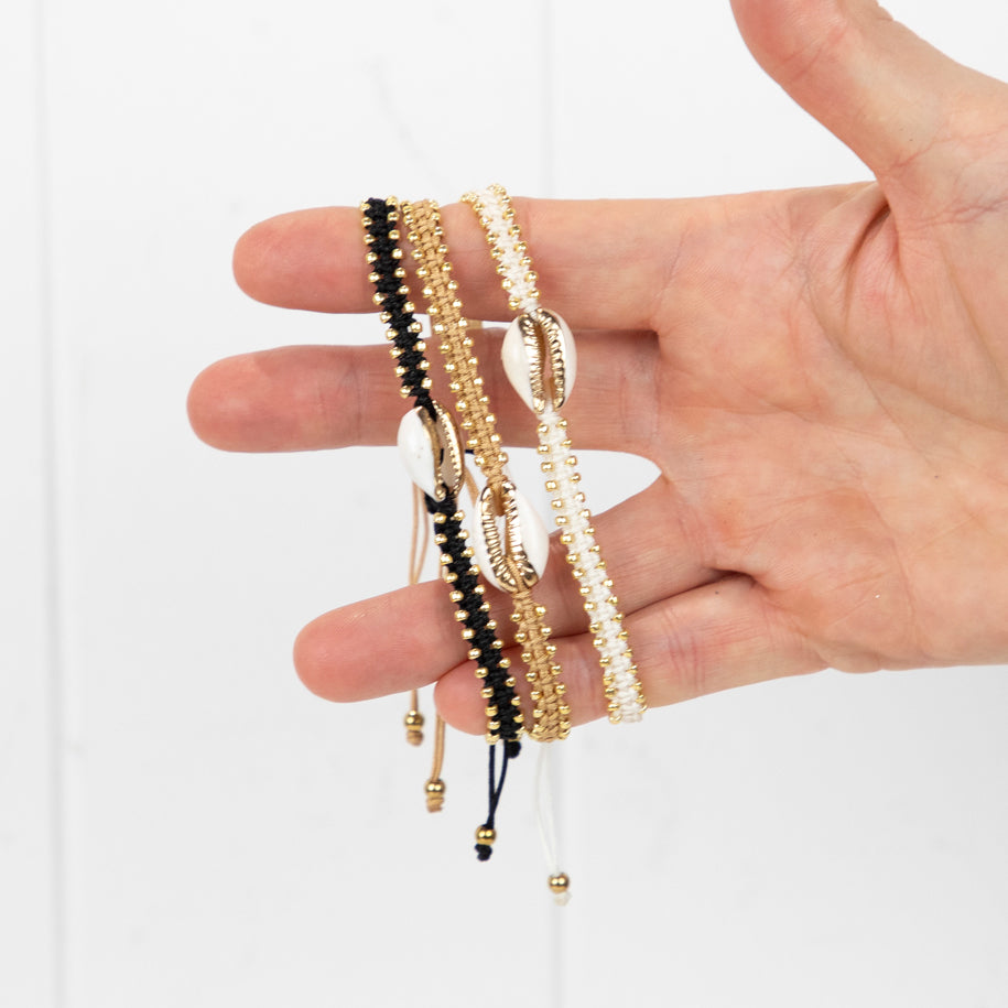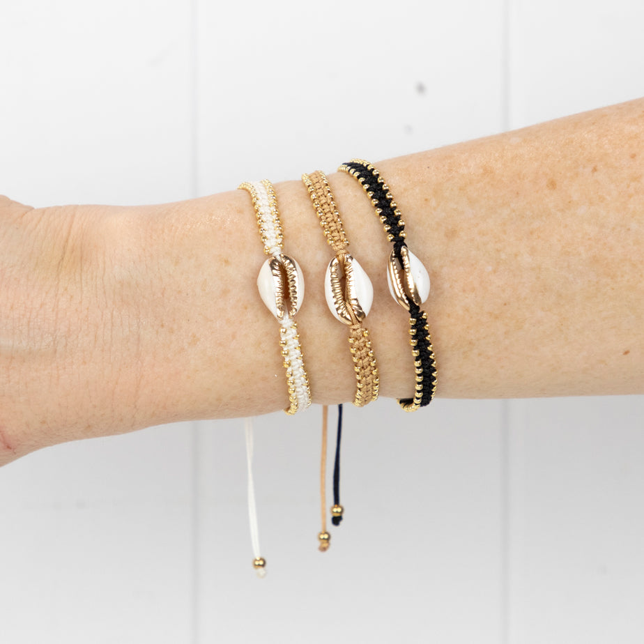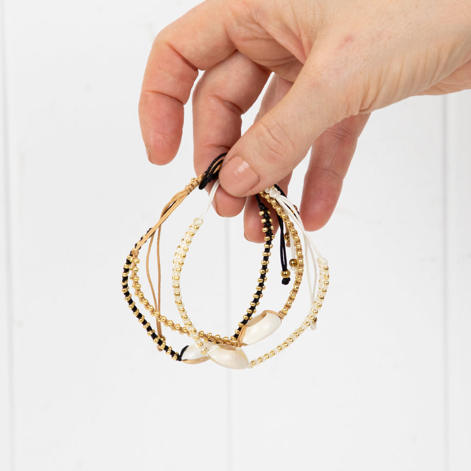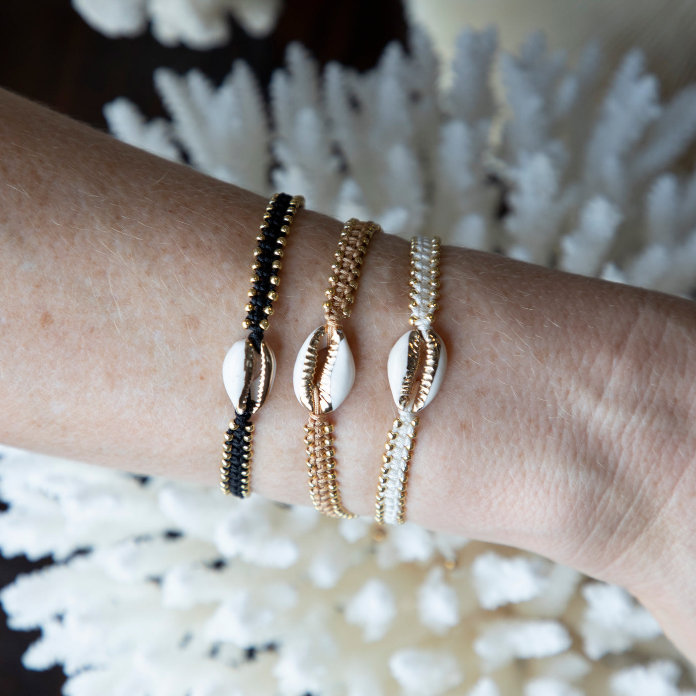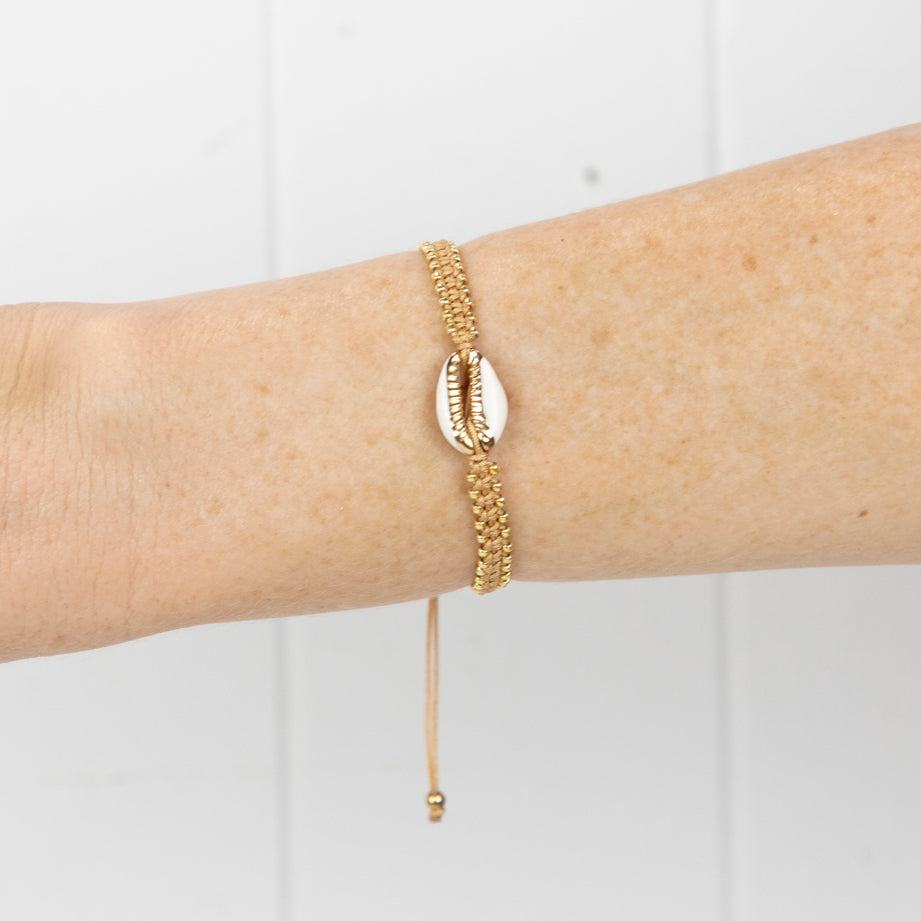 This bracelet features a gold dipped cowrie shells, hand braided with cord and golden feature beads.