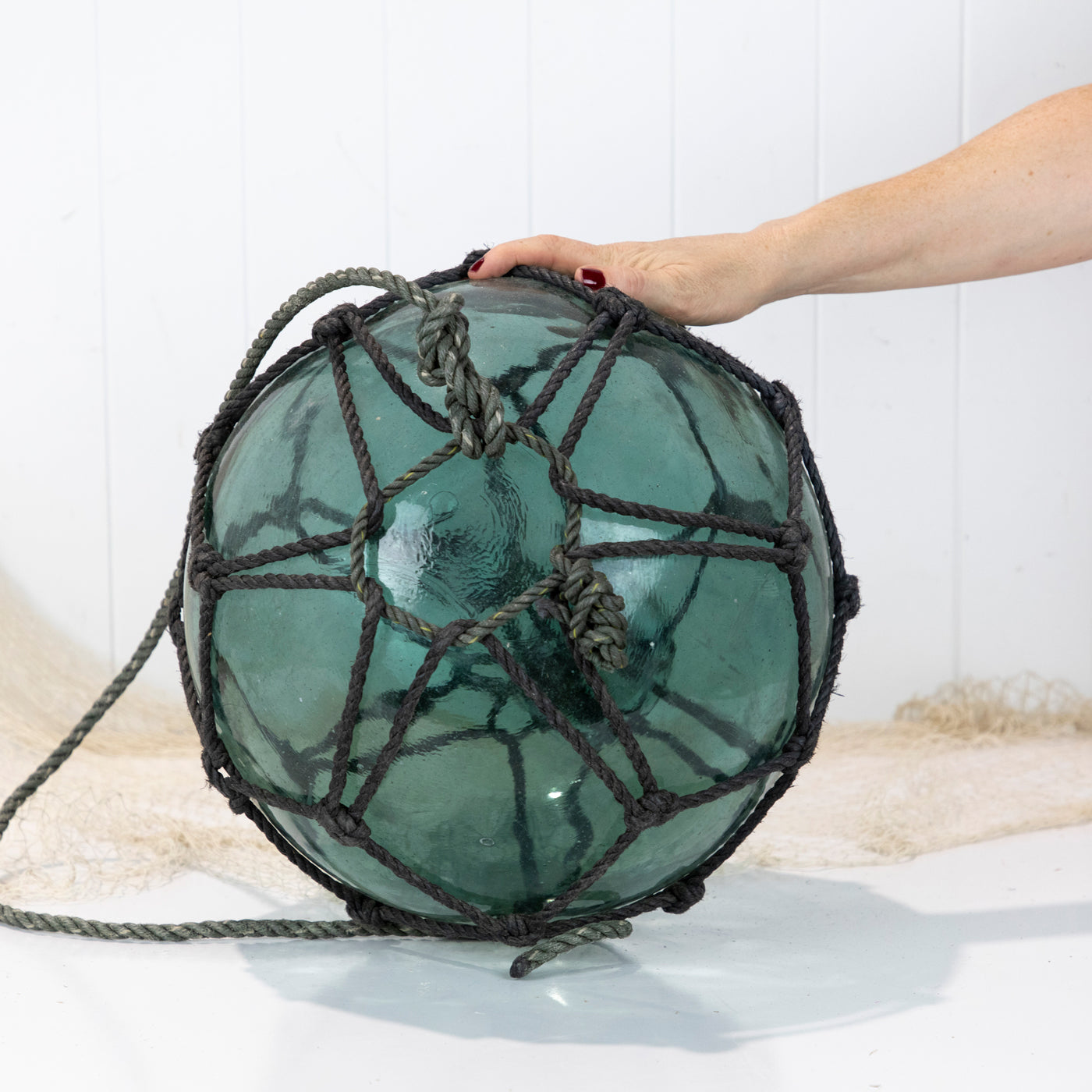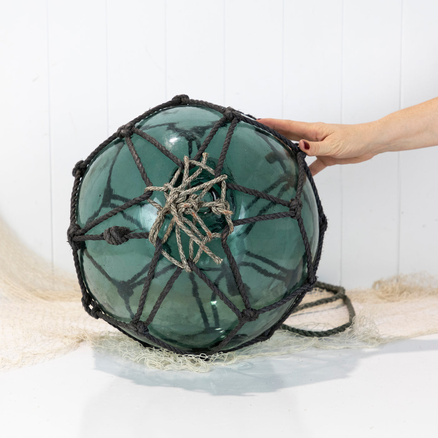 This beautiful old 14" Japanese longline glass float is a stunning colour with grey netting.