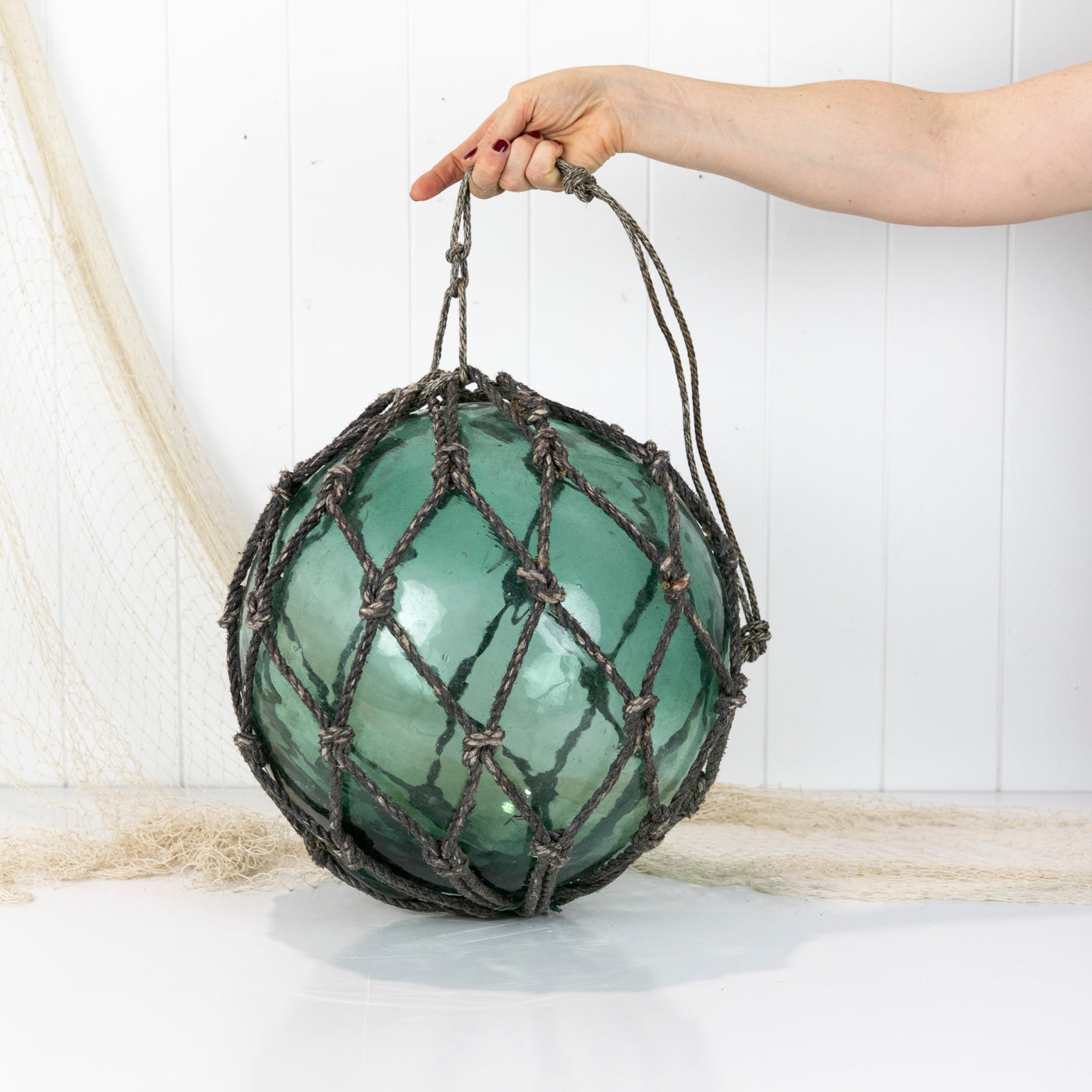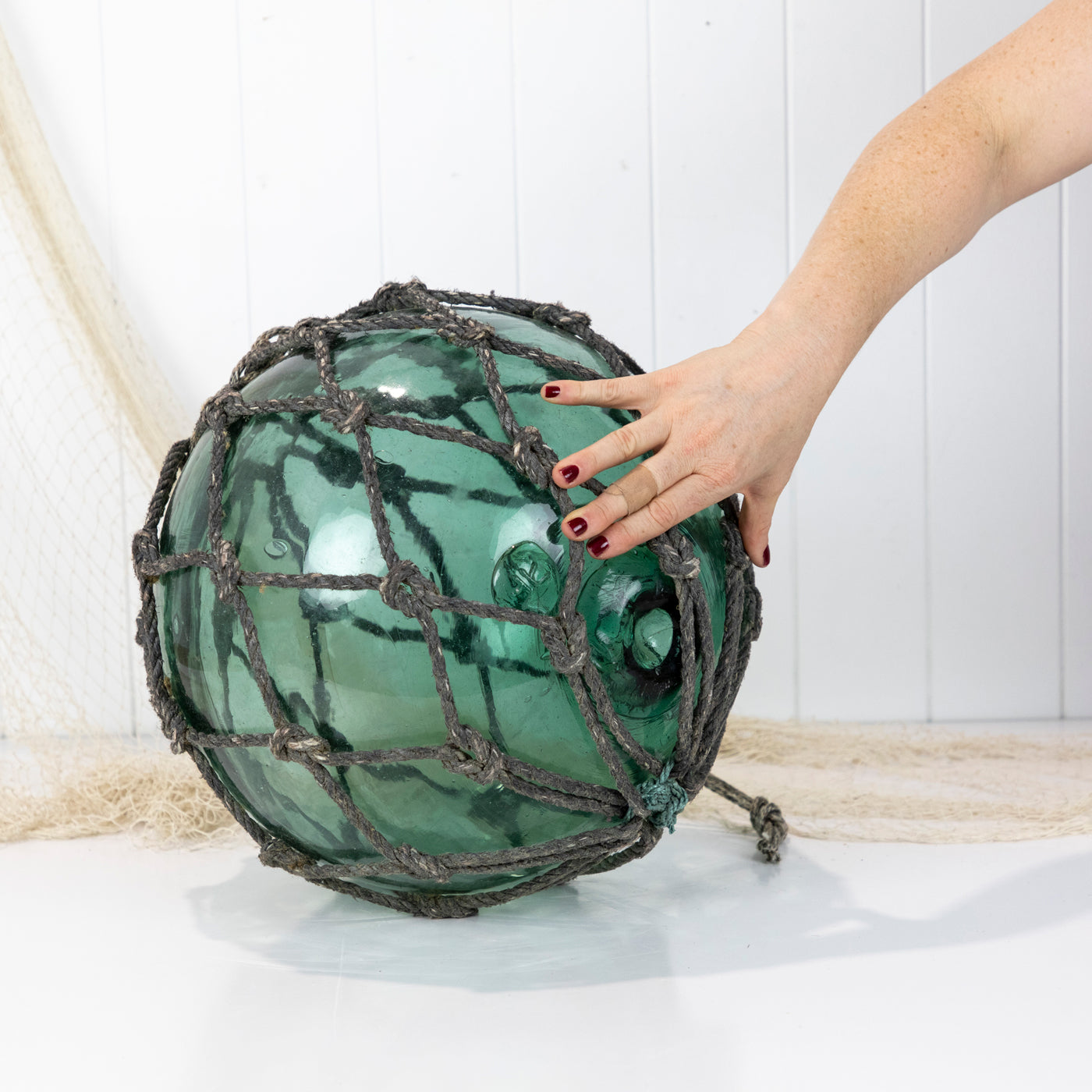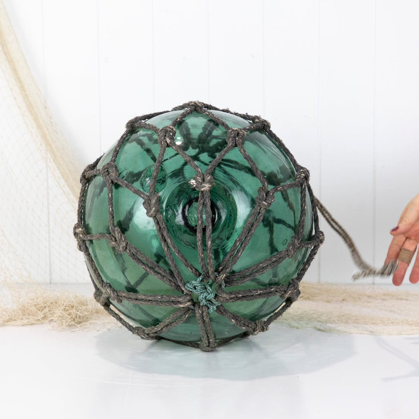 This beautiful old 14" Japanese longline glass float is a stunning colour with grey netting and a maker's mark.