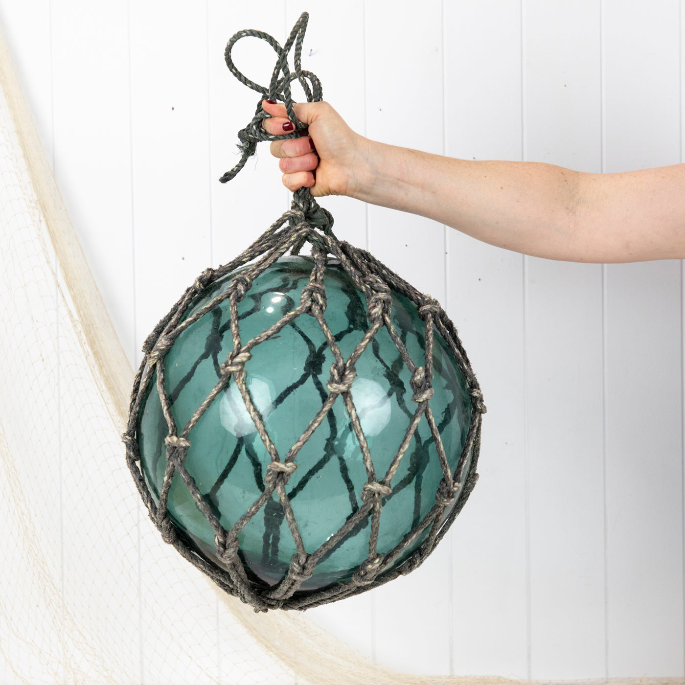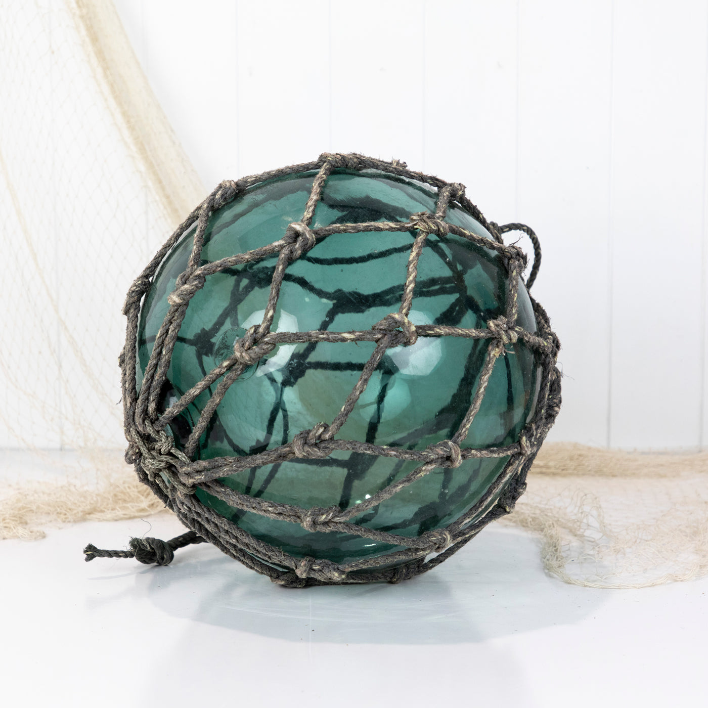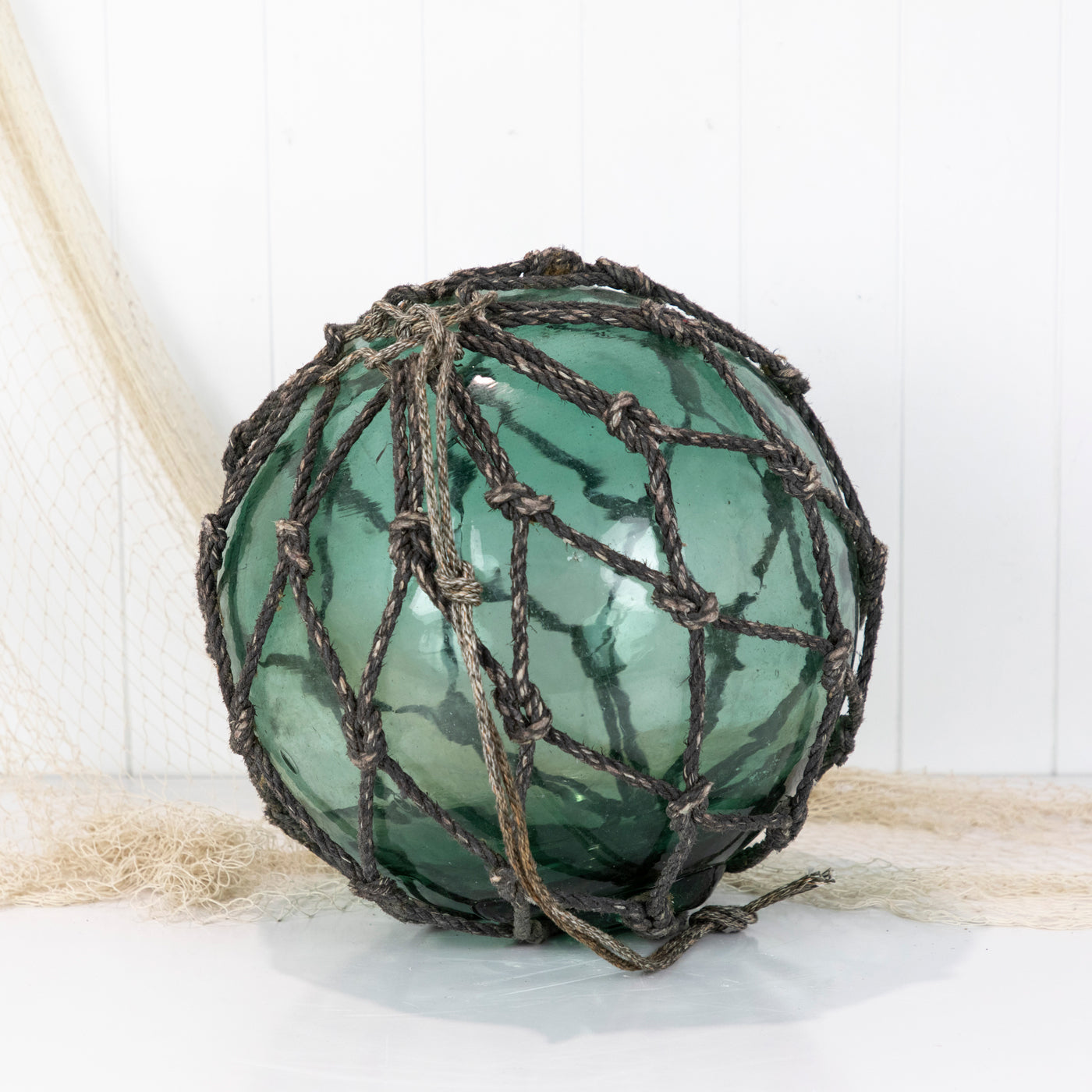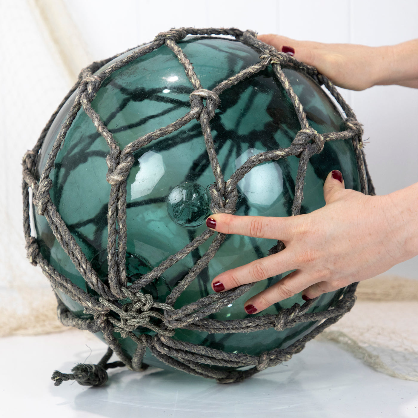 This beautiful old 14" Japanese longline glass float is a stunning colour with grey netting and a maker's mark.
