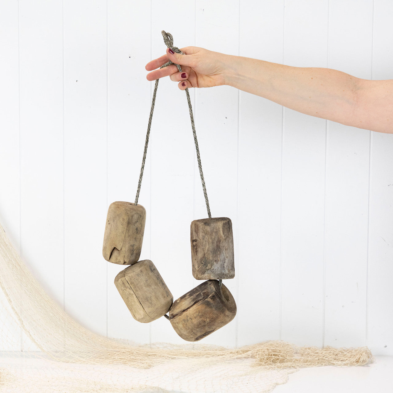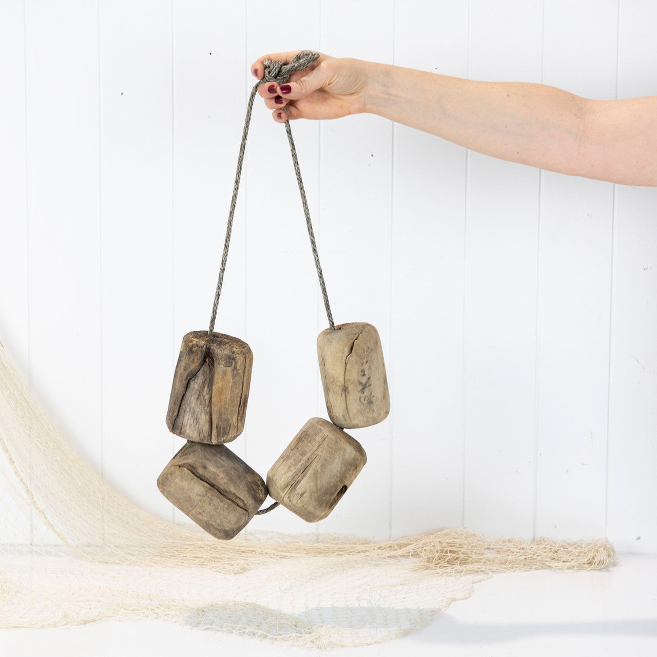 With the net in disrepair from years of use, the rope and floats have been salvaged to make this cluster to hang on the wall.