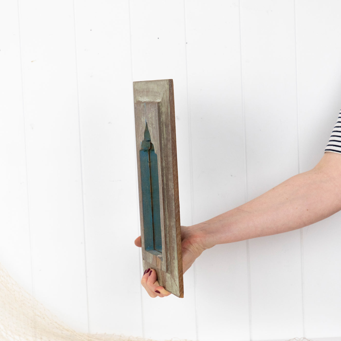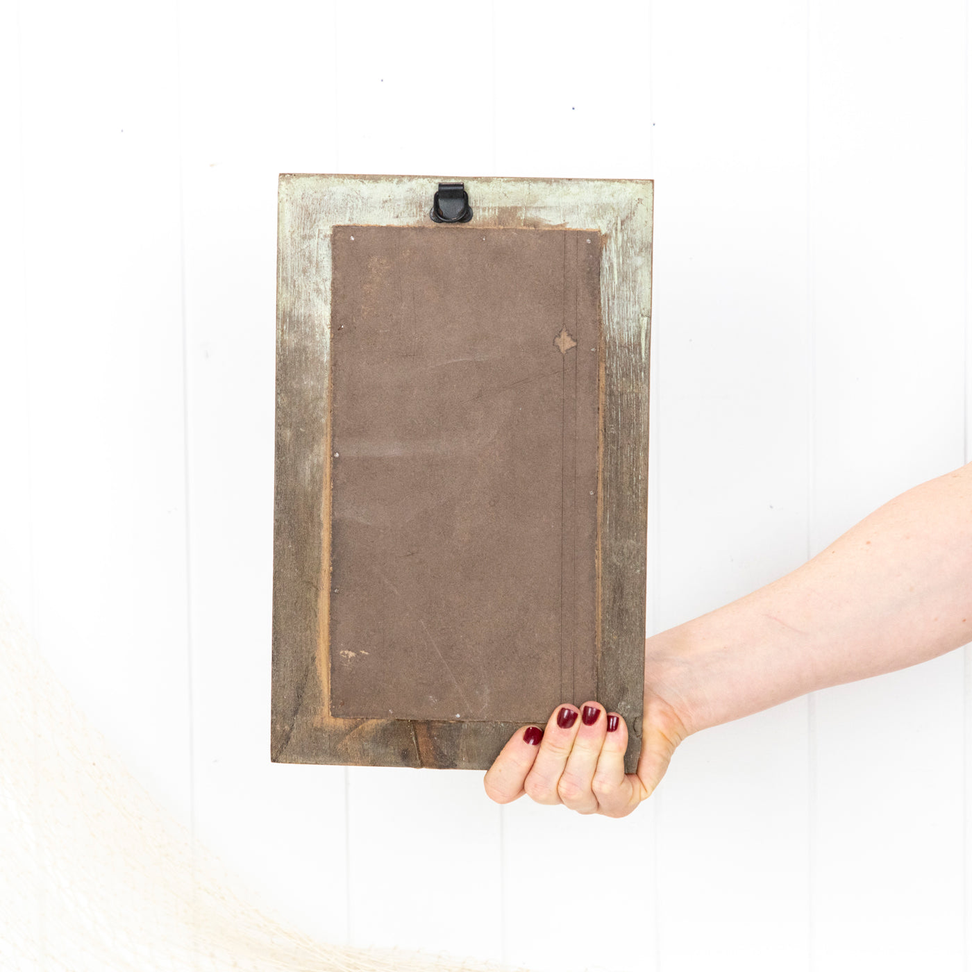 The timber is beautifully aged, with some remnants of past paint colours. Fitted with a hook ready to hang.