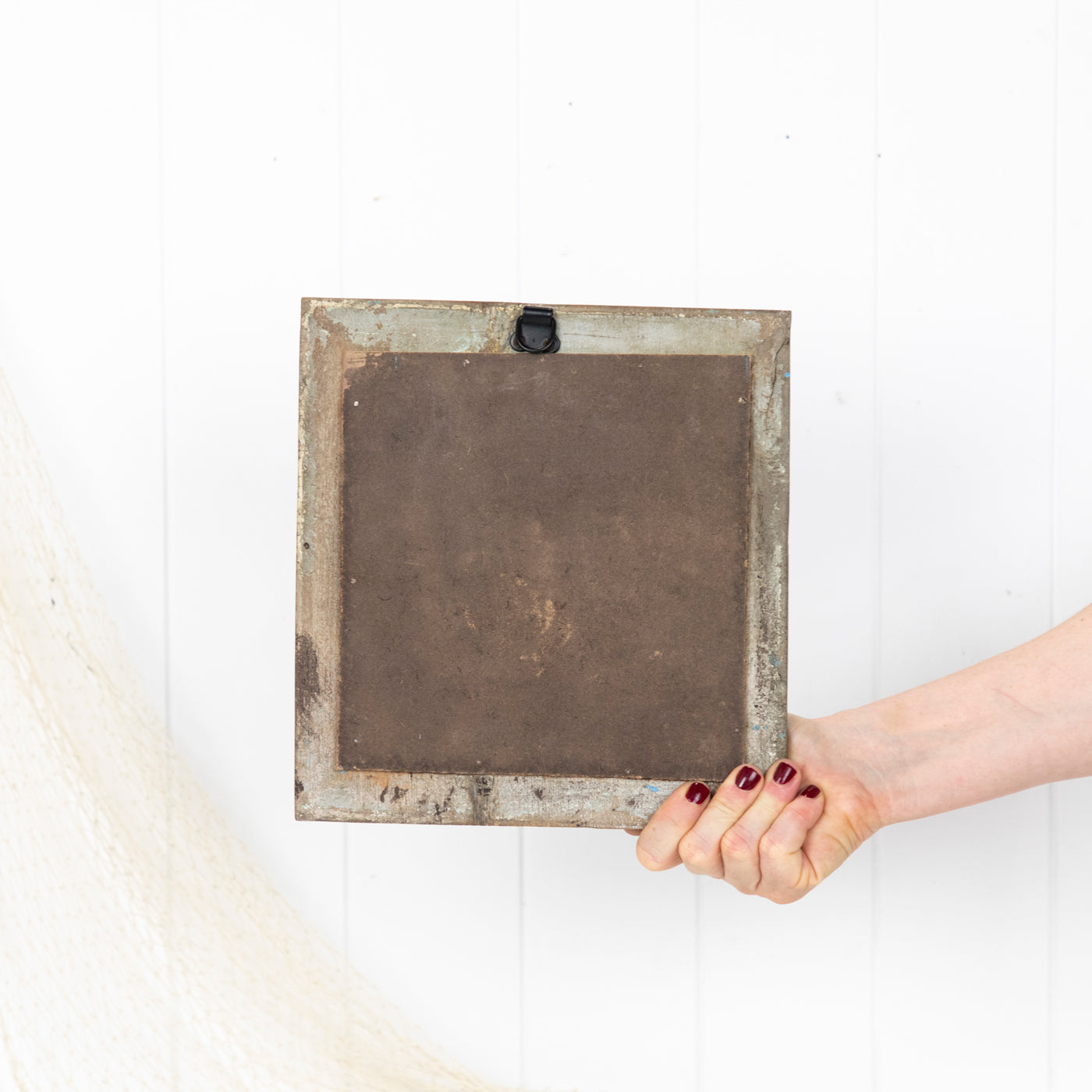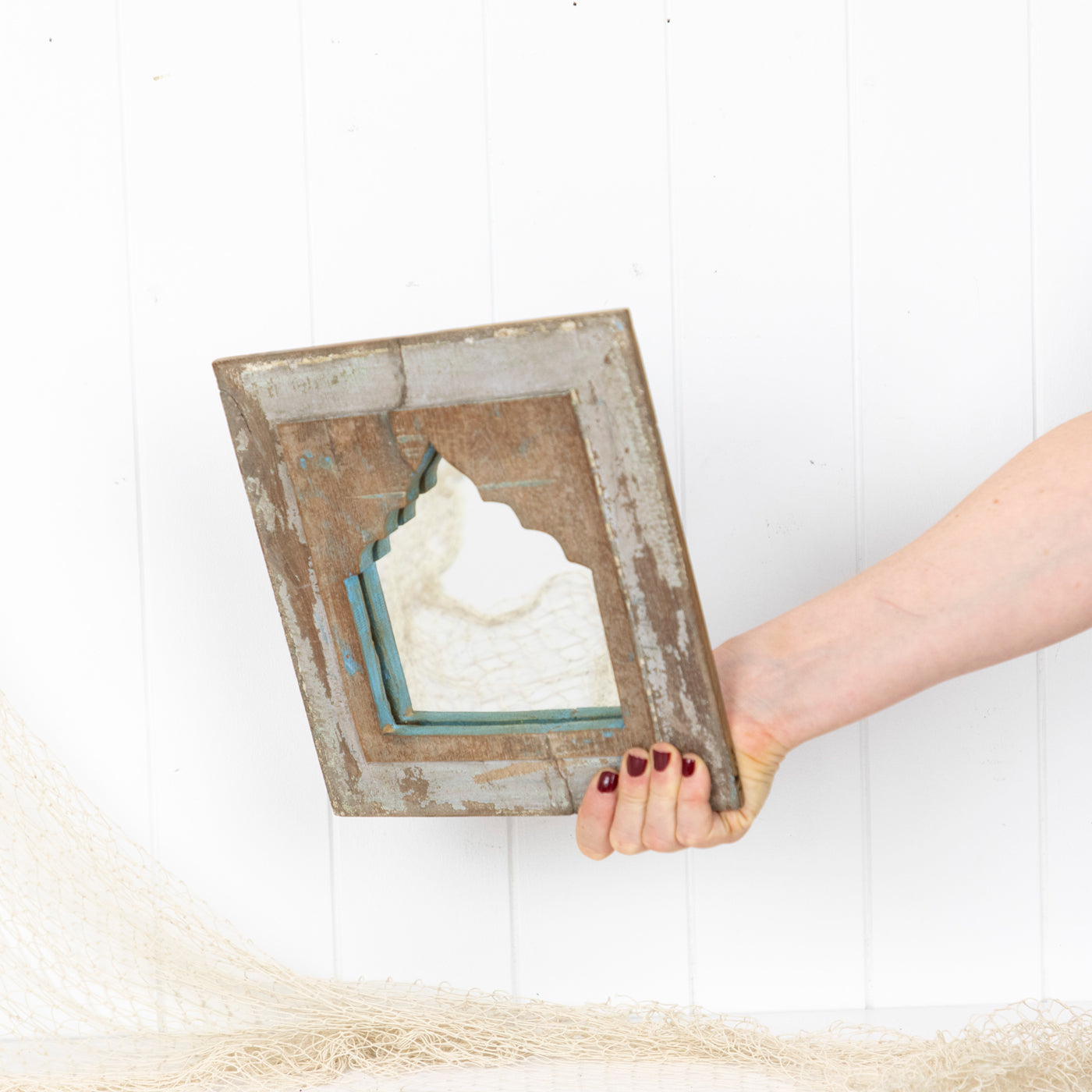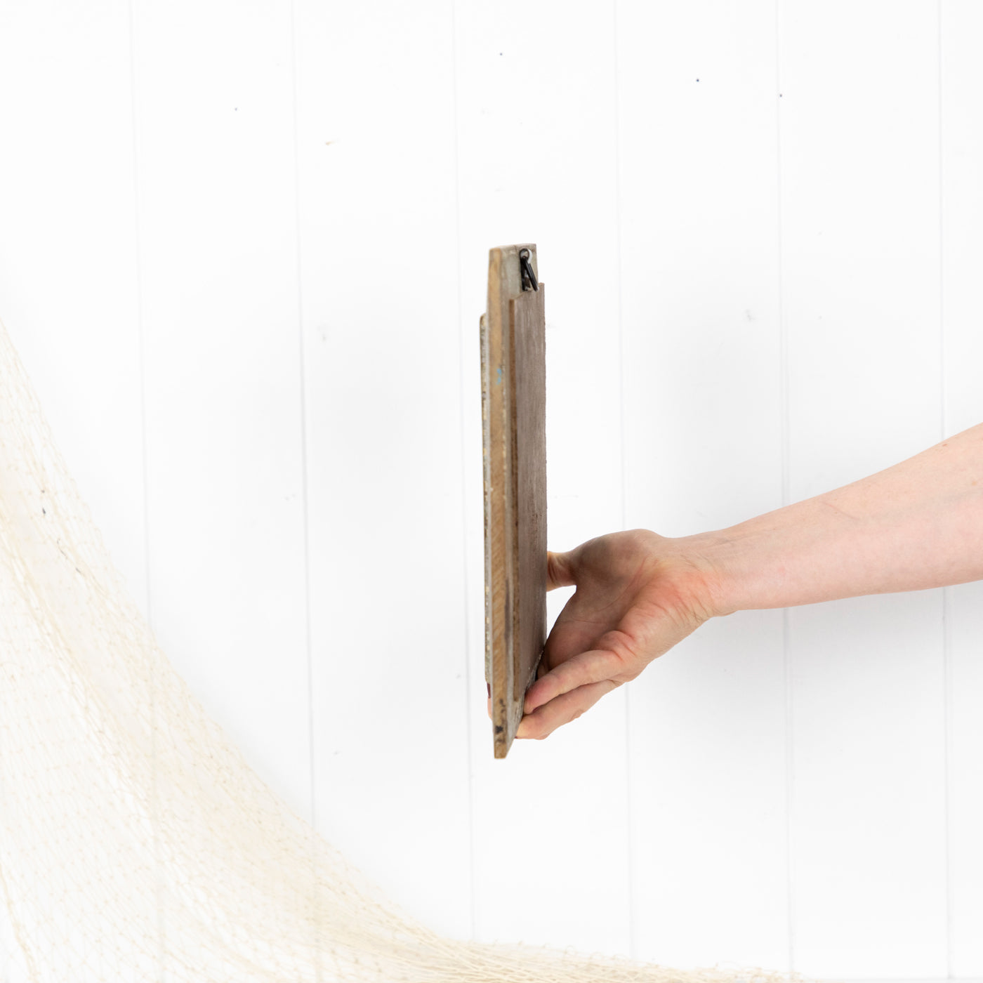 The timber is beautifully aged, with some remnants of past paint colours. Fitted with a hook ready to hang.