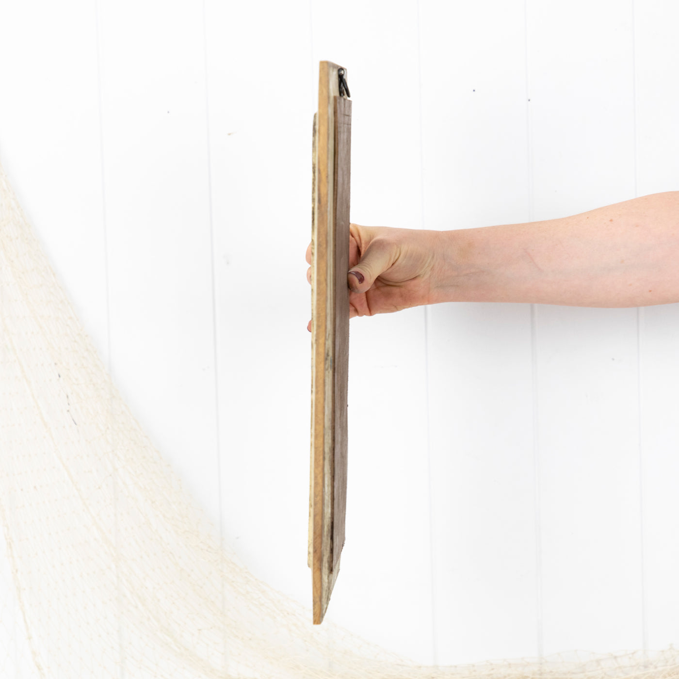 The timber is beautifully aged, with some remnants of past paint colours. Fitted with a hook ready to hang.