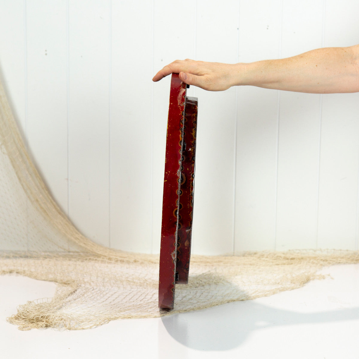 Due to the repurposed materials it has a wonderful texture and patina, each mirror is slightly individual and may have text, but equally beautiful. More rust may form over time.