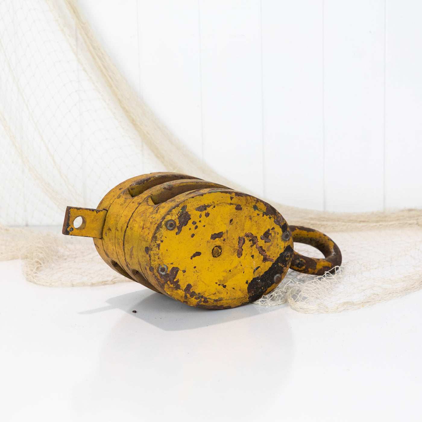 This big old wooden pulley has been given a coat of mustard yellow paint.