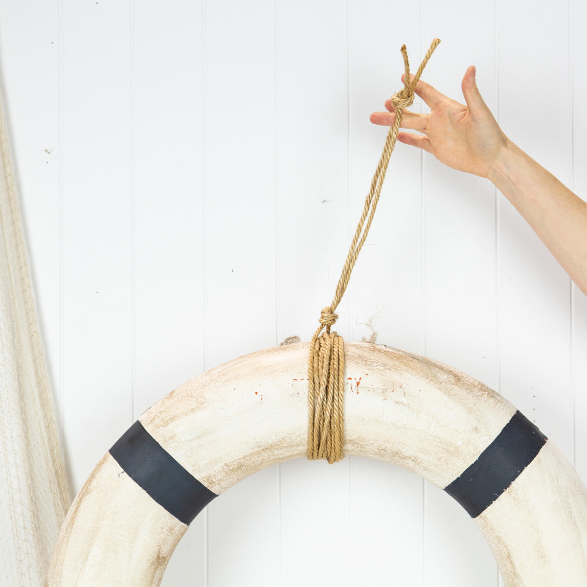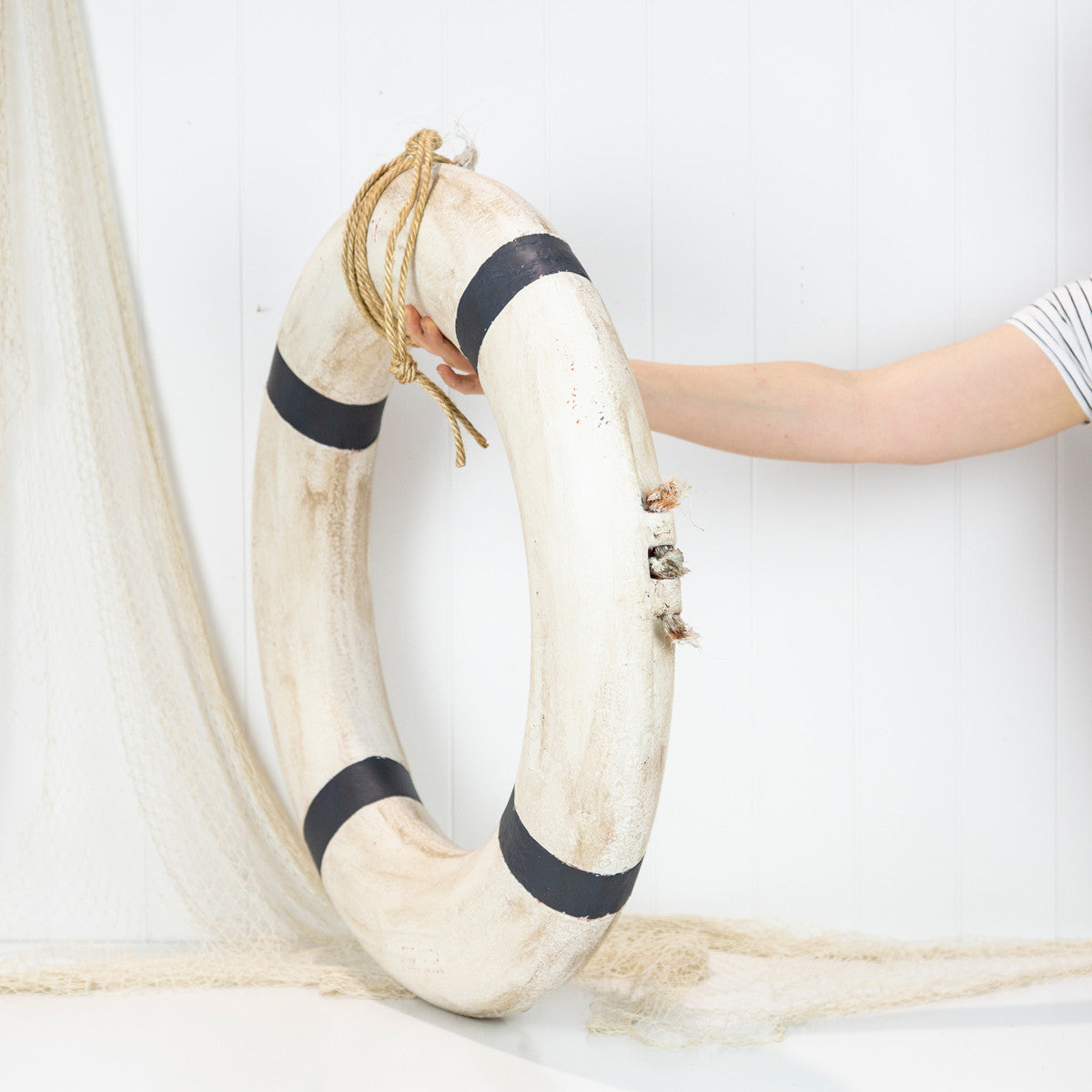 We have painted this old rustic life ring gesso white and classic navy with white stripes, lightly sanded to a shabby finish and sealed with brown wax to give an aged look.