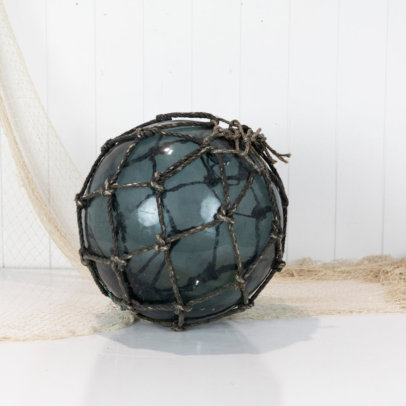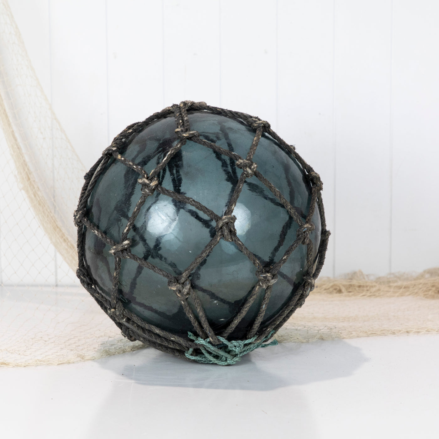 This beautiful old 14" Japanese longline glass float is a stunning colour with dark grey netting and a maker's mark.