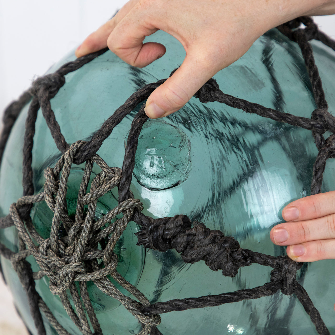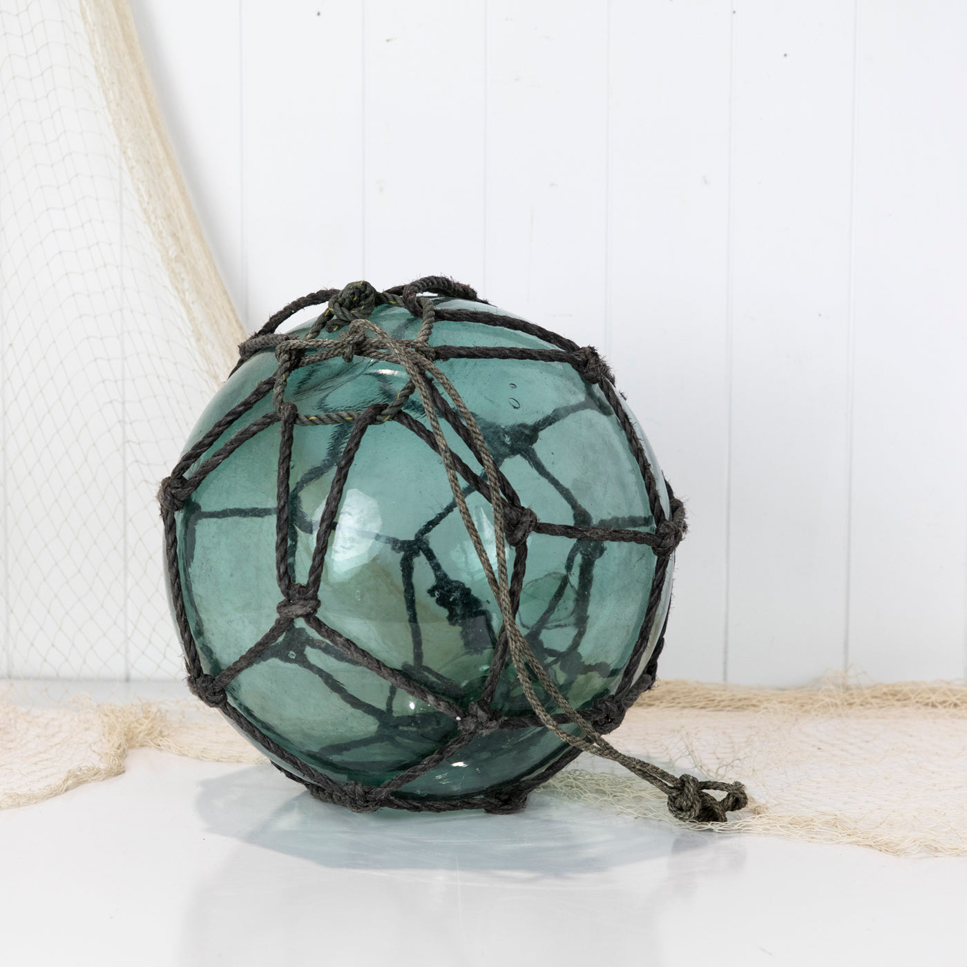 This beautiful old 14" Japanese longline glass float is a stunning colour with grey netting and a maker's mark.