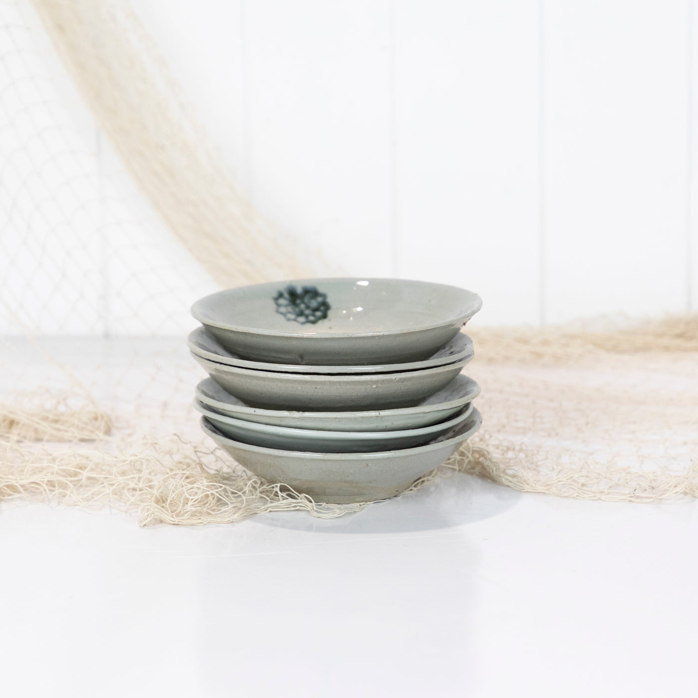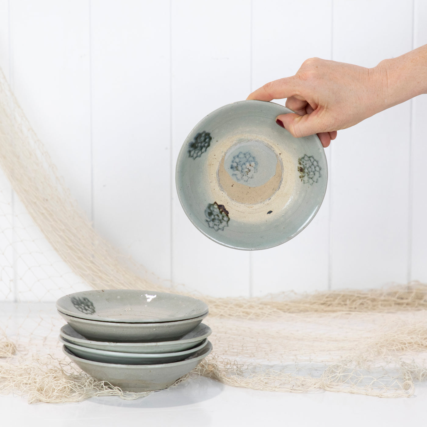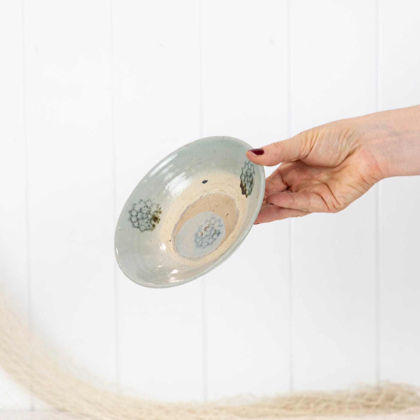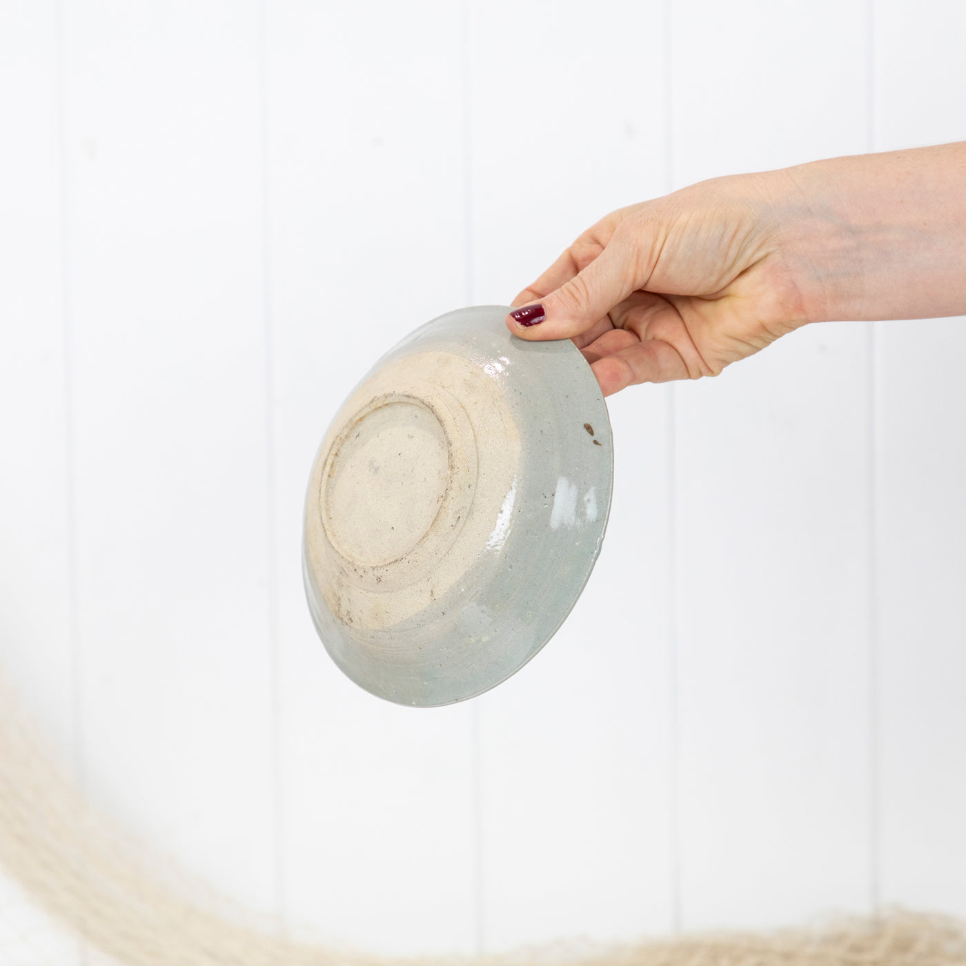 The dish is a soft blue/grey with a darker blue painted design. Some pitting and crazing can be seen as you would expect with a piece of this age.