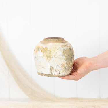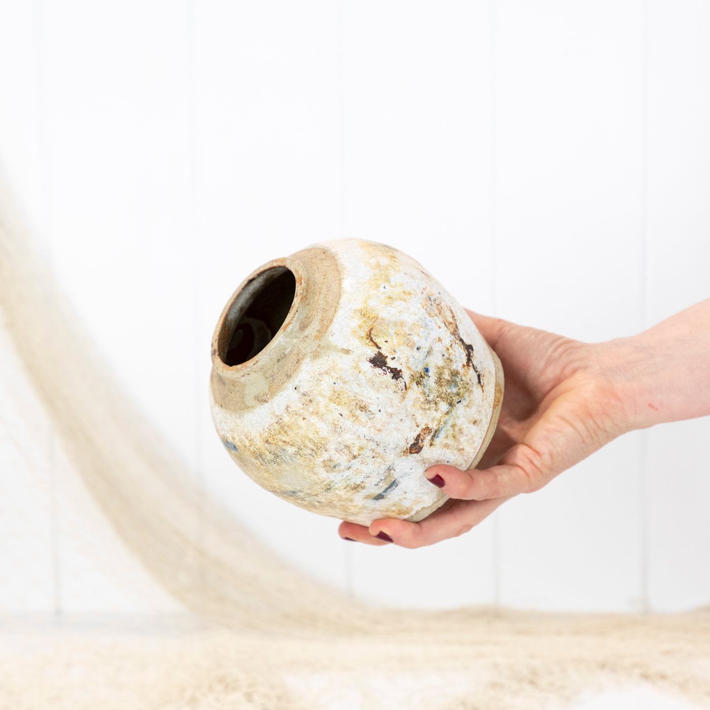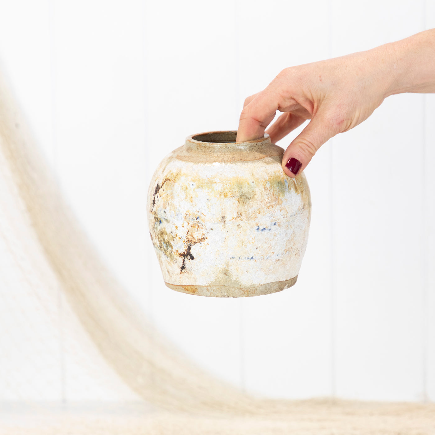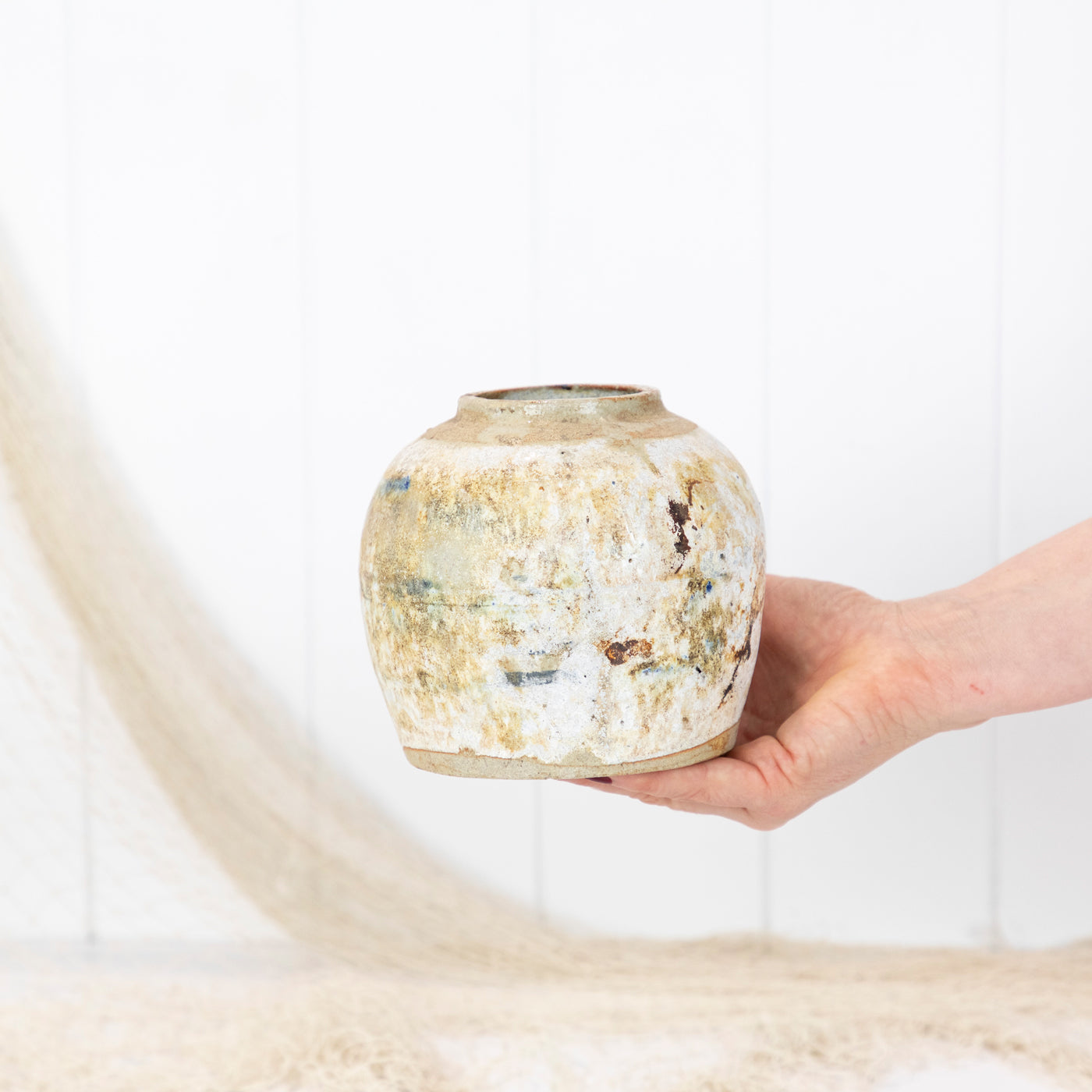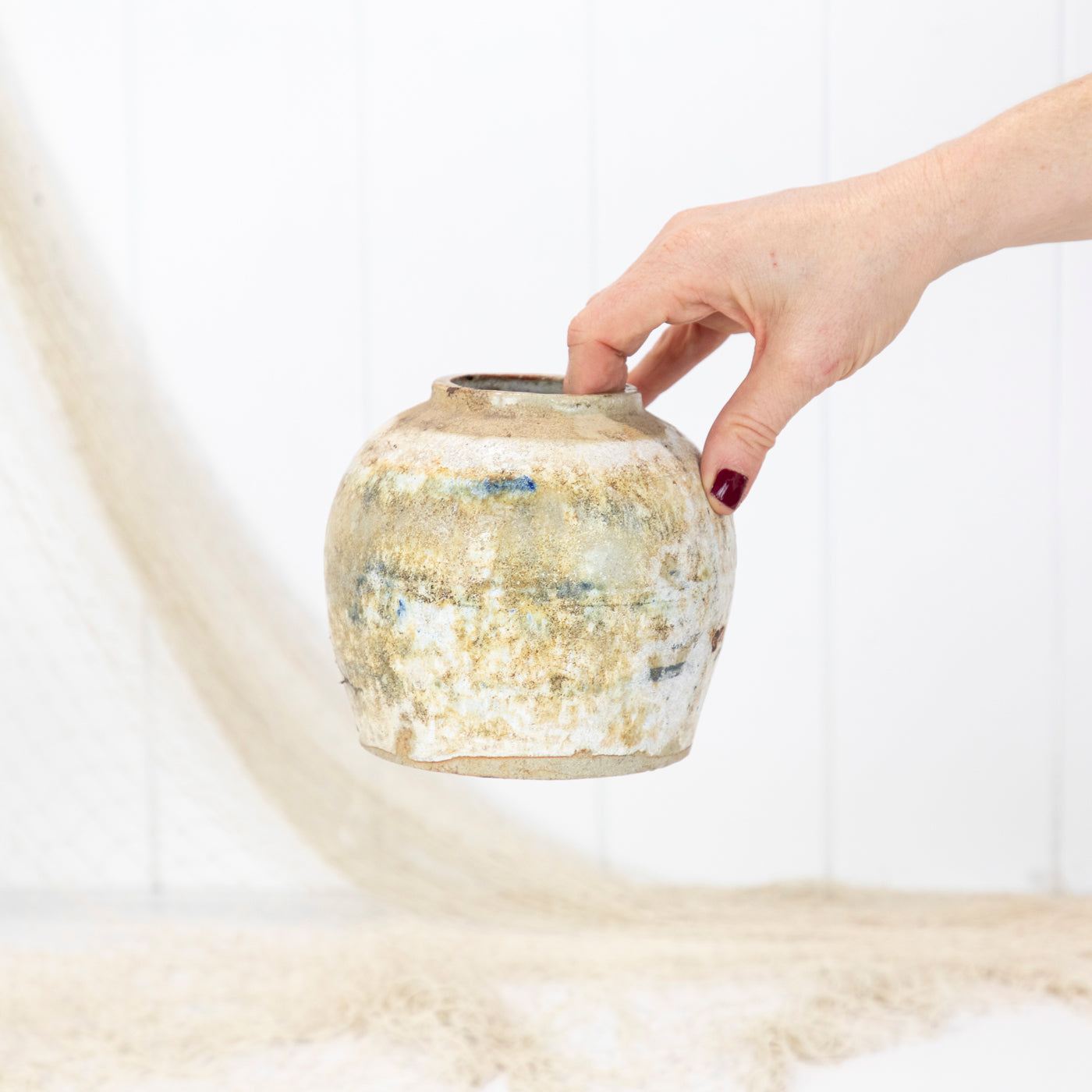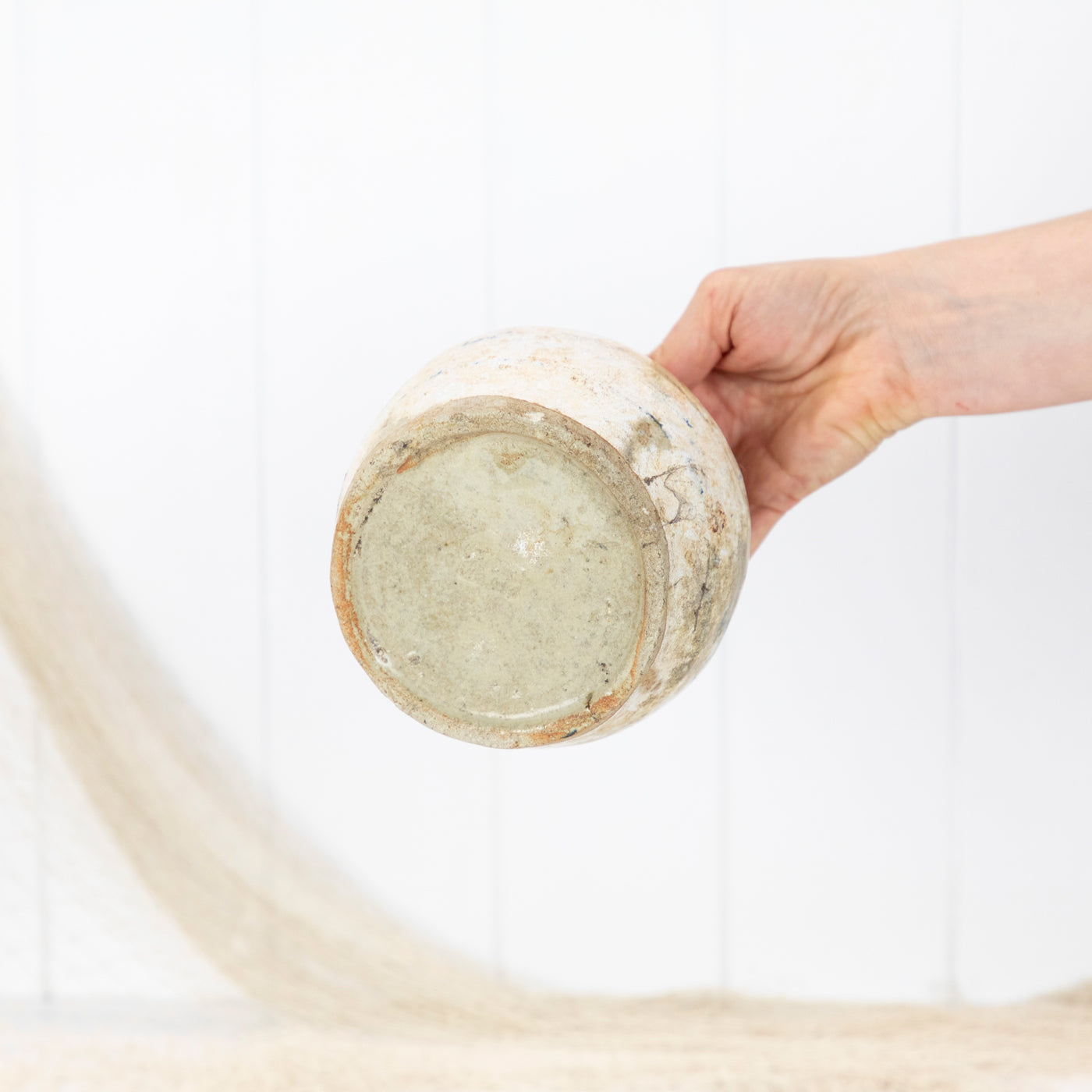 Its white and blue glaze has changed colour over the years creating the most wonderful, mottled patina with beige and grey patches.