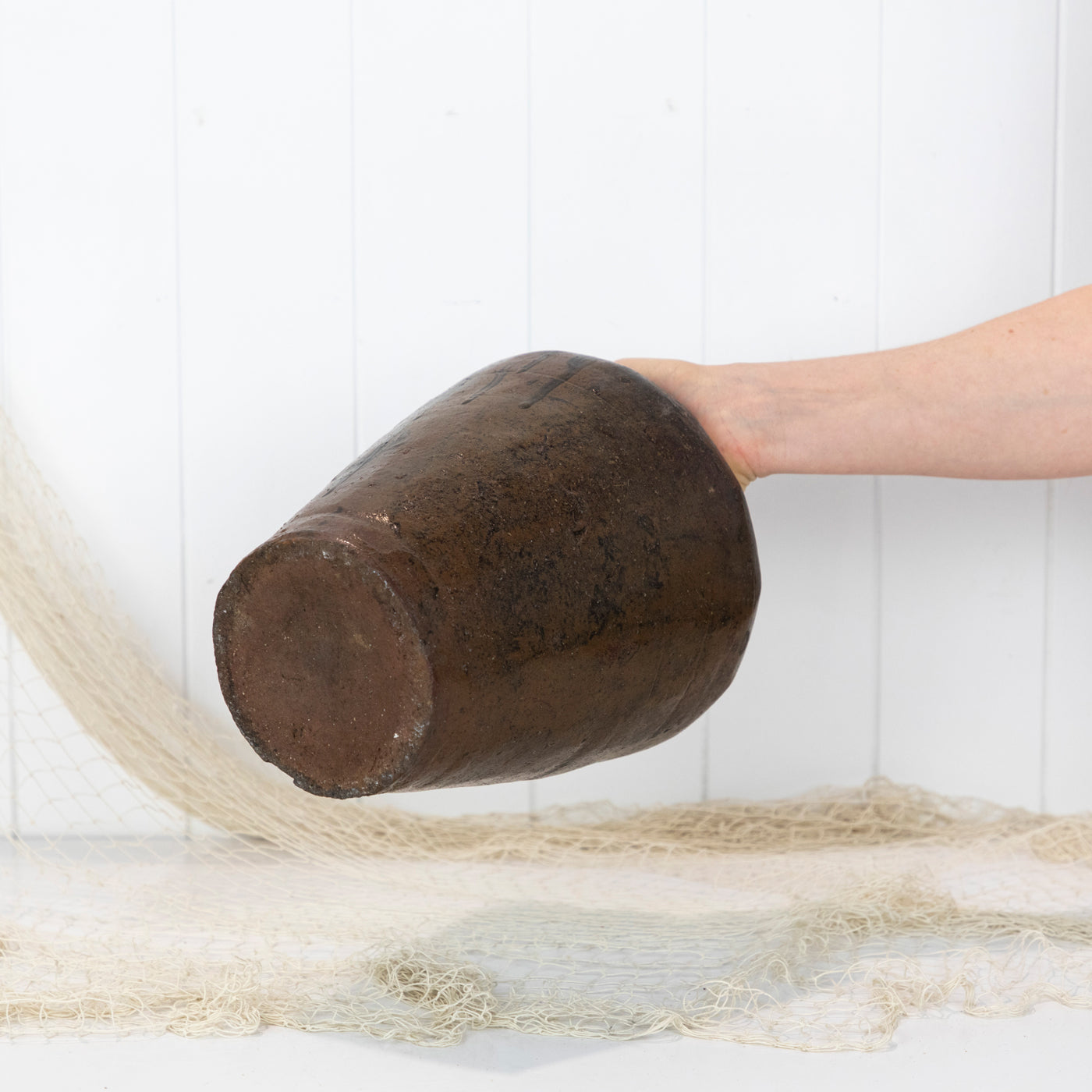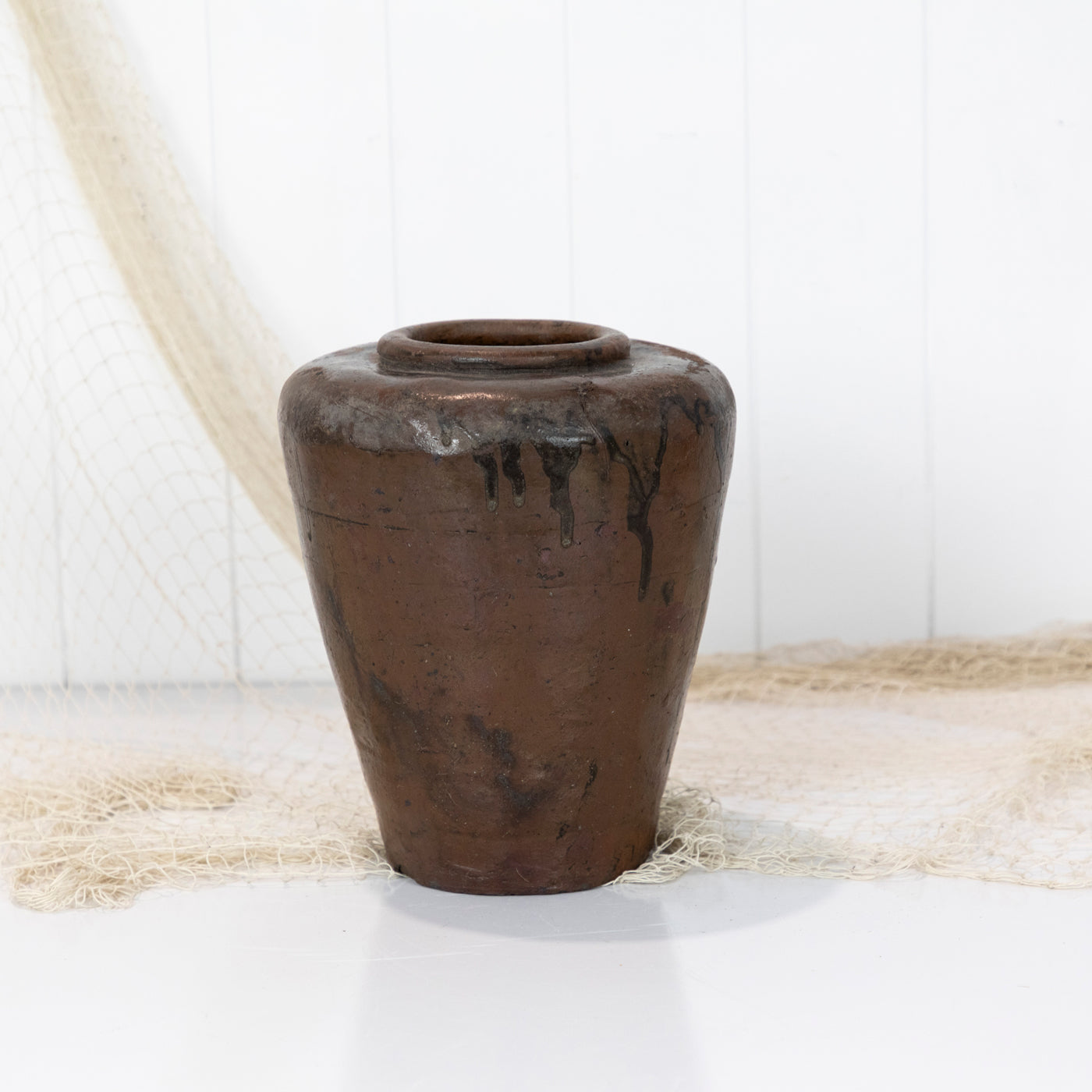 Made from a heavy clay, it has wonderful drips of dark glaze along its sides.