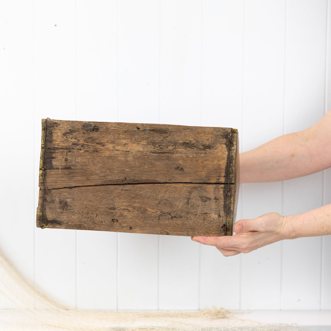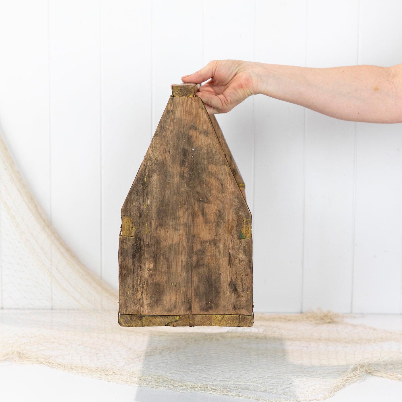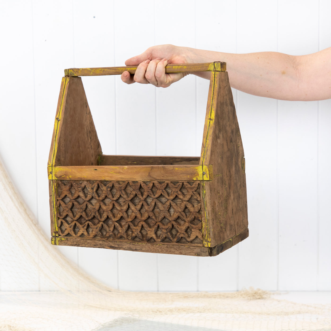 The side panels are carved in a lovely lattice pattern, and patches of yellow paint remain from a previous paint job!