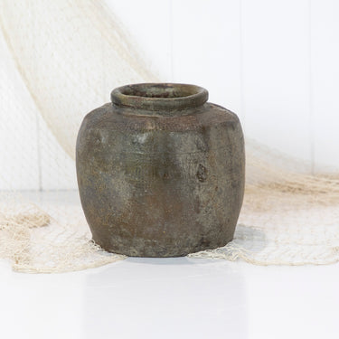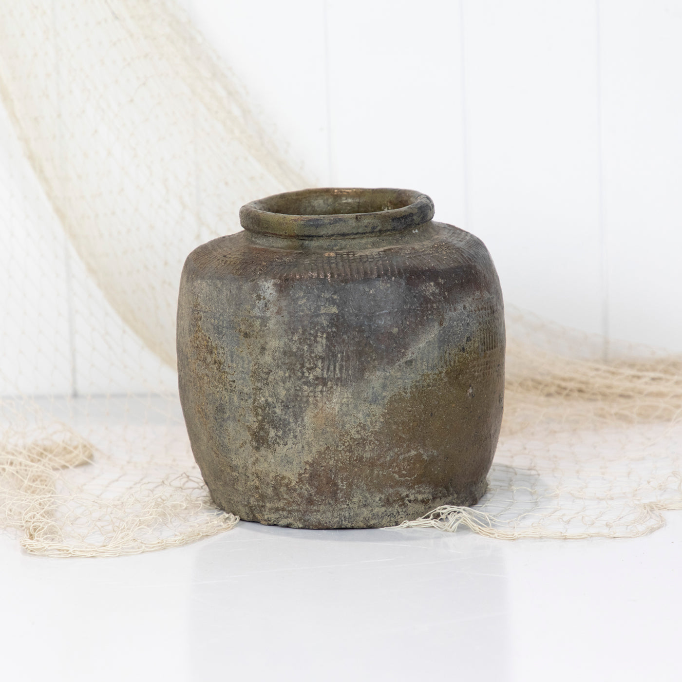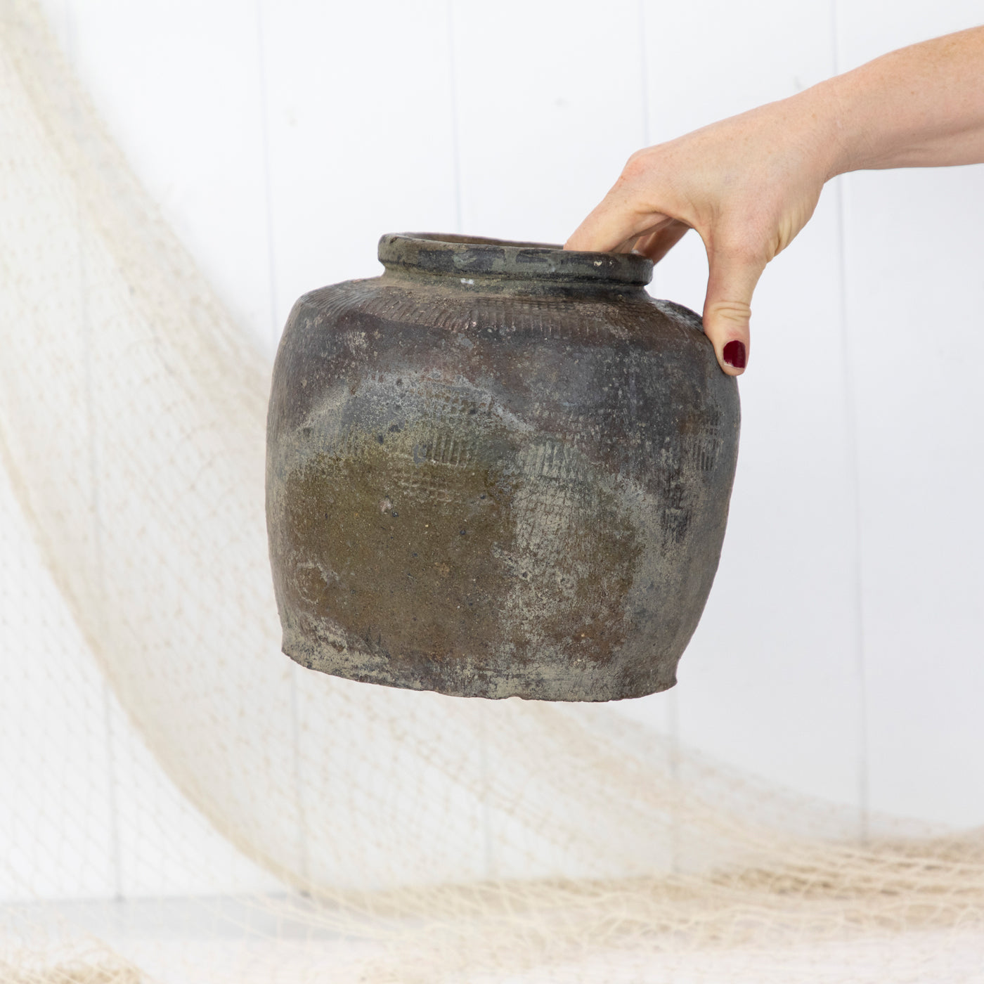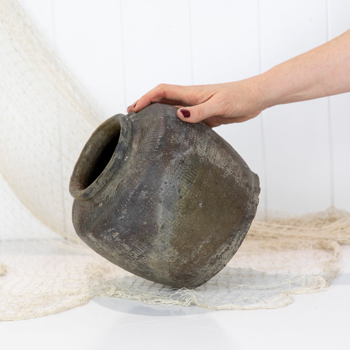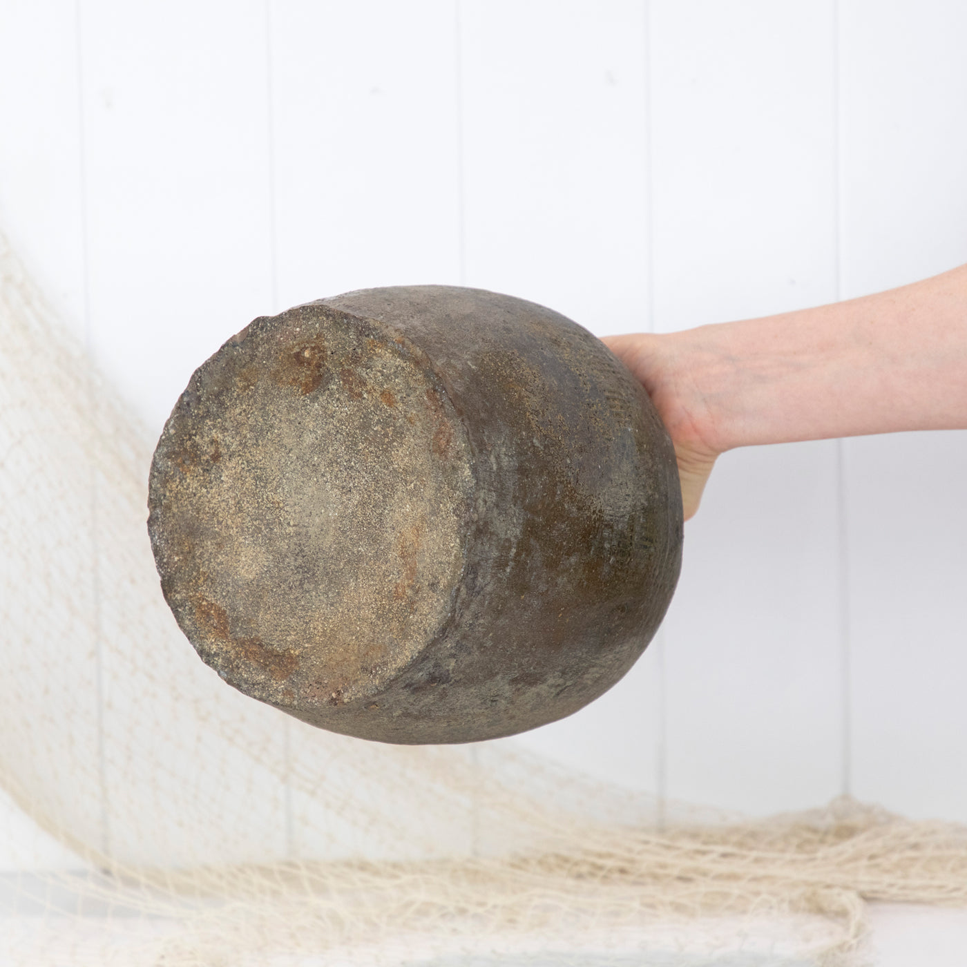 Made of a heavy clay and glazed a brownish green it would be fantastic for utensils or a floral arrangement. Or simply styled by itself!