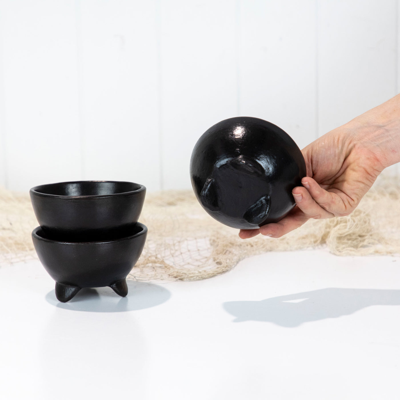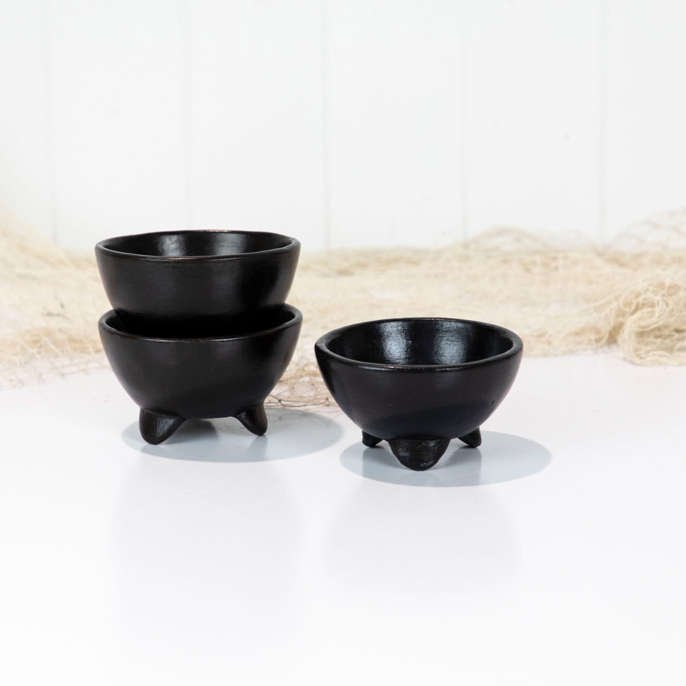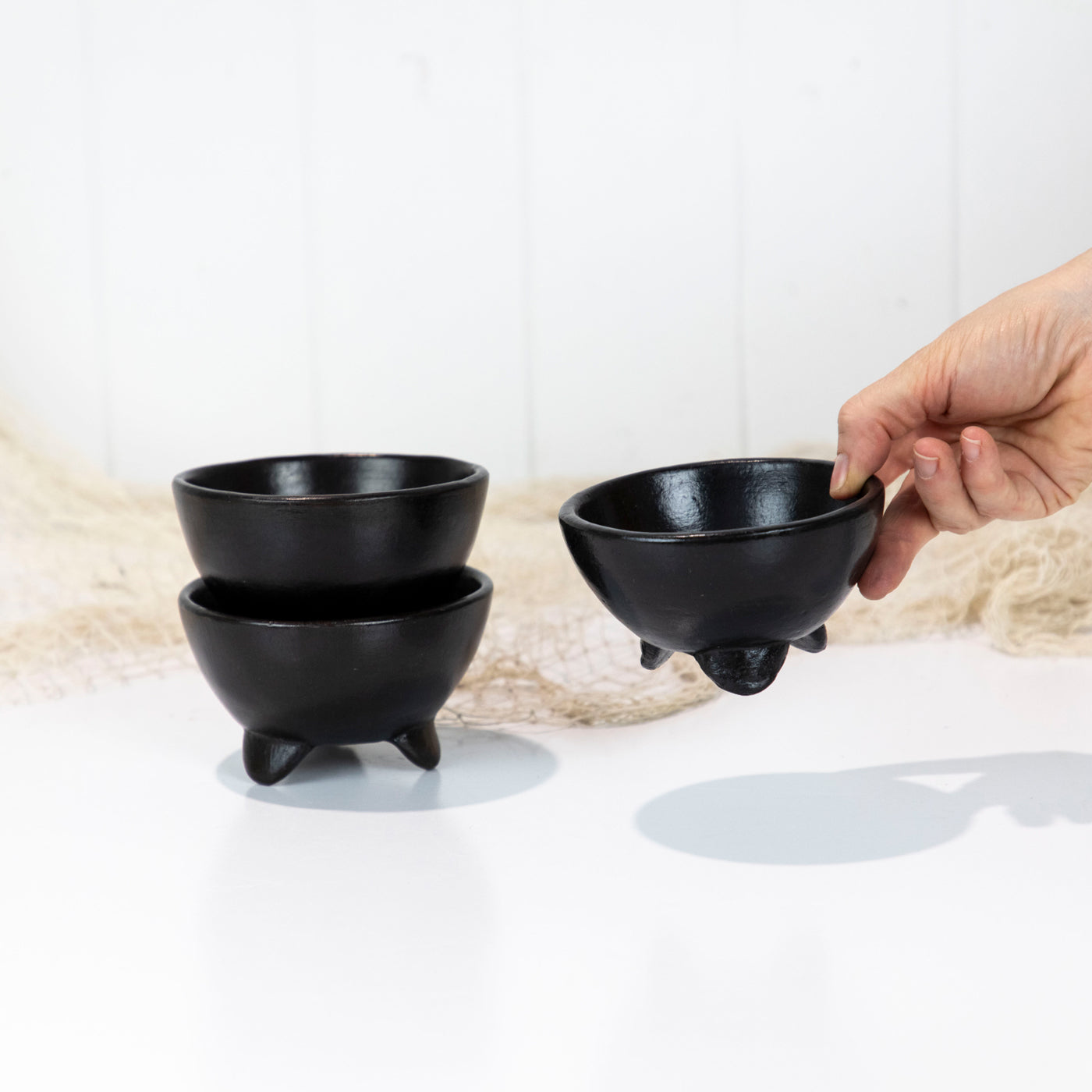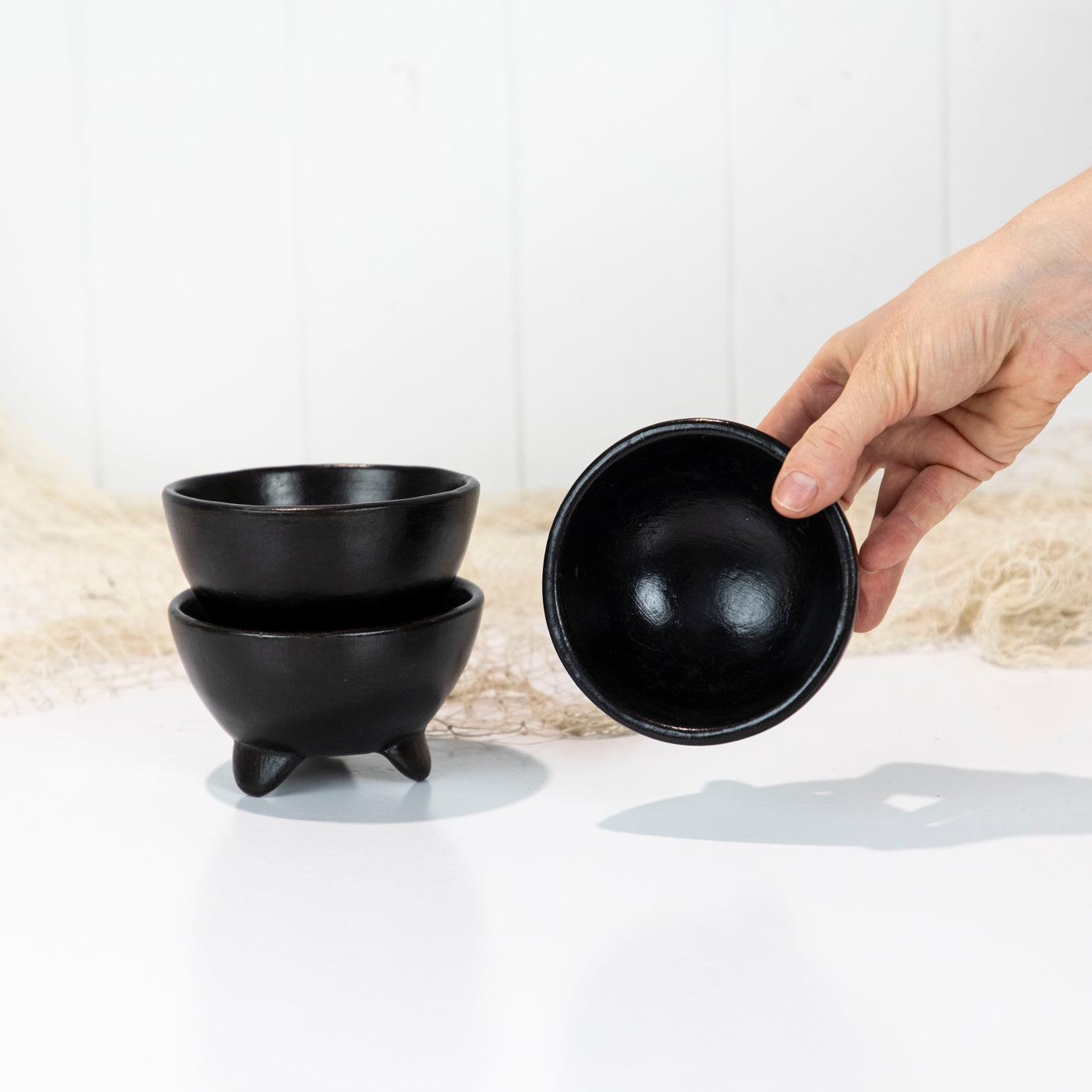 This sweet bowls are made from clay and painted black.