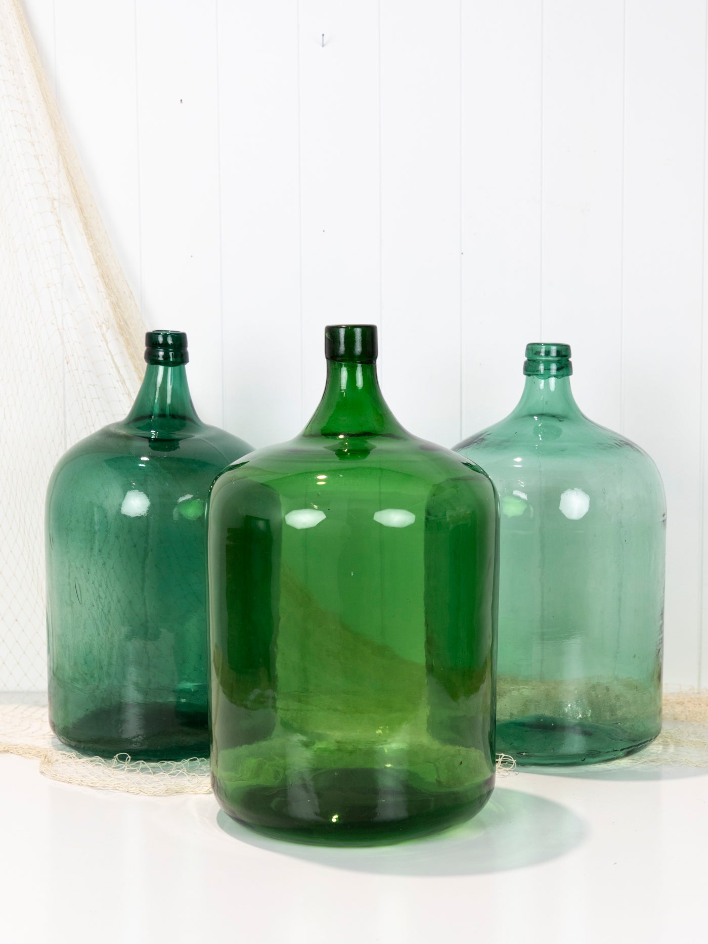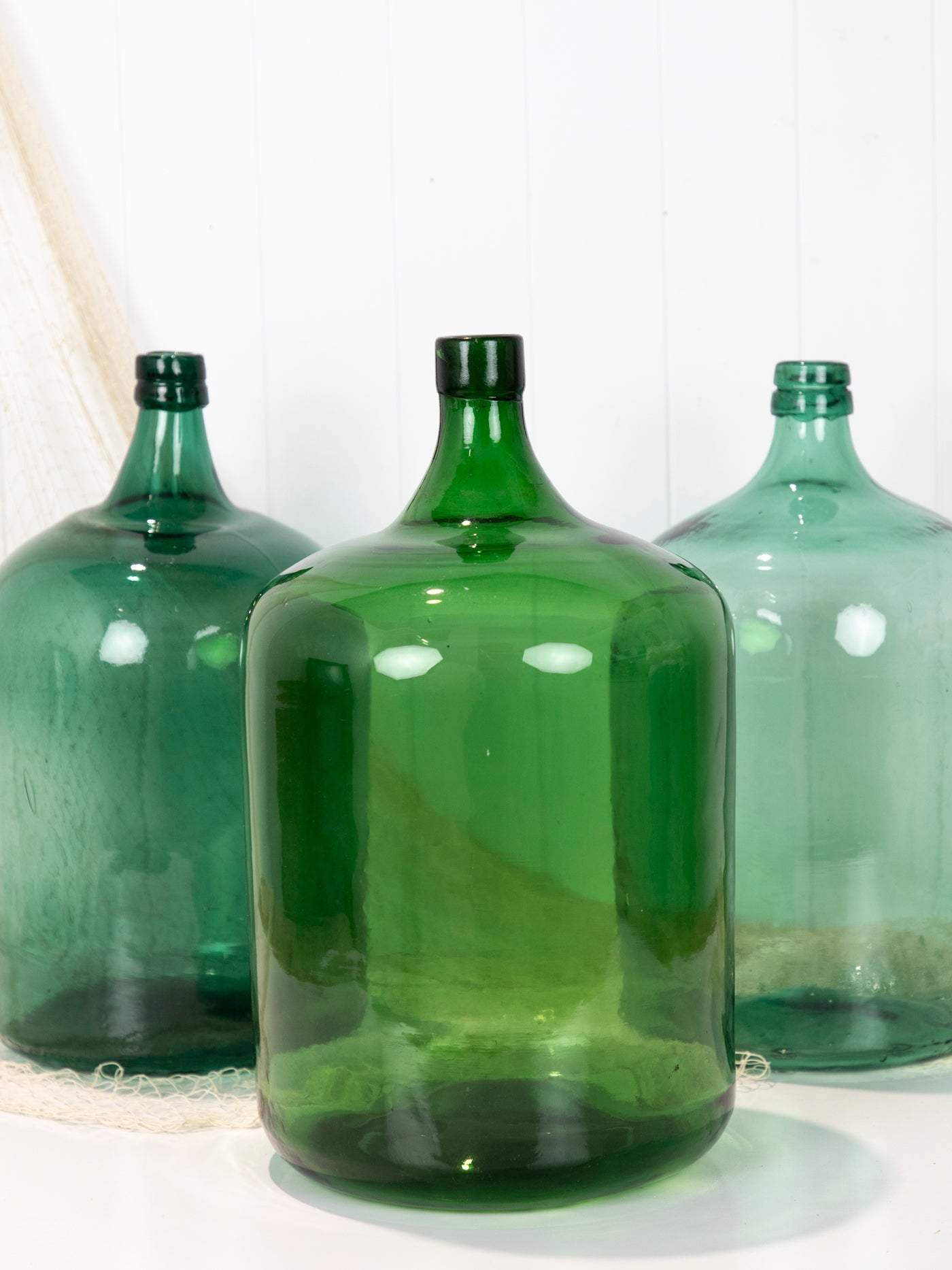 These wonderful old demijohns are in a spectrum of beautiful sea greens.