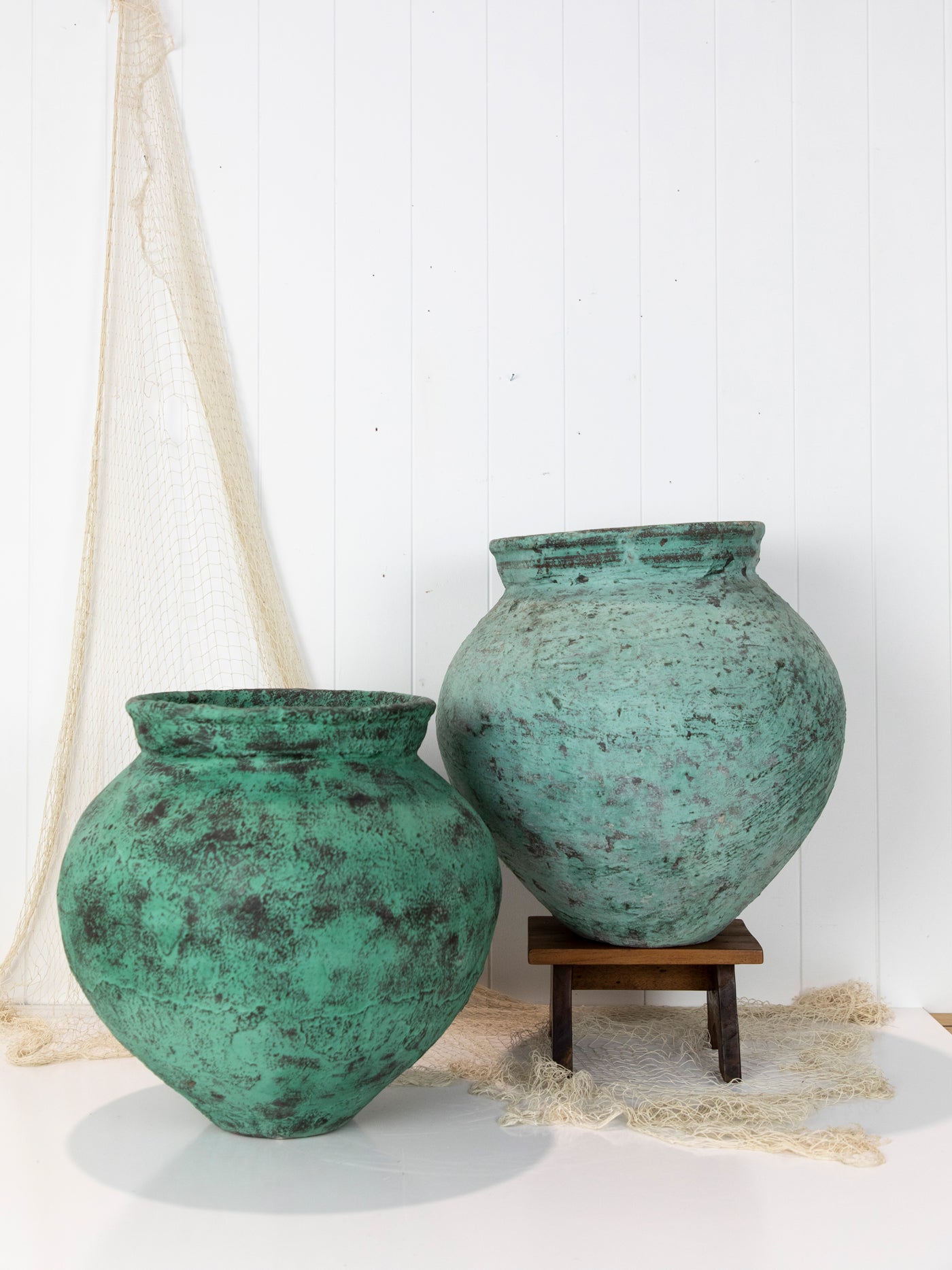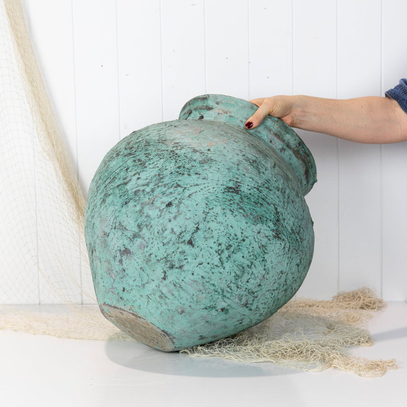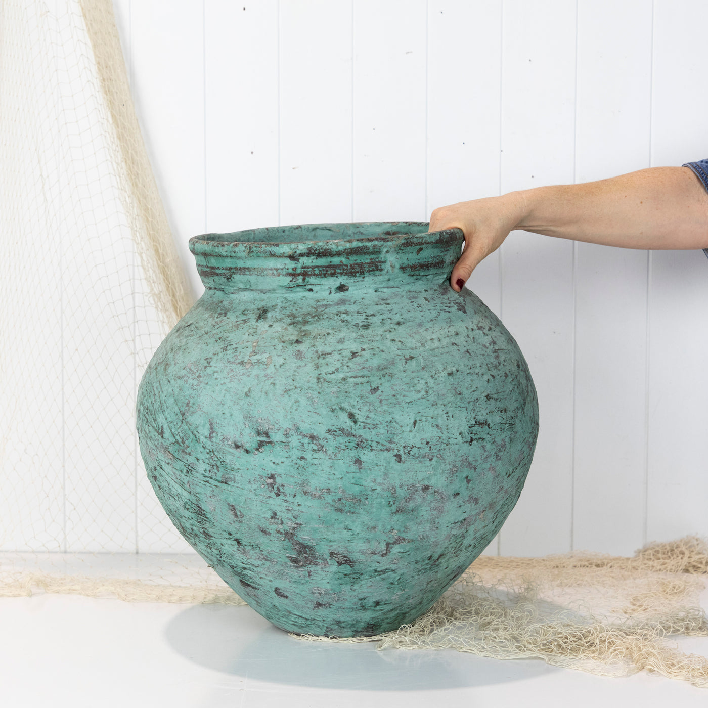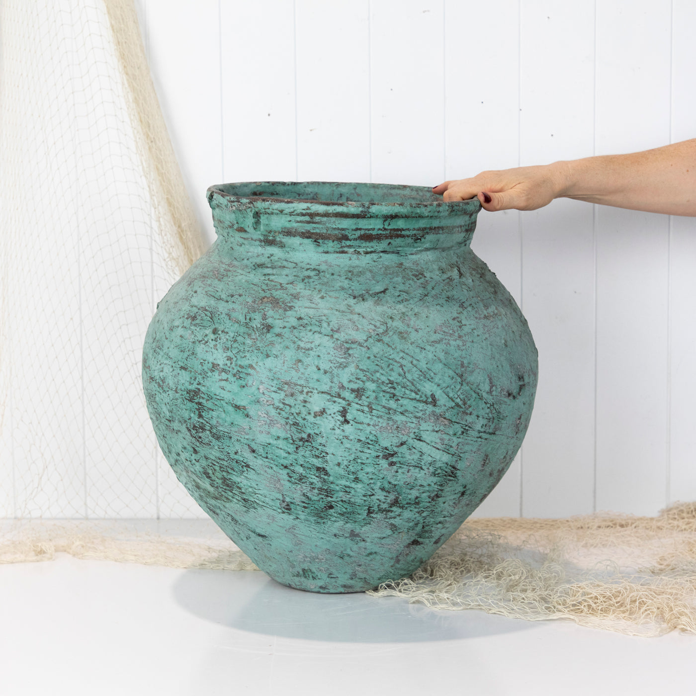 This pot was a fabulous find! Found in the back streets in Indonesia, this pot has the most beautiful green colour and texture. It would look fabulous with a potted palm or fiddle leaf. A stunning piece.