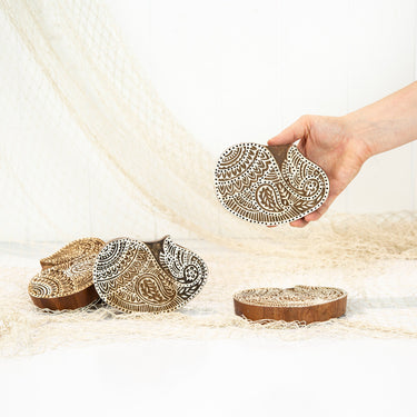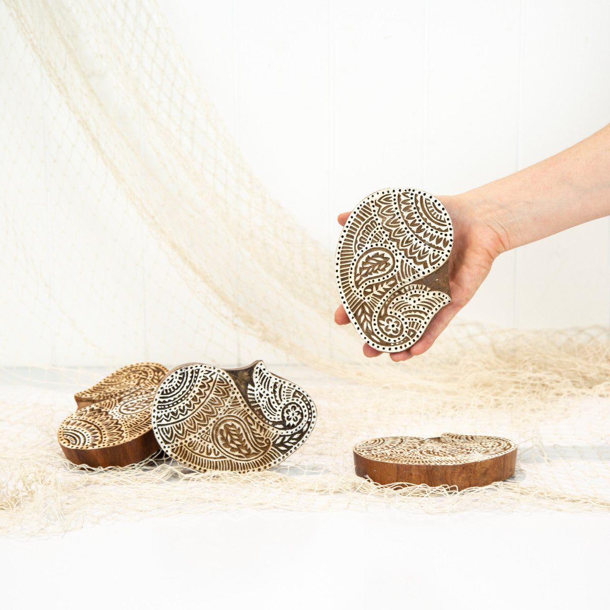 The sweet Indian printing blocks have been carved from timber, with the design highlighted in white.