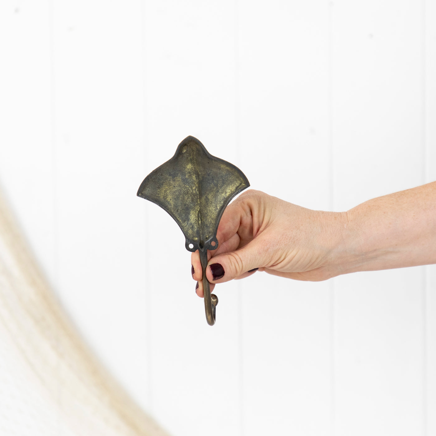 This hook is made from brass that has been given a dark, brushed finish. It features a beautiful mantaray.