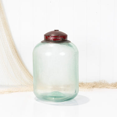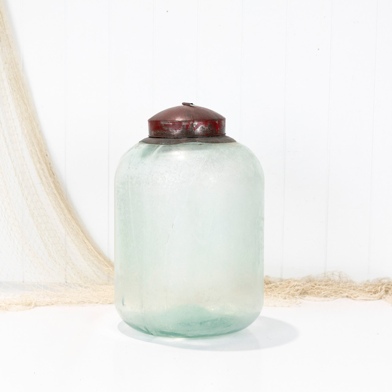 The old glass is frosted, and the lid is made from metal that has been painted red.