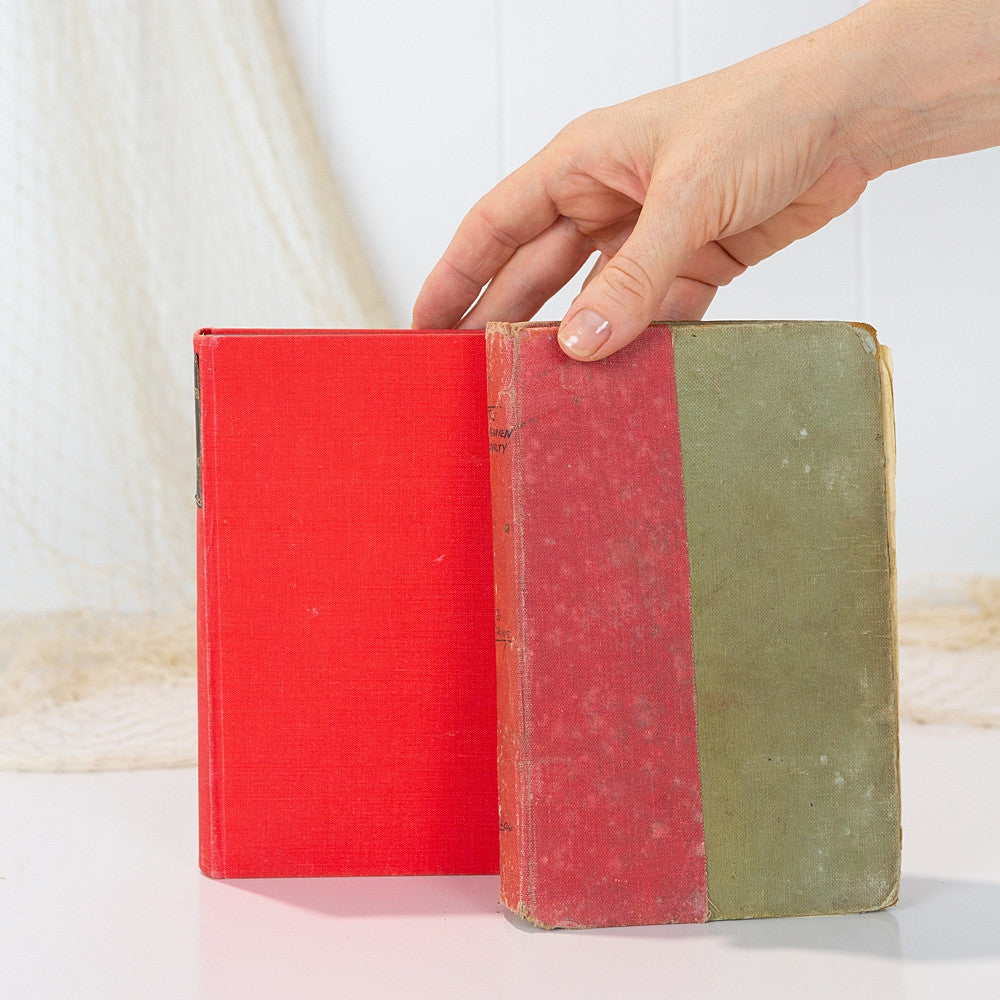 The title 'I believe' has a vibrant red cover. The other 'Unshaken Loyalty' has bee repaired with red binding over the top of a pale green cover.
