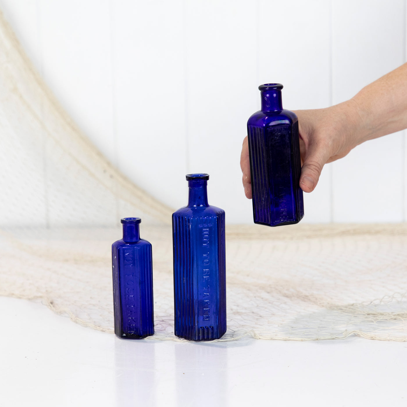 This set of three poison bottles are a fabulous vibrant cobalt blue. This colour is becoming increasingly rare to find!