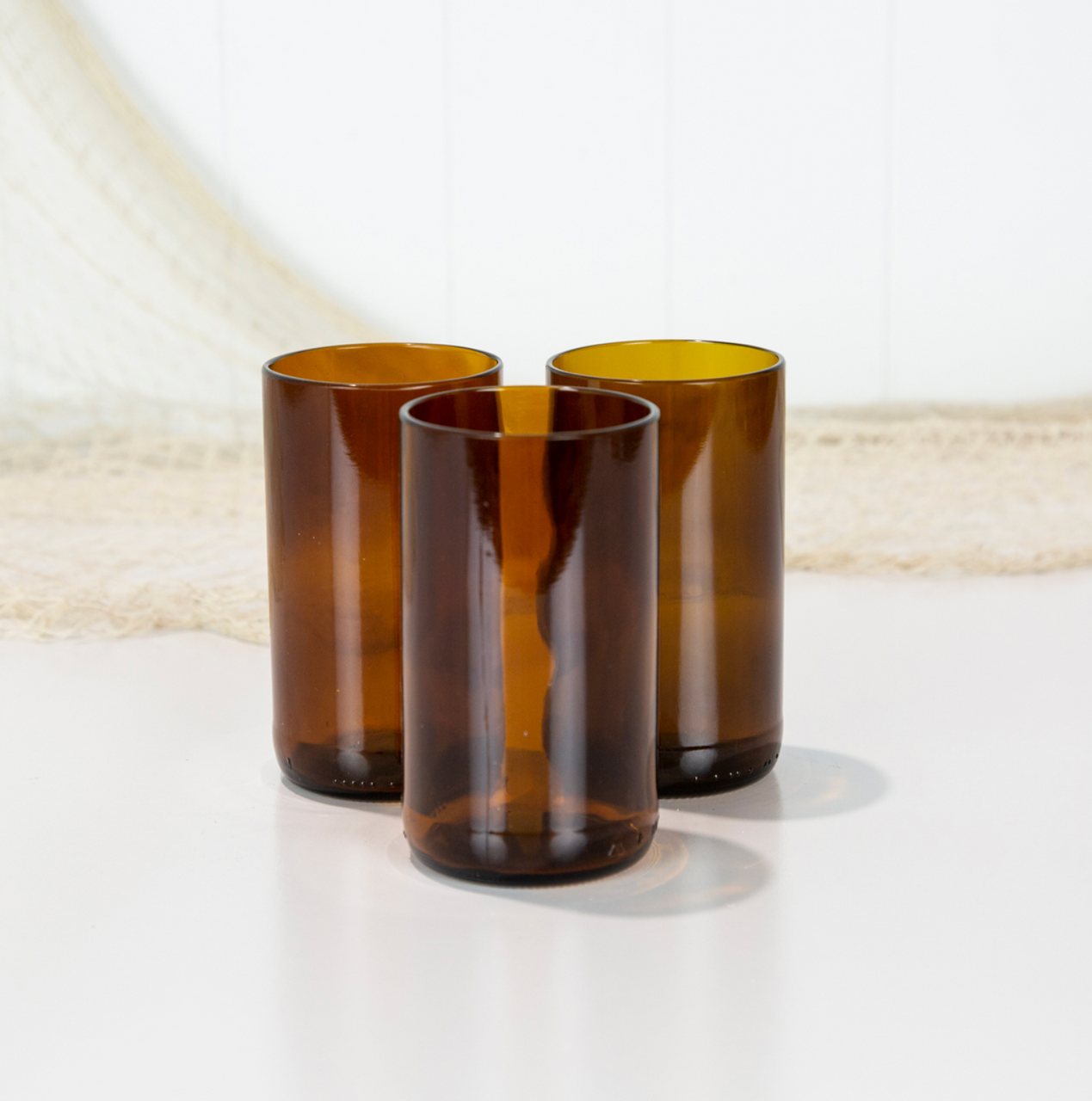 These amber glasses have been made with recycled bottles by the Bali Street Mums.