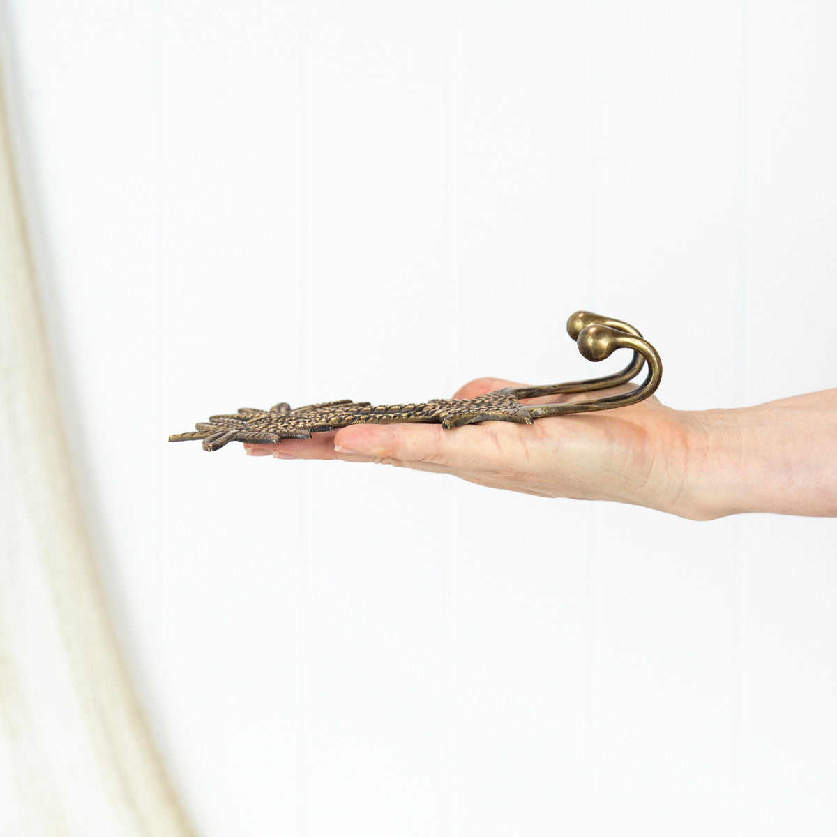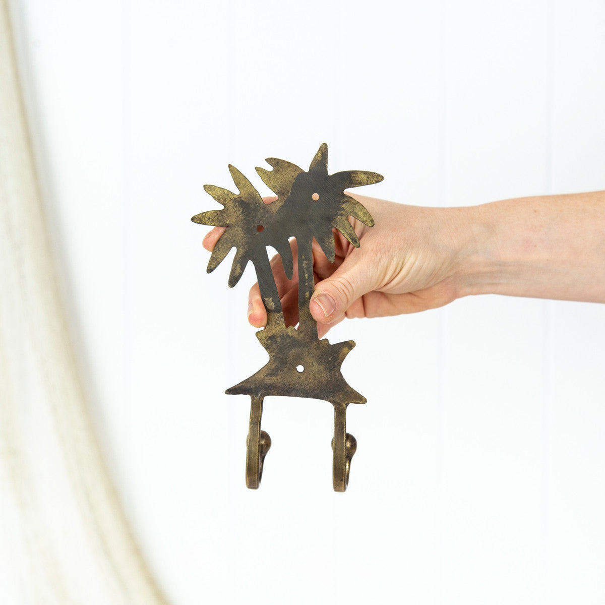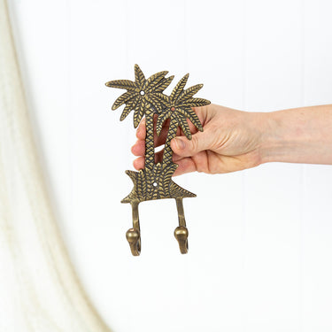 This hook is made from brass that has been aged to a dark finish. It has two palm trees, and two hooks.