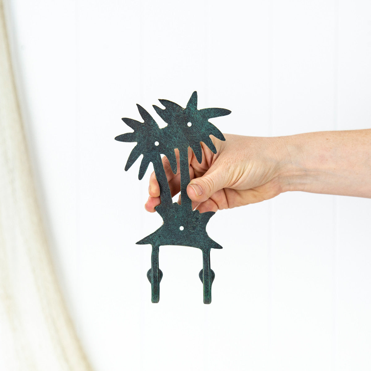 This hook is made from brass that has been aged and given a hint of green patina. It has two palm trees, and two hooks.